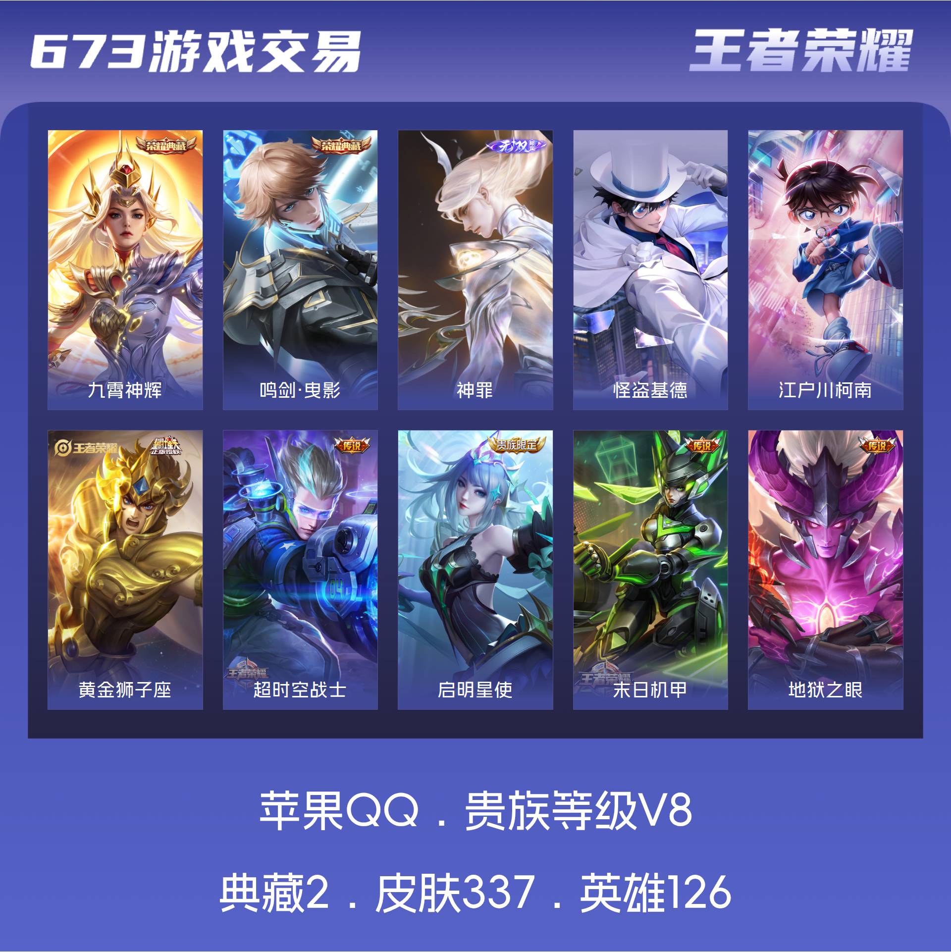 【W4710】苹果Q区-可二次-贵8-126英雄-337皮肤-2典藏-1无双-2珍品传说-18传说-2星元-11按键-鸣剑·曳影/九霄神辉/神罪/怪盗基德/江户川柯南/至尊宝/愿照·九州拓/愿照·山河定/九山相柳/琥珀纪元/异界灵契/一念神魔/永曜之星/末日机甲/万灵启示/巫礼祀神-贵族积分6.7W-营地ID:1860479540