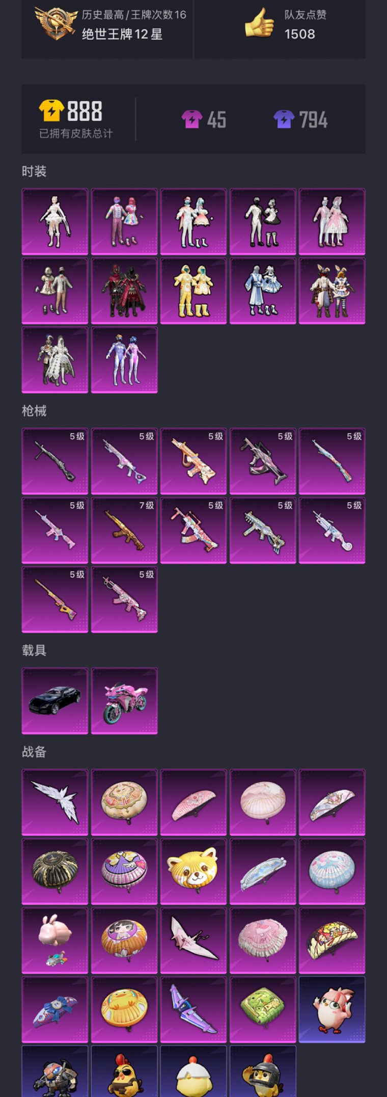 614-【梦幻火箭12粉装12特效枪2载具1僚机素材号、秒换绑不用等】、苹果Q区-81185热力值-16印记-169套装-248枪皮、【3载具】、玛莎拉蒂Q蓝色、双人摩托梦幻火箭、萌兔起飞僚机【2稀有】、M416-黄金龙骨、AWM-黄金龙骨【12粉装】、梦幻火箭、宝贝奶油派、天使彩虹糖、甜蜜誓约、童趣迷兔、冰霜白皇、傲雪凌霜、旋转彩虹、垂柳戏鸭、炙焰红王、冰川幽秘、角色-千金淑猫【12特效枪】、AKM-甜心宝贝(7级)、M762-甜蜜誓约(5级)、AWM-花间之火(5级)、UMP45-相思残雪(