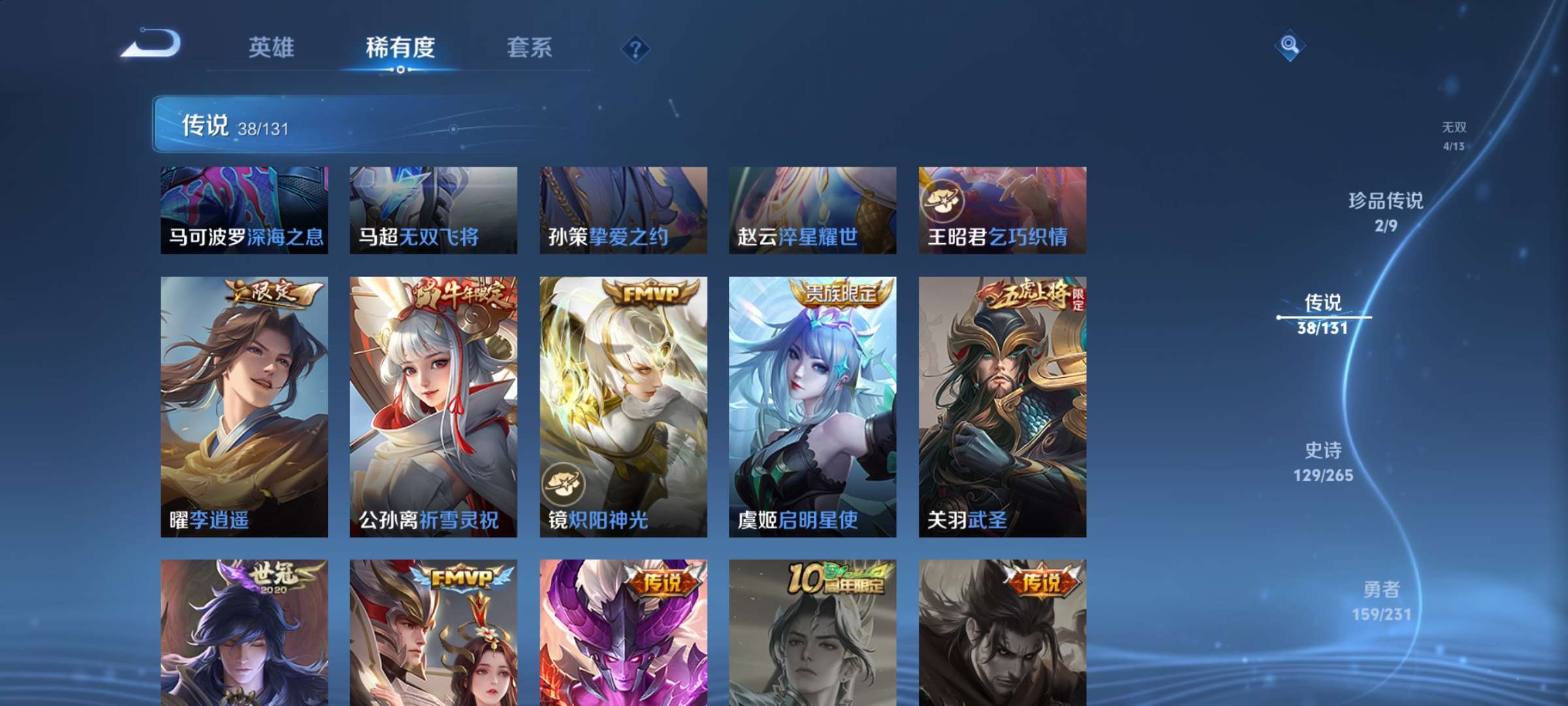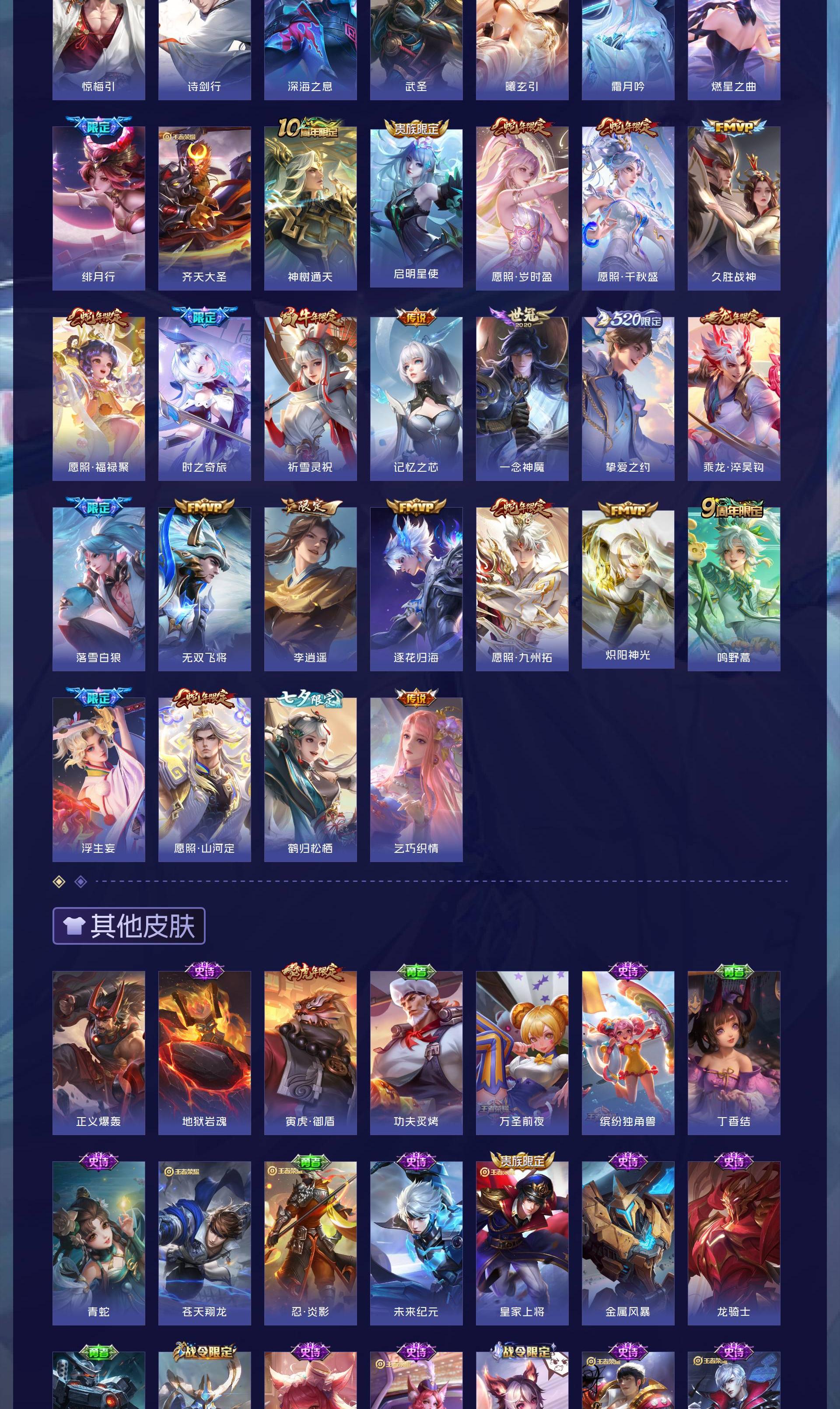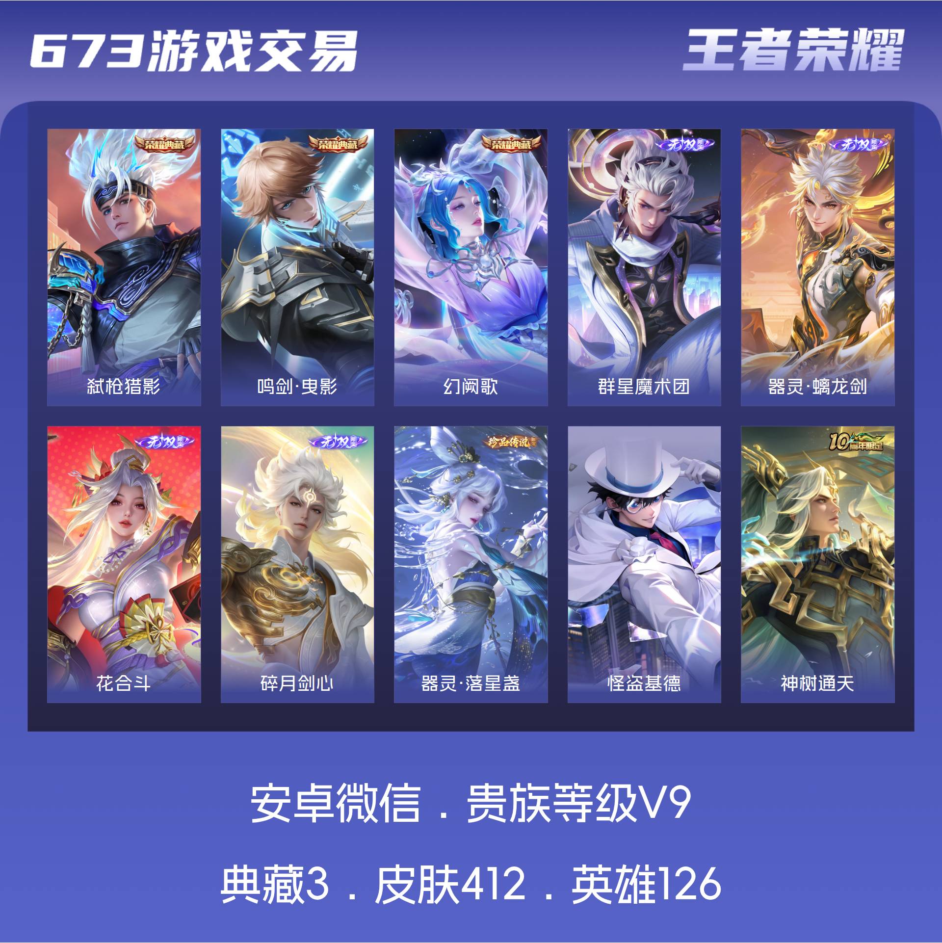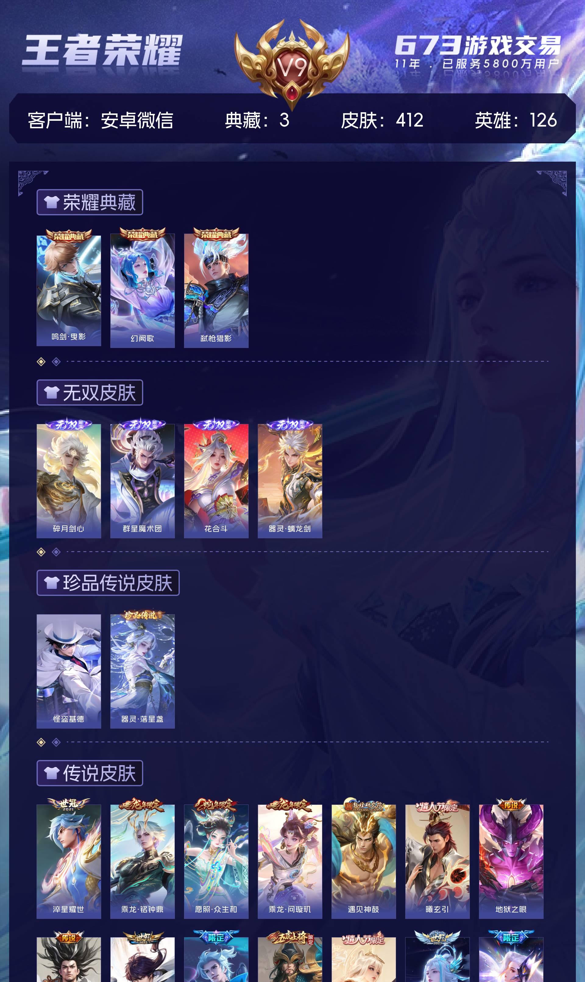 皮肤412 英雄126 荣耀王者 荣耀典藏3 无双皮肤4 珍品传说2 传说39 其他皮肤371-王者V9三典藏便宜出了可以二次