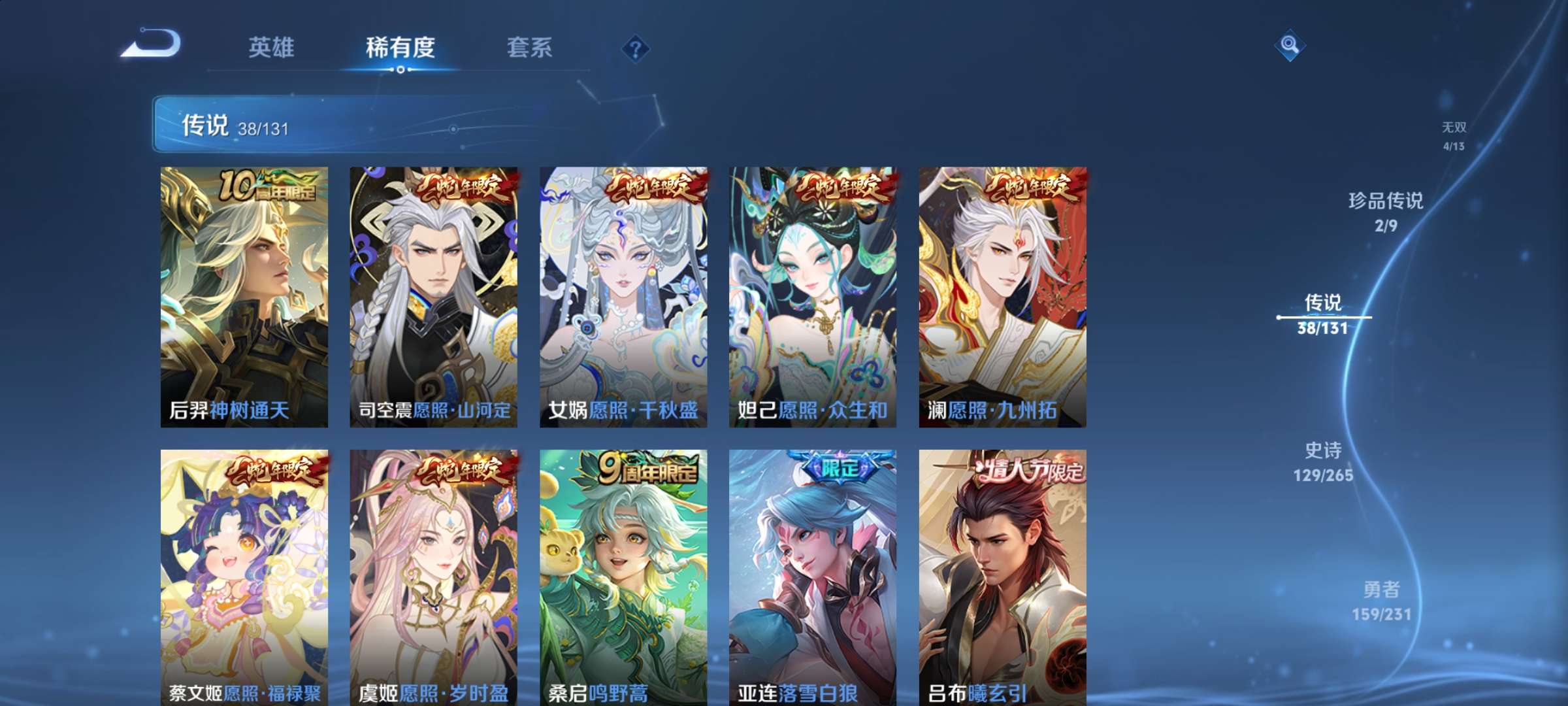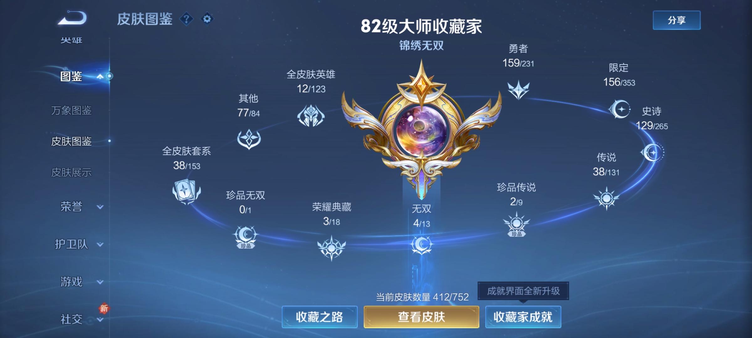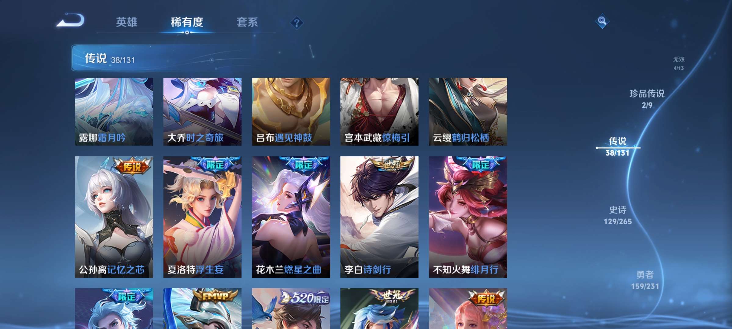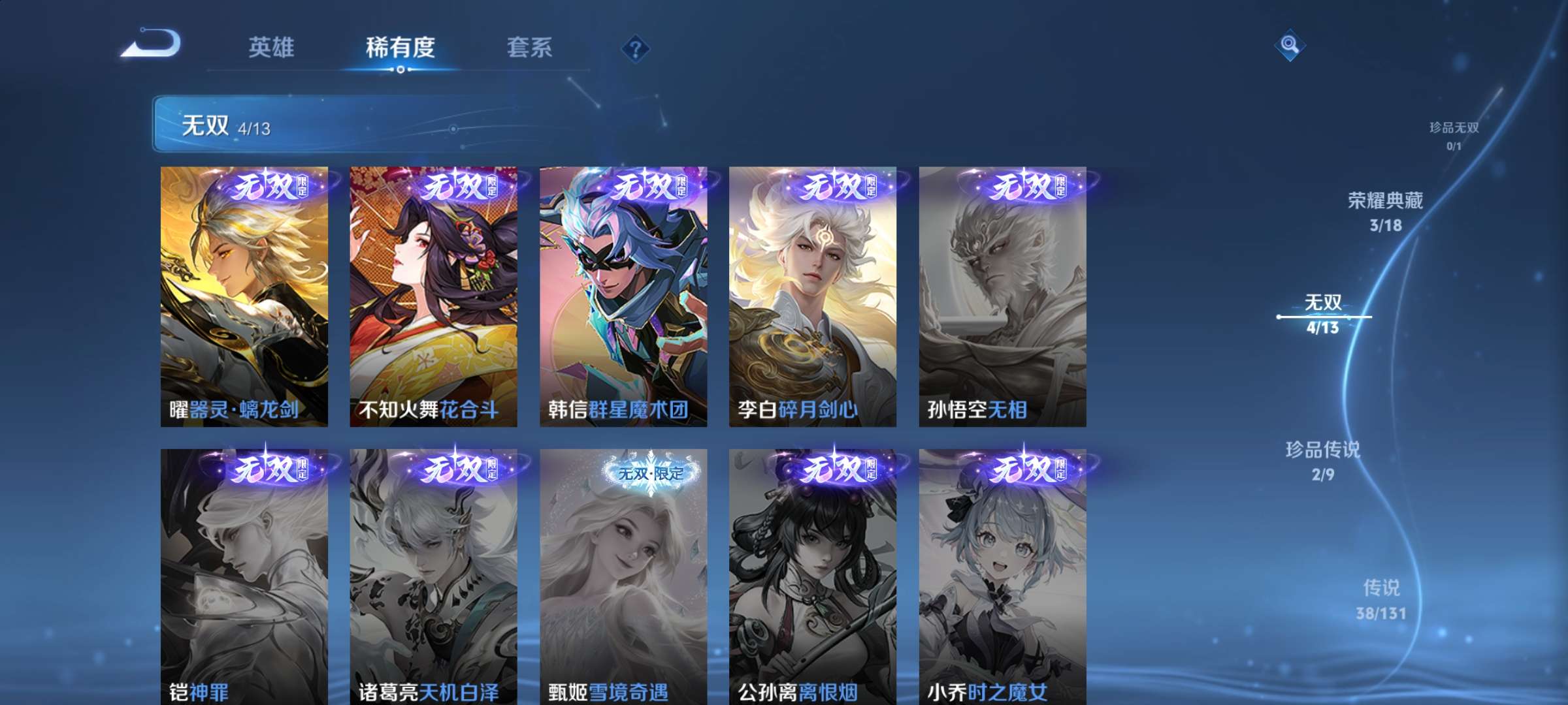 皮肤412 英雄126 荣耀王者 荣耀典藏3 无双皮肤4 珍品传说2 传说39 其他皮肤371-王者V9三典藏便宜出了可以二次