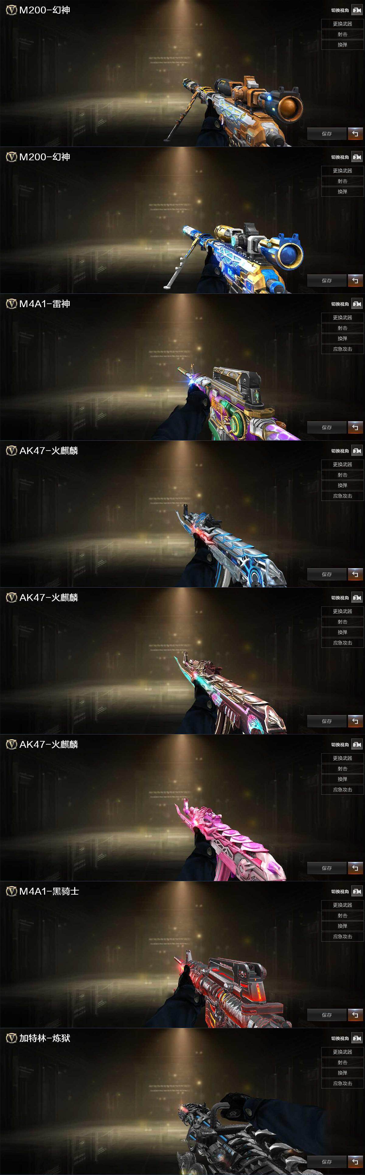 【皮肤】:M200-幻神-黄忠皮肤,幻神-冠军之幻,M4A1-雷神-巅峰荣耀皮肤,火麒麟-雷神,火麒麟-百城,火