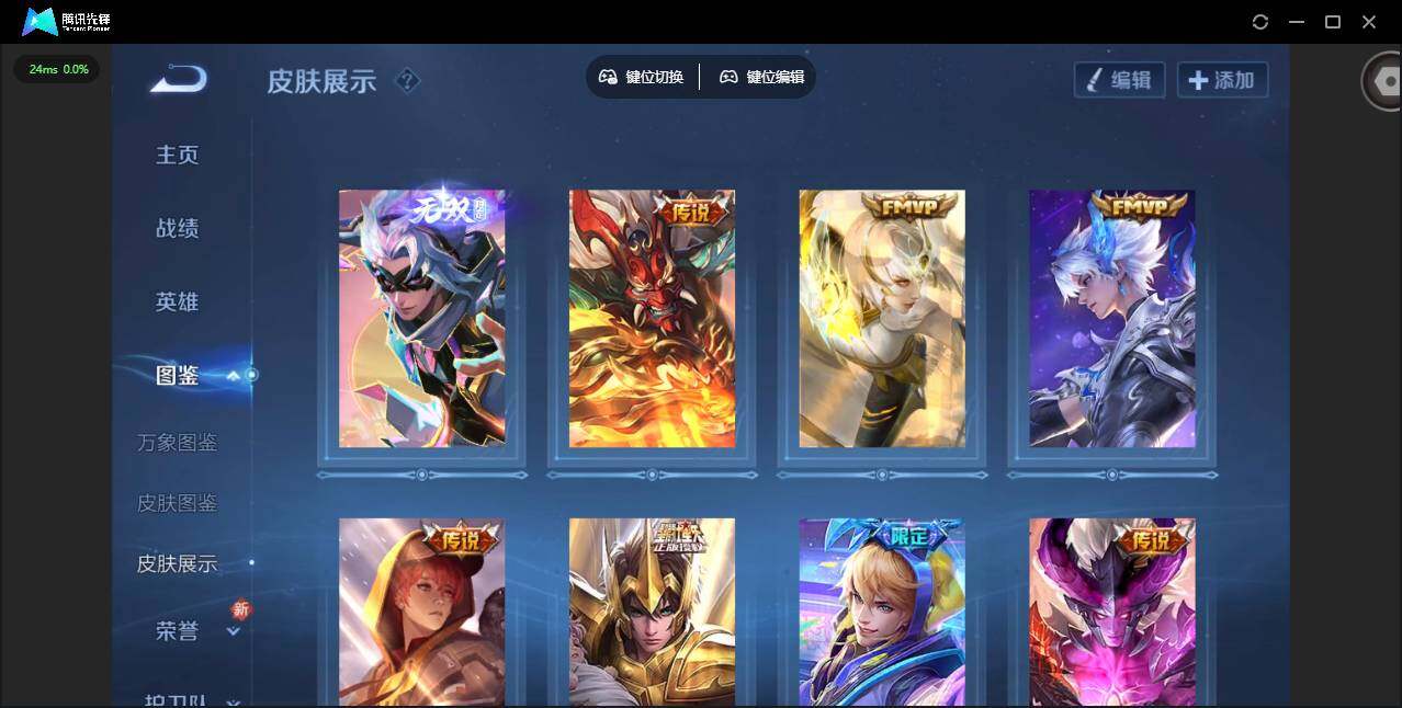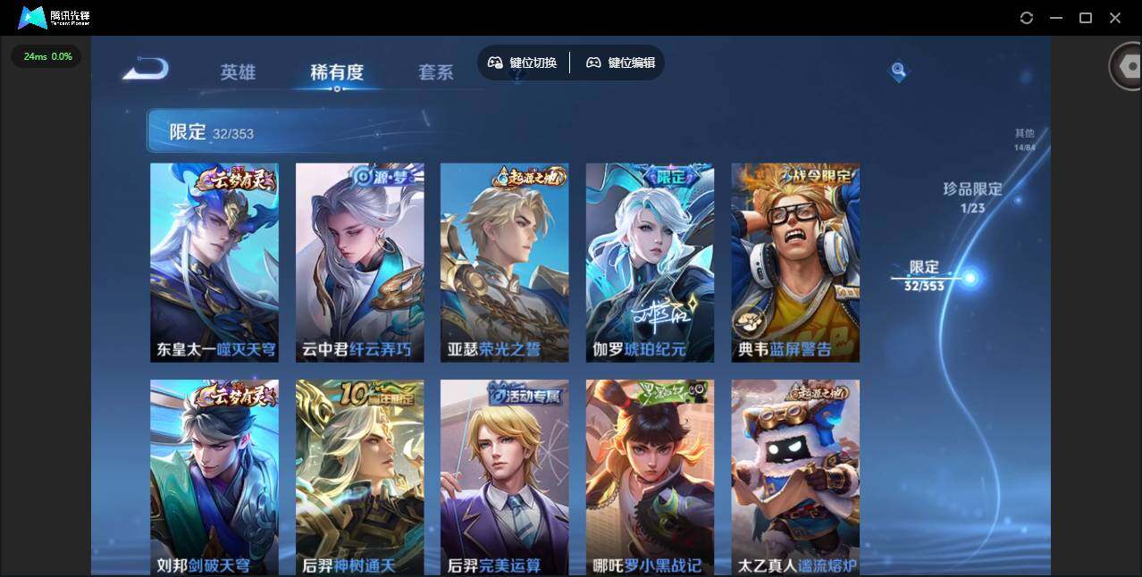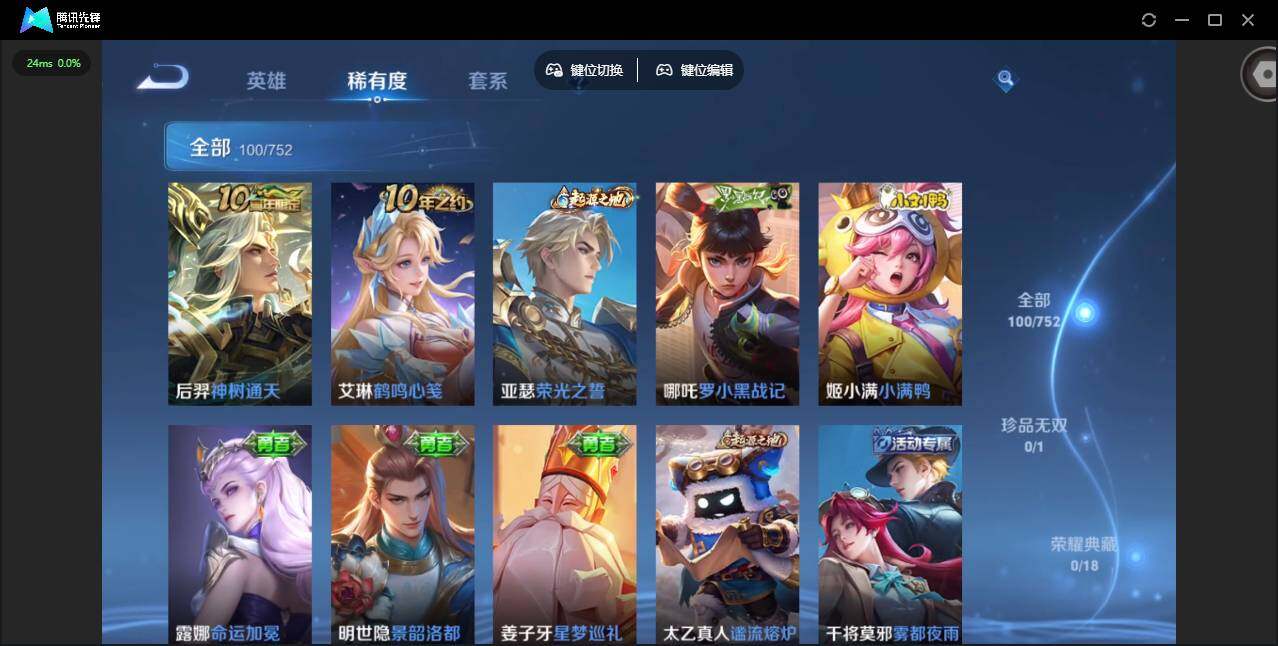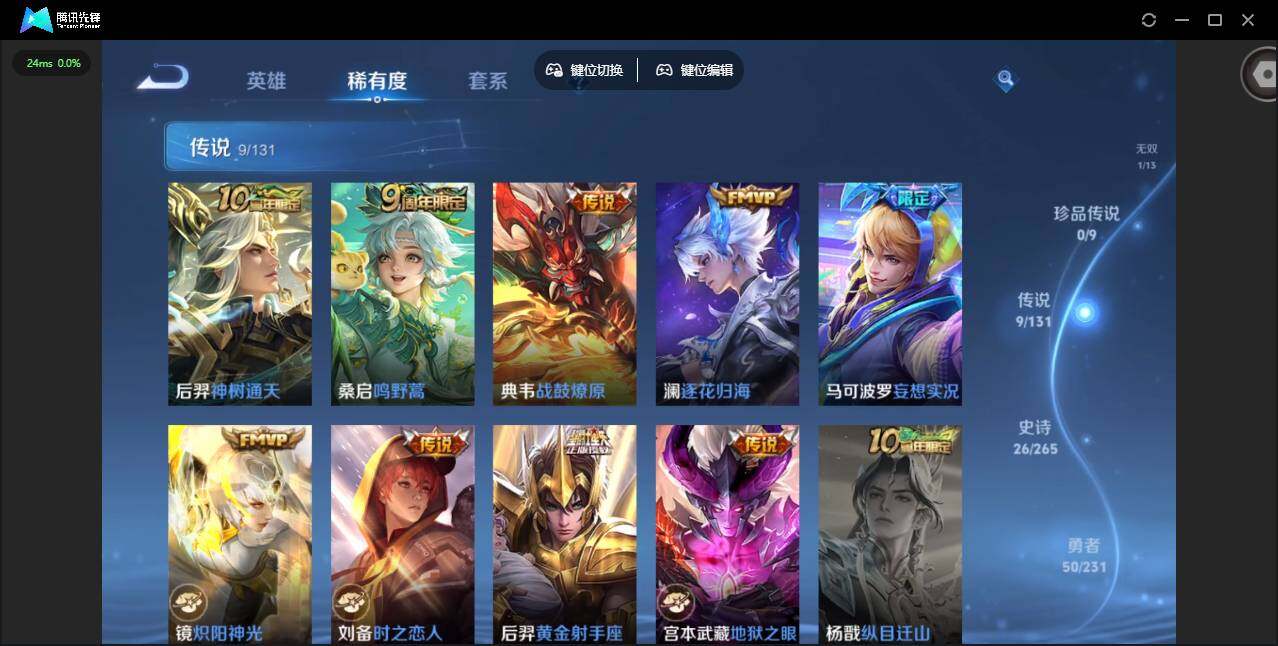 贵族等级: V6 英雄数: 125 皮肤数: 100 无双皮: 韩信群星魔术团 传说皮: 黄金射手座,炽阳神光,地狱之眼,时之恋人-刘备,妄想实况,澜逐花归海,典韦战鼓燎原,神树通天 限定皮: 李小龙,鸣野蒿