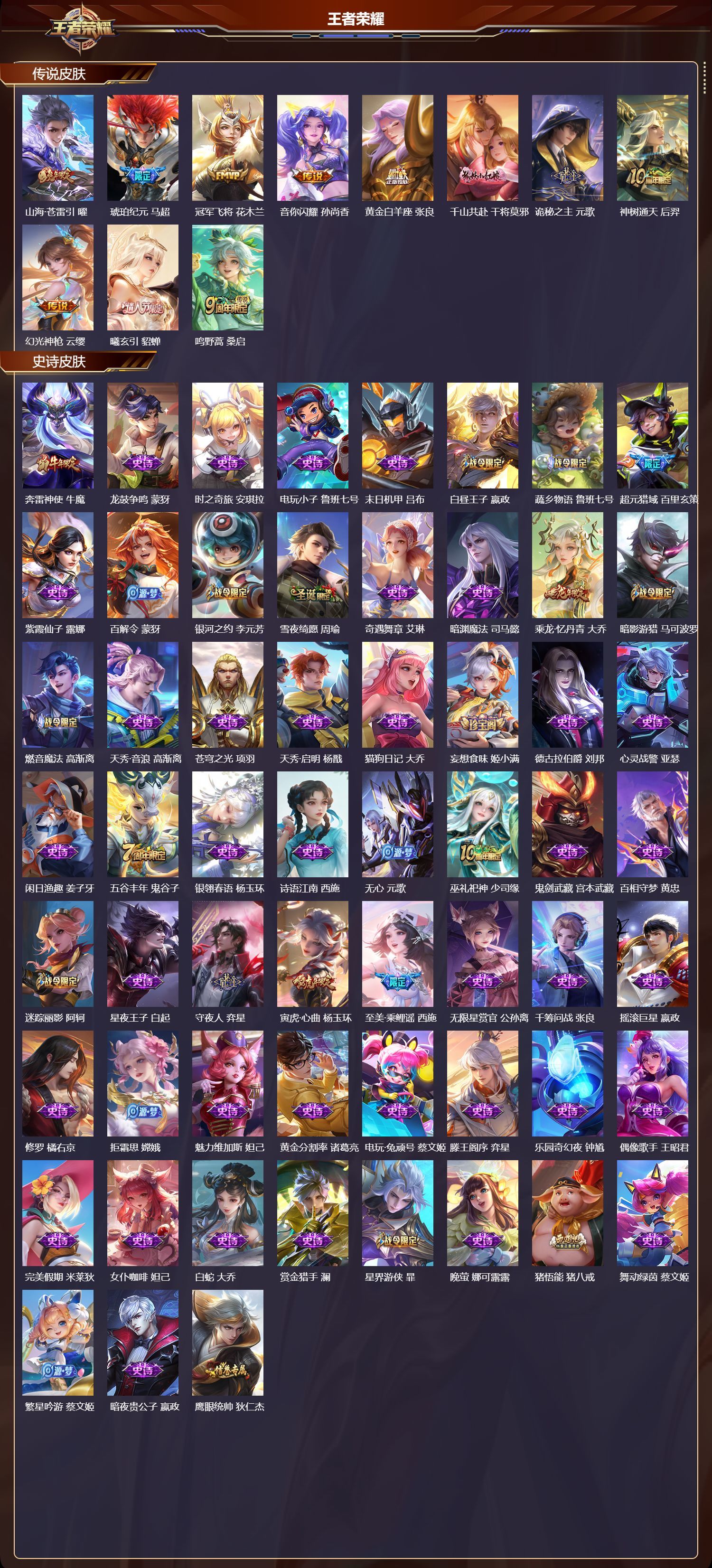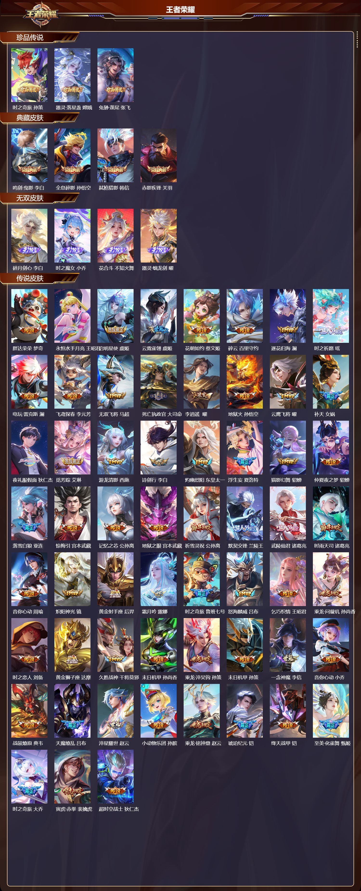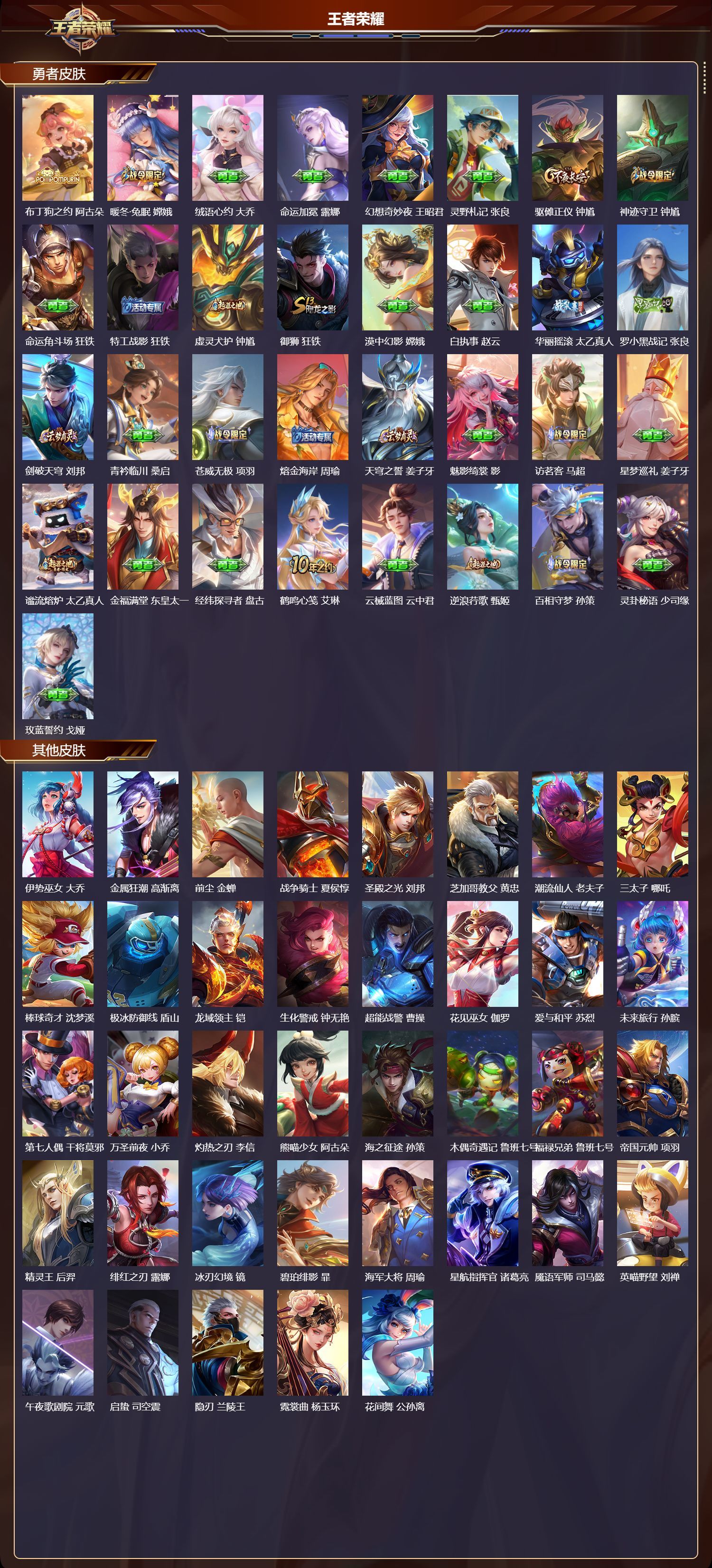 安卓QQ/荣耀王者/461皮肤/127英雄/4典藏/0珍品无双/4无双/3珍品传说/70传说/154
