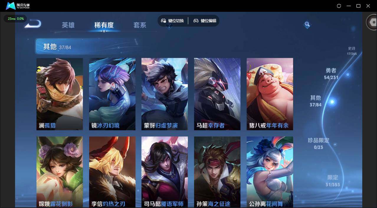 实名: 可修改 贵族等级: V6 英雄数: 107 皮肤数: 108 限定皮: