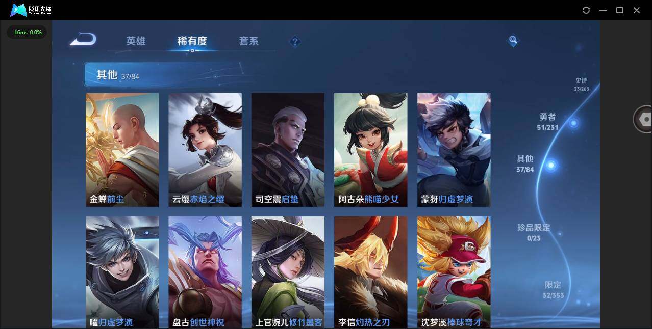 实名: 可修改 贵族等级: V7 英雄数: 113 皮肤数: 115 传说皮: 黄金狮子座,一念神魔,地狱火,零号·赤焰 限定皮: 李小龙,飞衡,大圣娶亲
