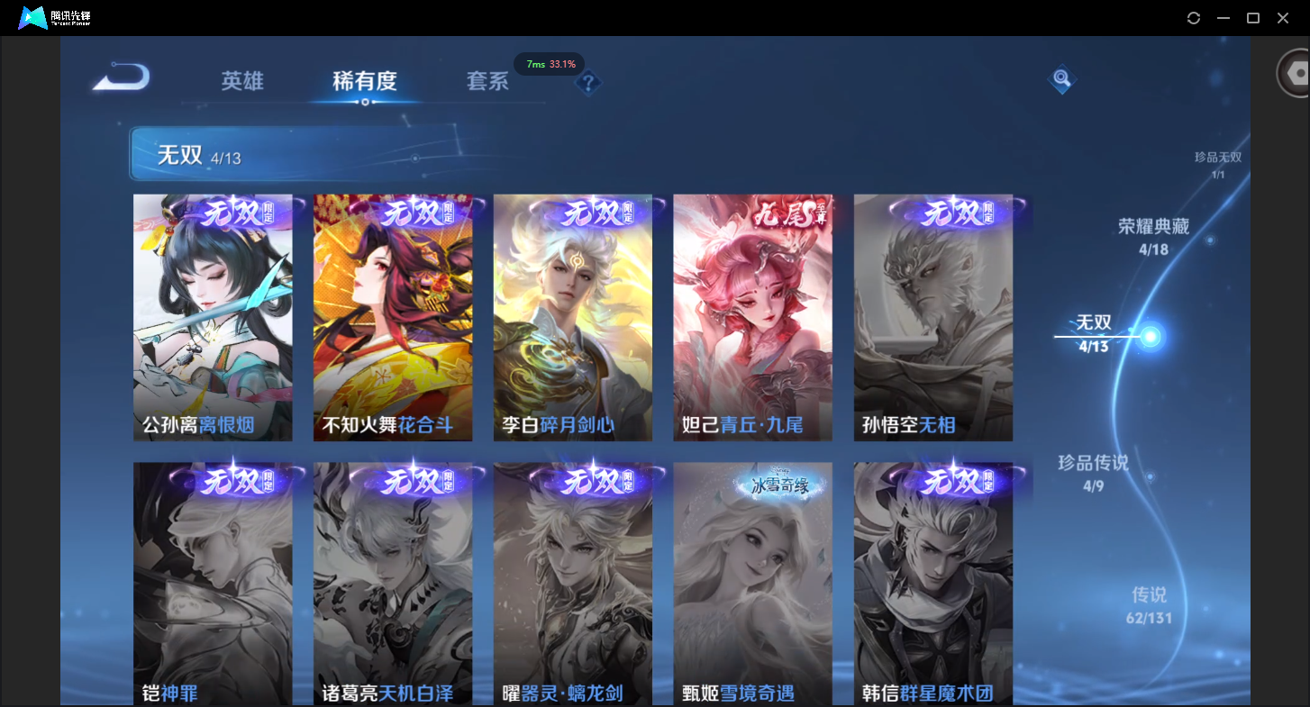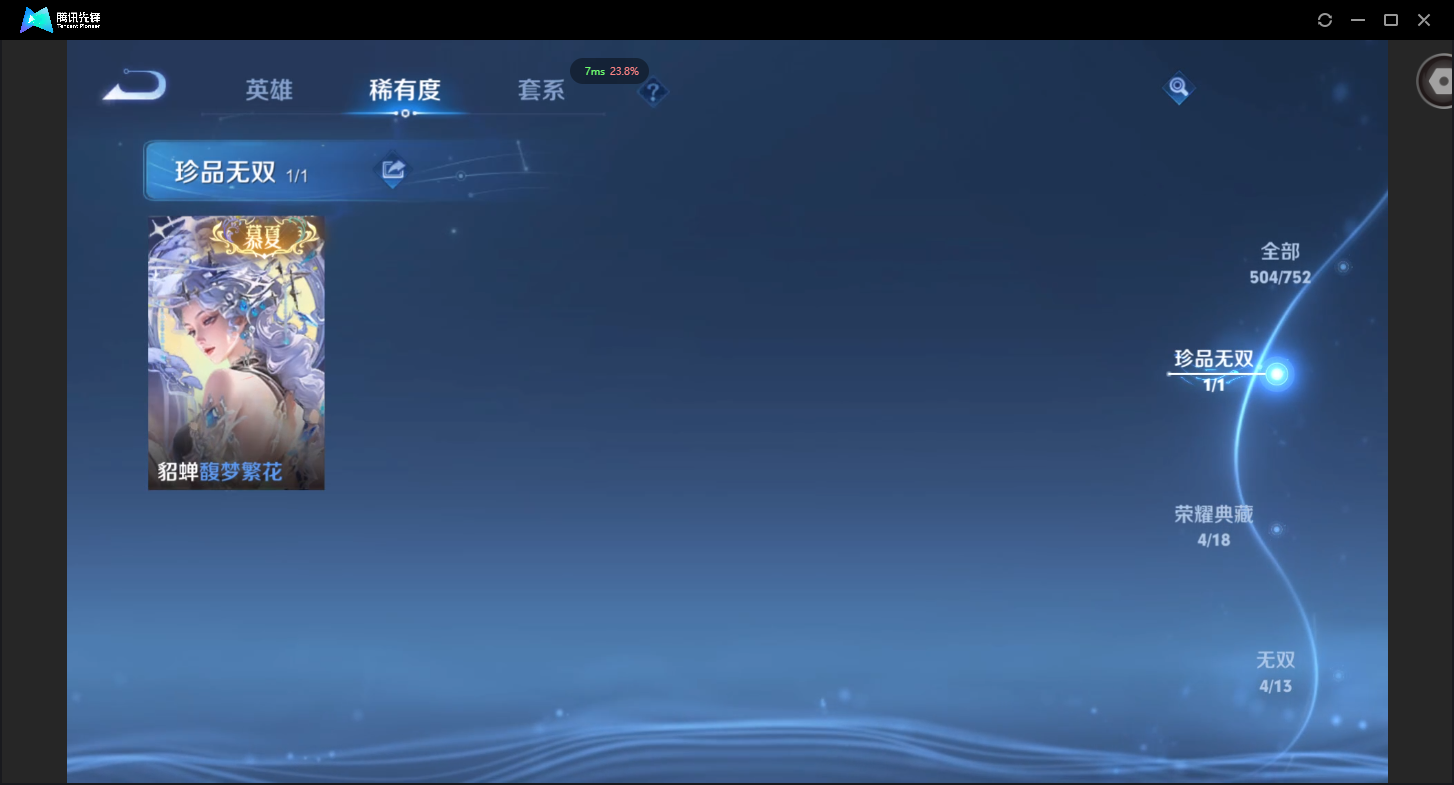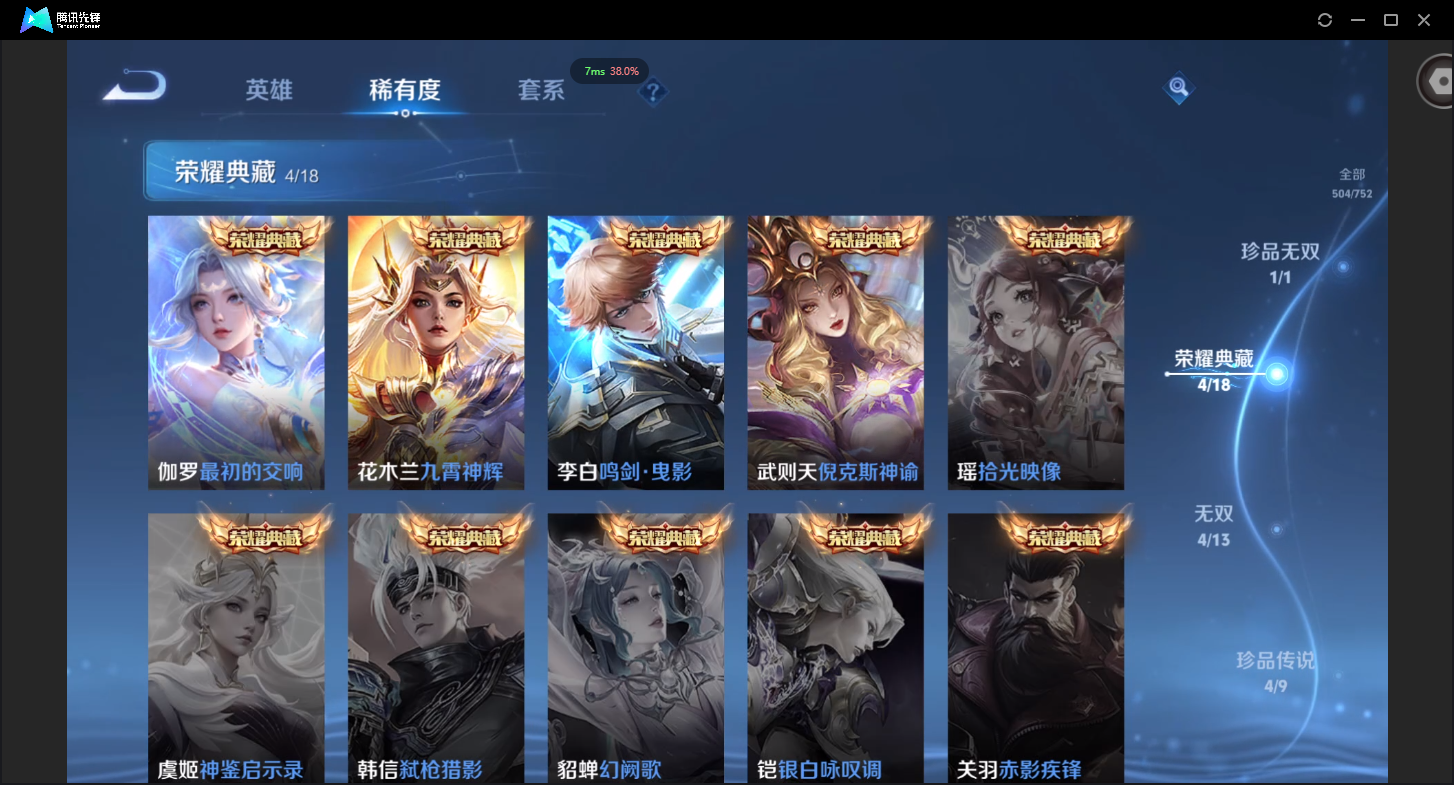 可二次-V10-504皮肤-1珍品无双-4典藏-4无双-4珍品传说-5星元-62传说-162史诗有至尊宝-19个性按键-贵族流光积分30529