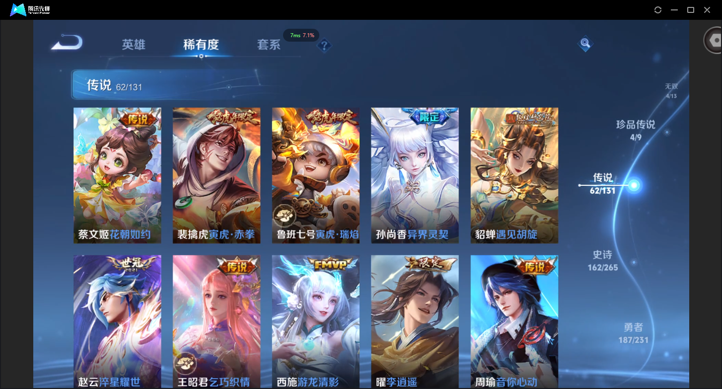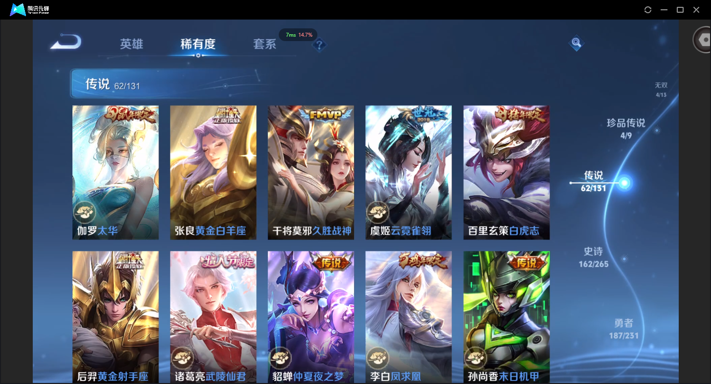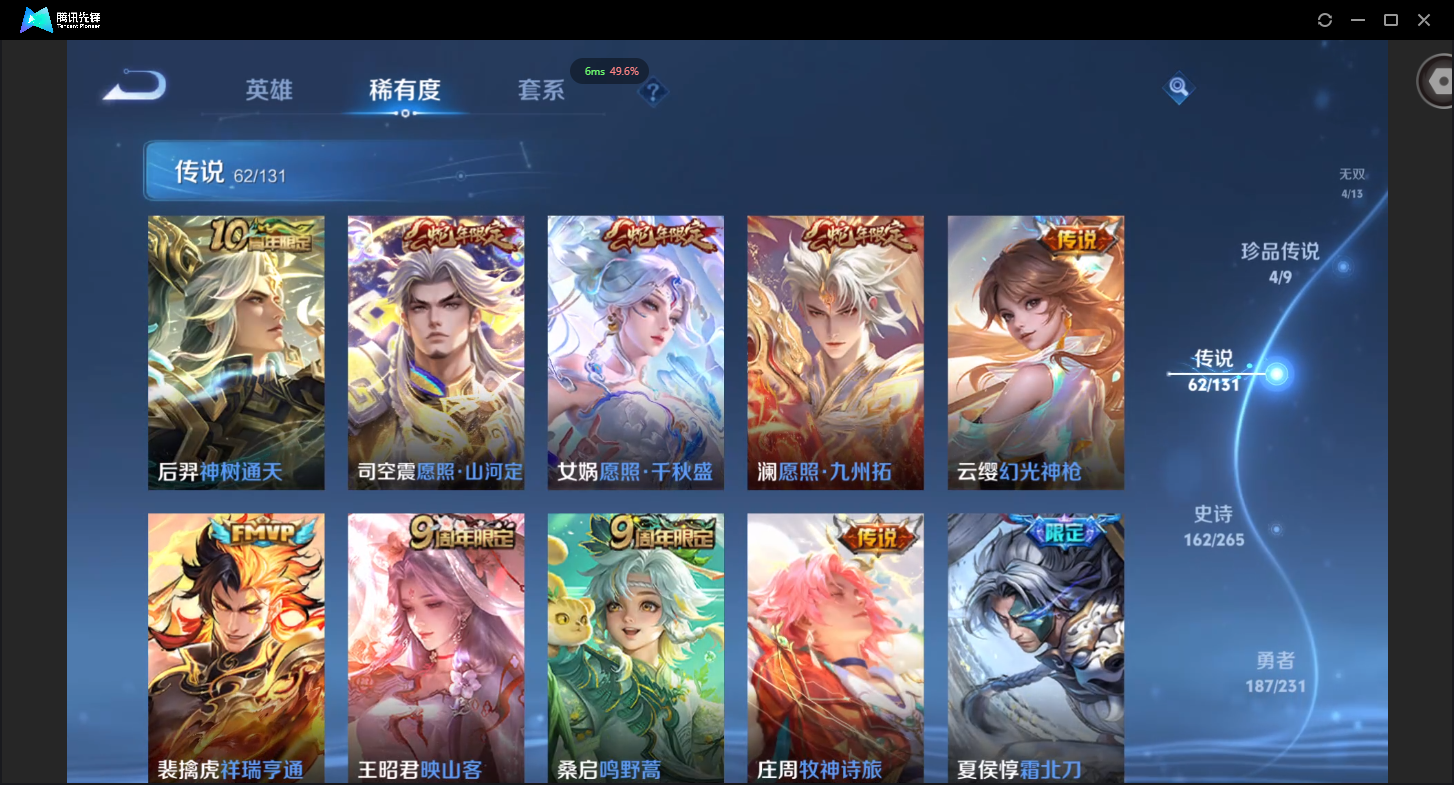 可二次-V10-504皮肤-1珍品无双-4典藏-4无双-4珍品传说-5星元-62传说-162史诗有至尊宝-19个性按键-贵族流光积分30529
