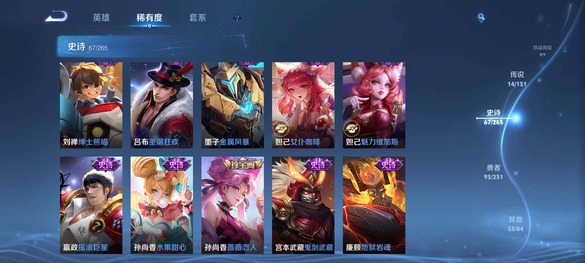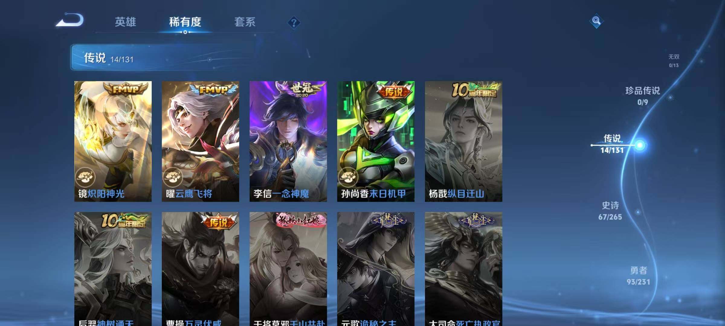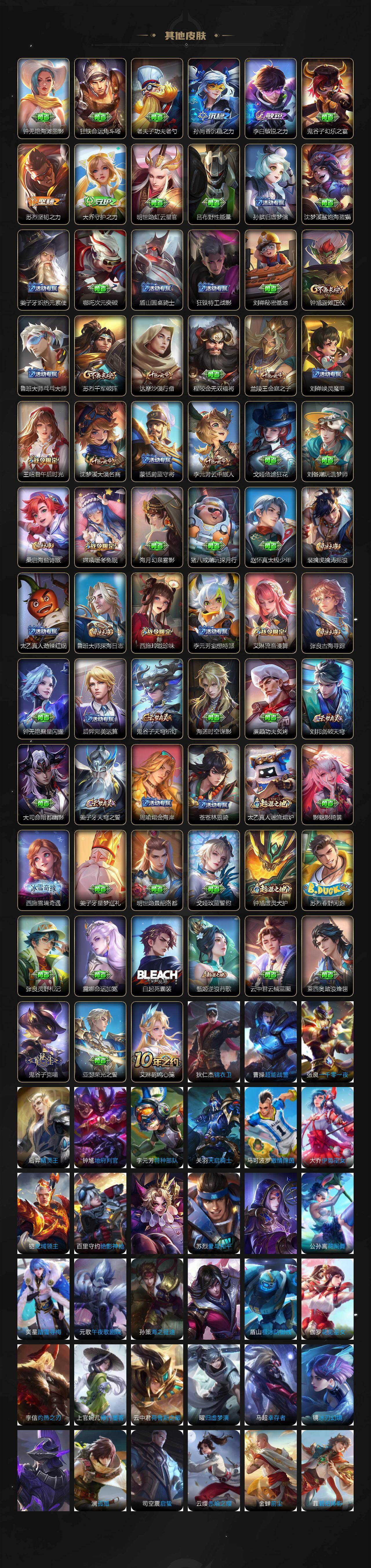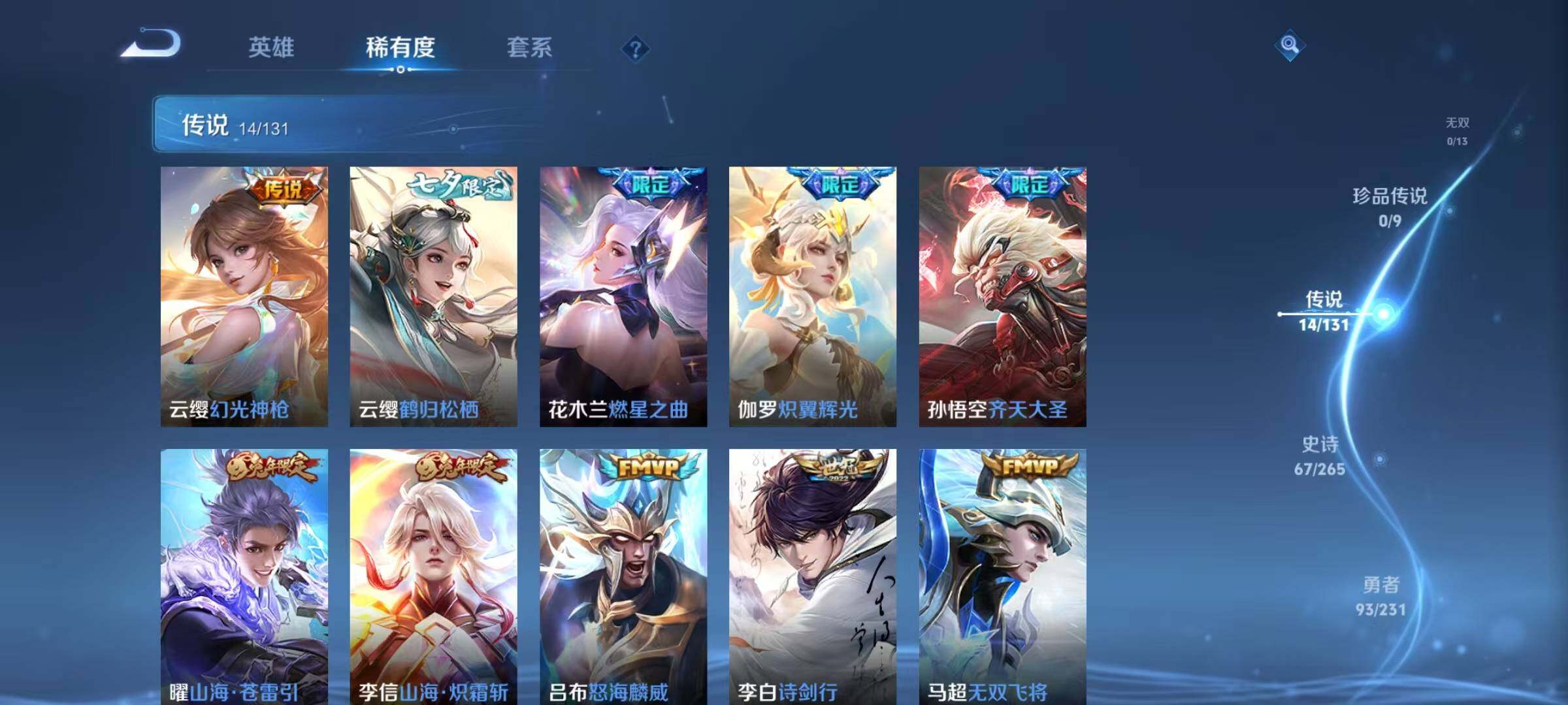 【传说皮肤】:云缨幻光神枪,云缨鹤归松栖,花木兰燃星之曲,伽罗炽翼辉光,孙悟空齐天大圣,曜山海苍雷引,李信山海炽霜斩,吕布怒海麟威,李白诗剑行,马超无双飞将,镜炽阳神光,曜云鹰飞将,李信一念神魔,孙尚香末日机甲
