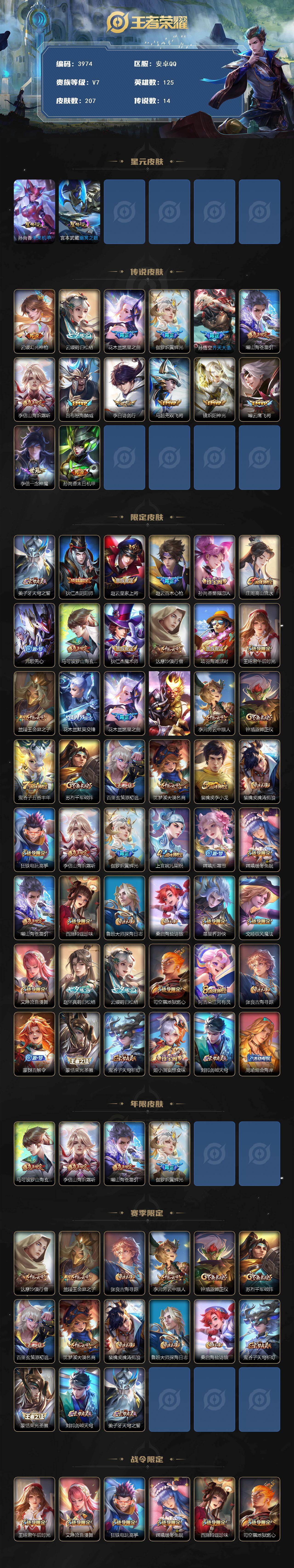 安卓Q-V7-最强王者段位-125英雄-207皮肤-14传说-67史诗