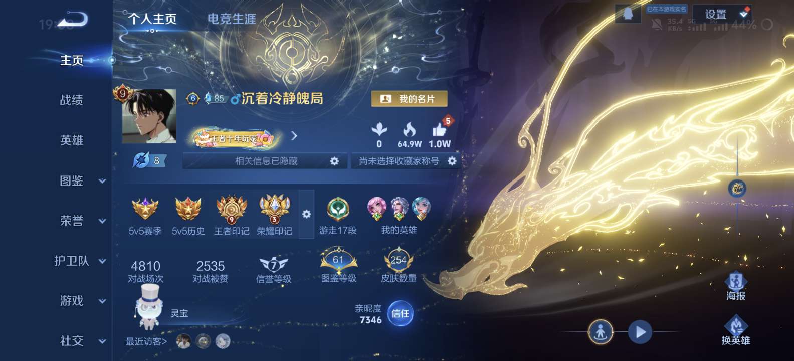 v9,背包有一颗荣耀水晶,刘备全皮,英雄除了武则天剩下都有,十年账号