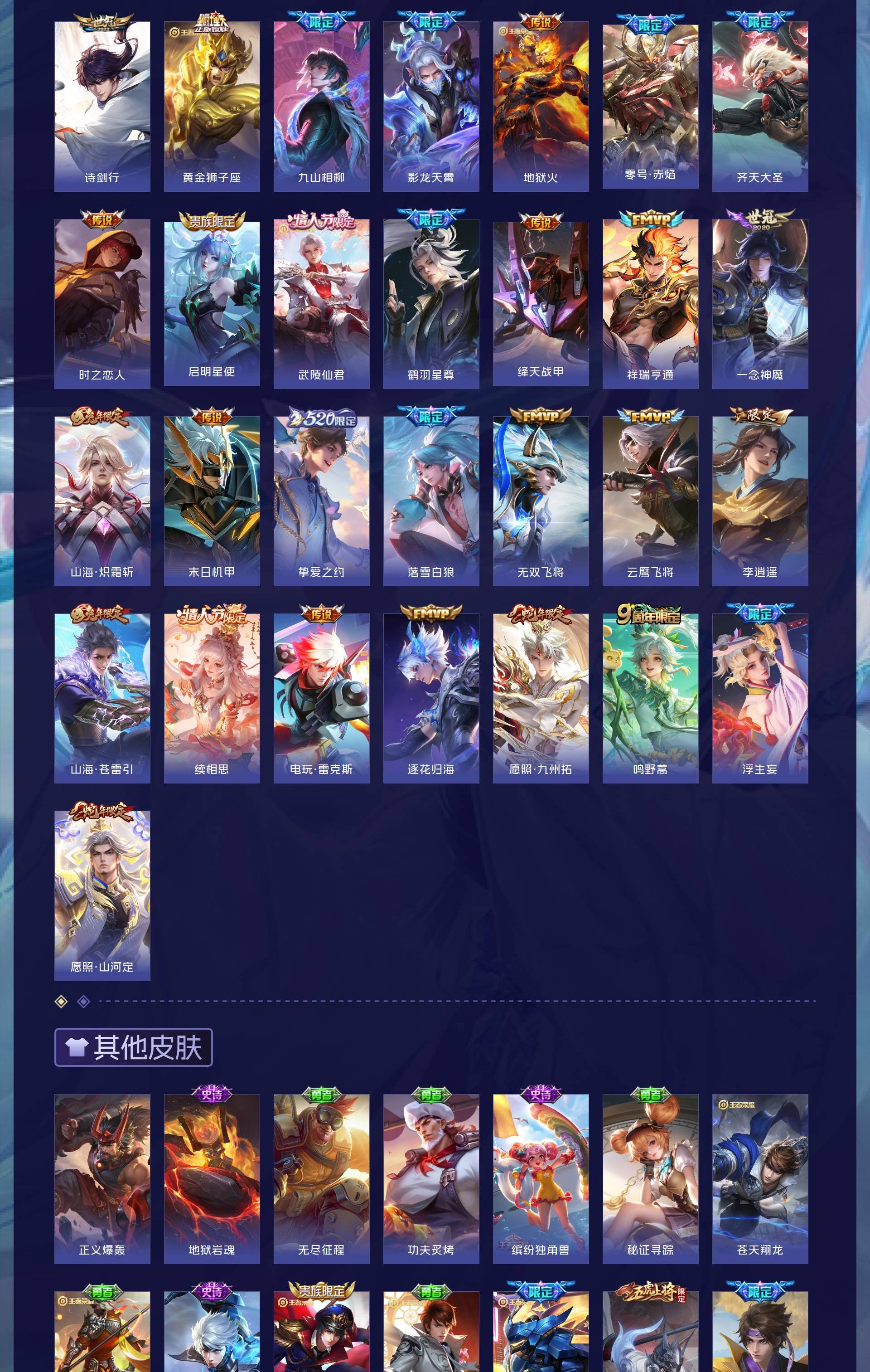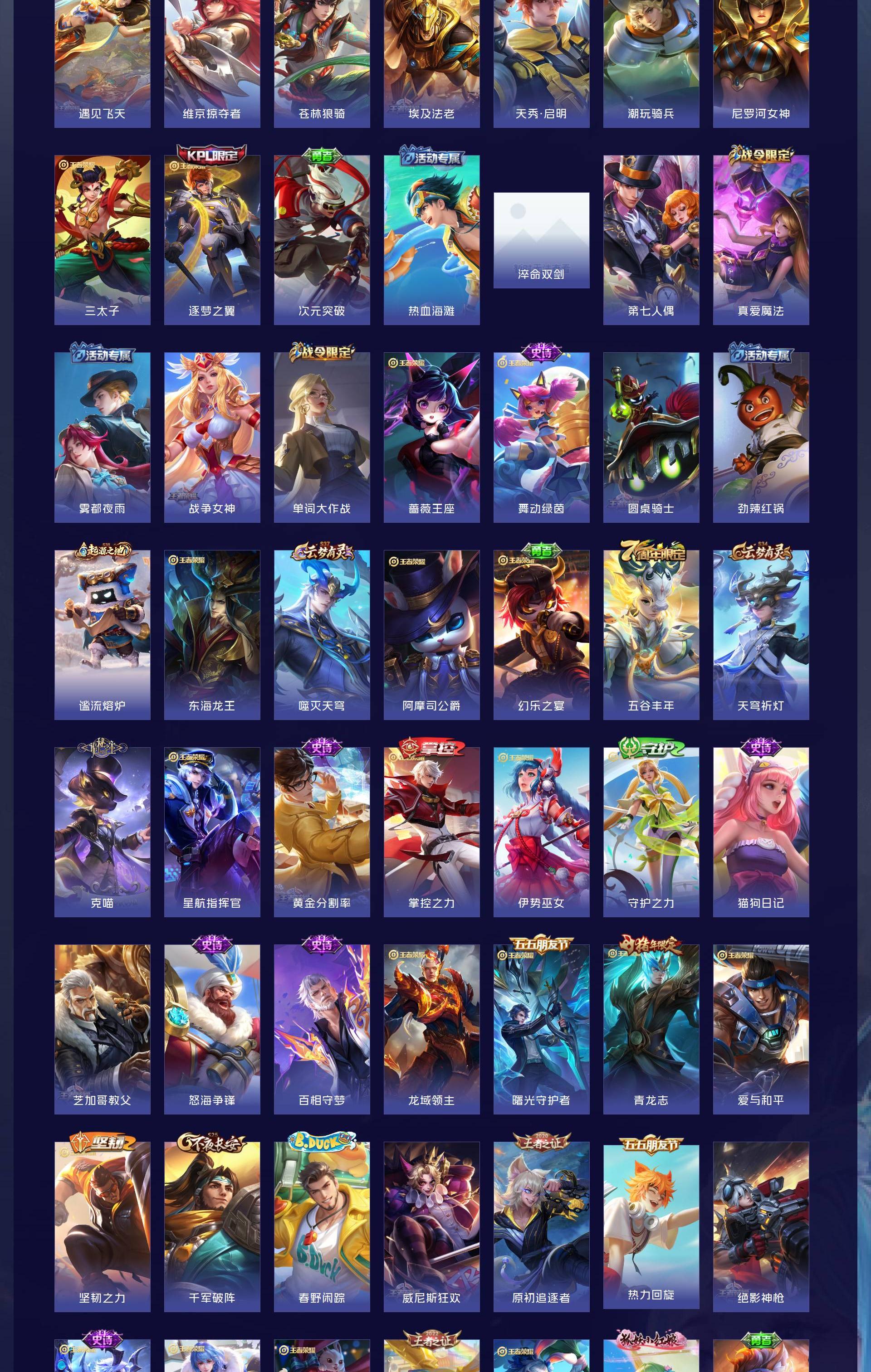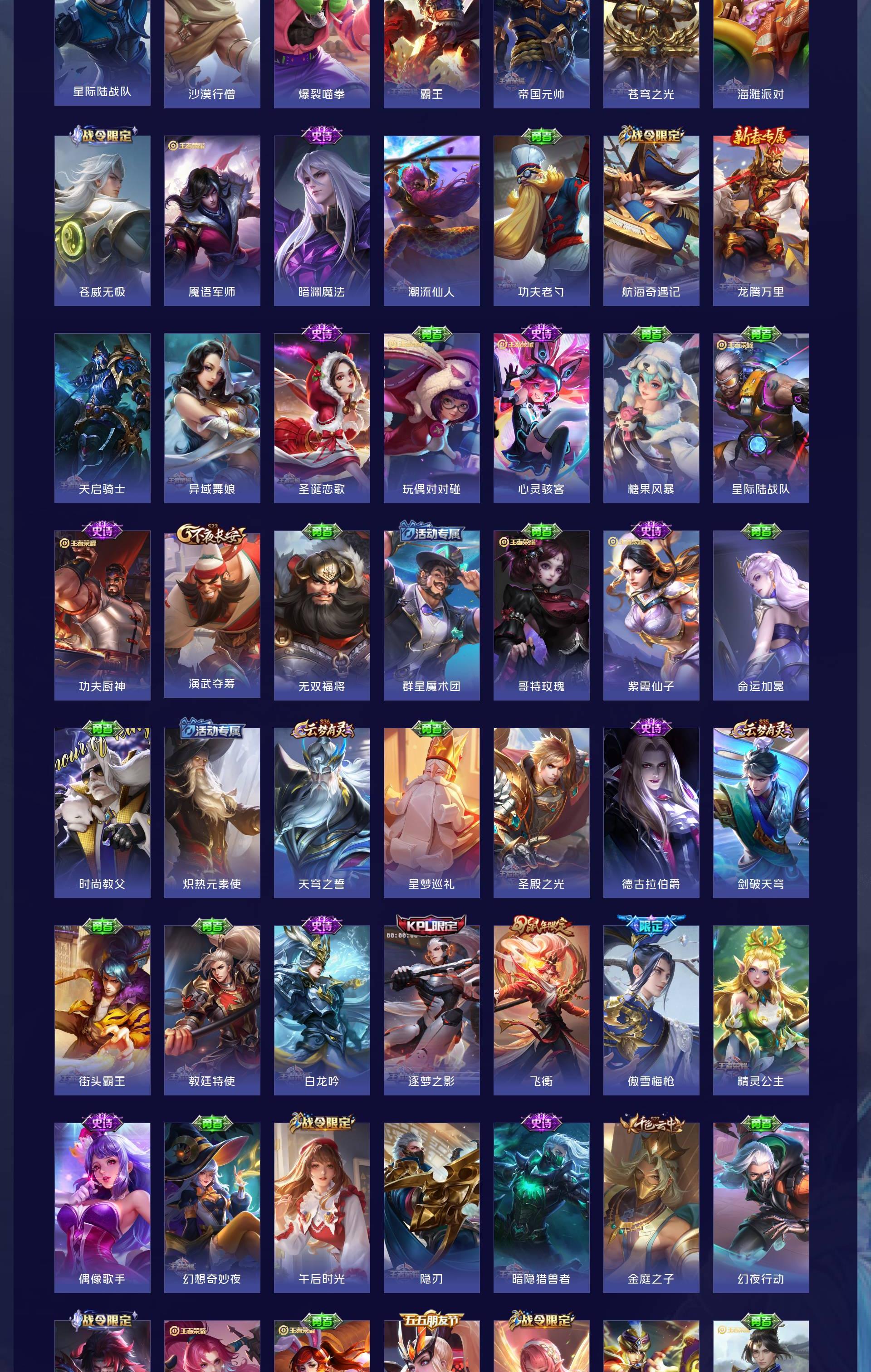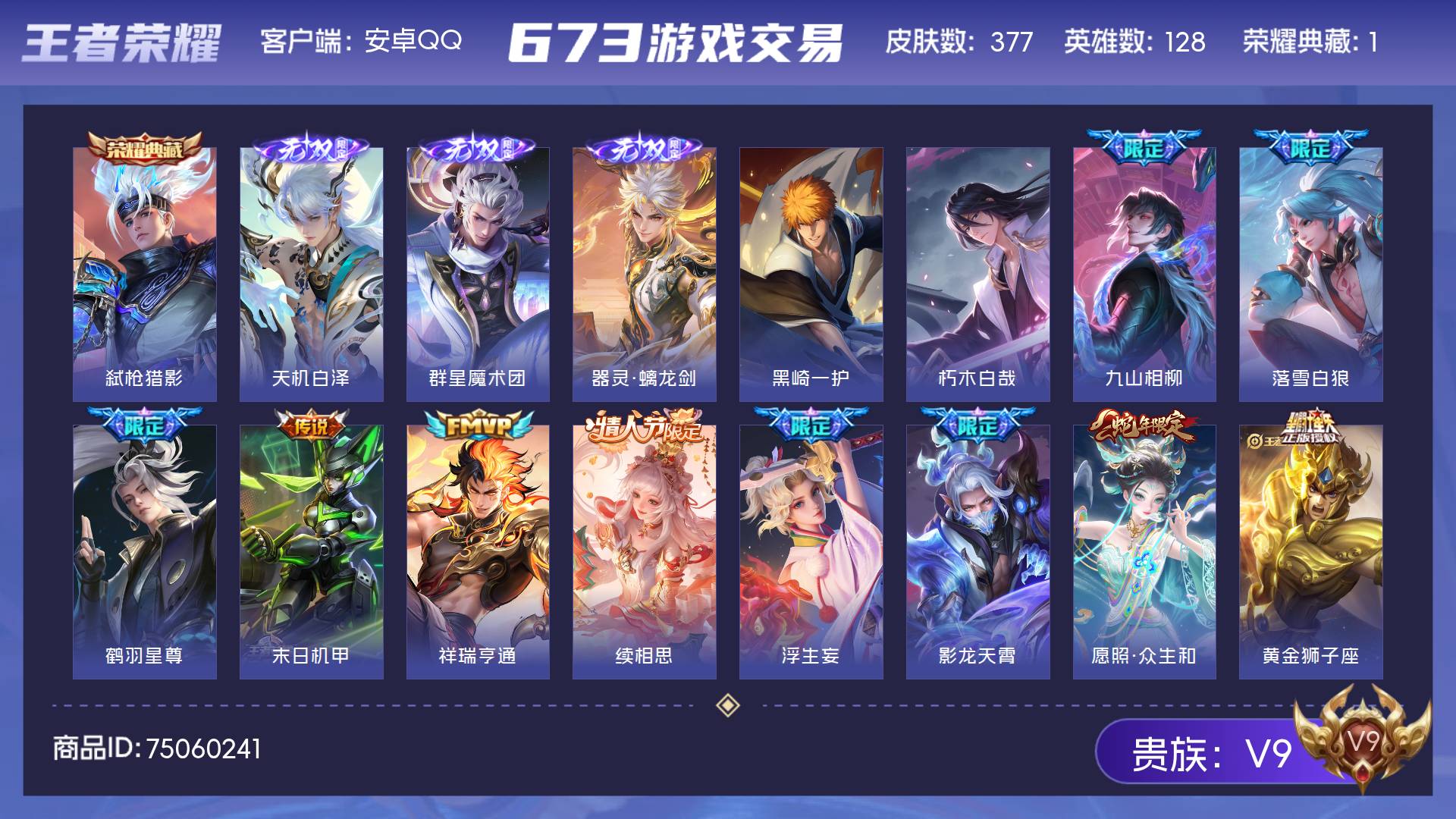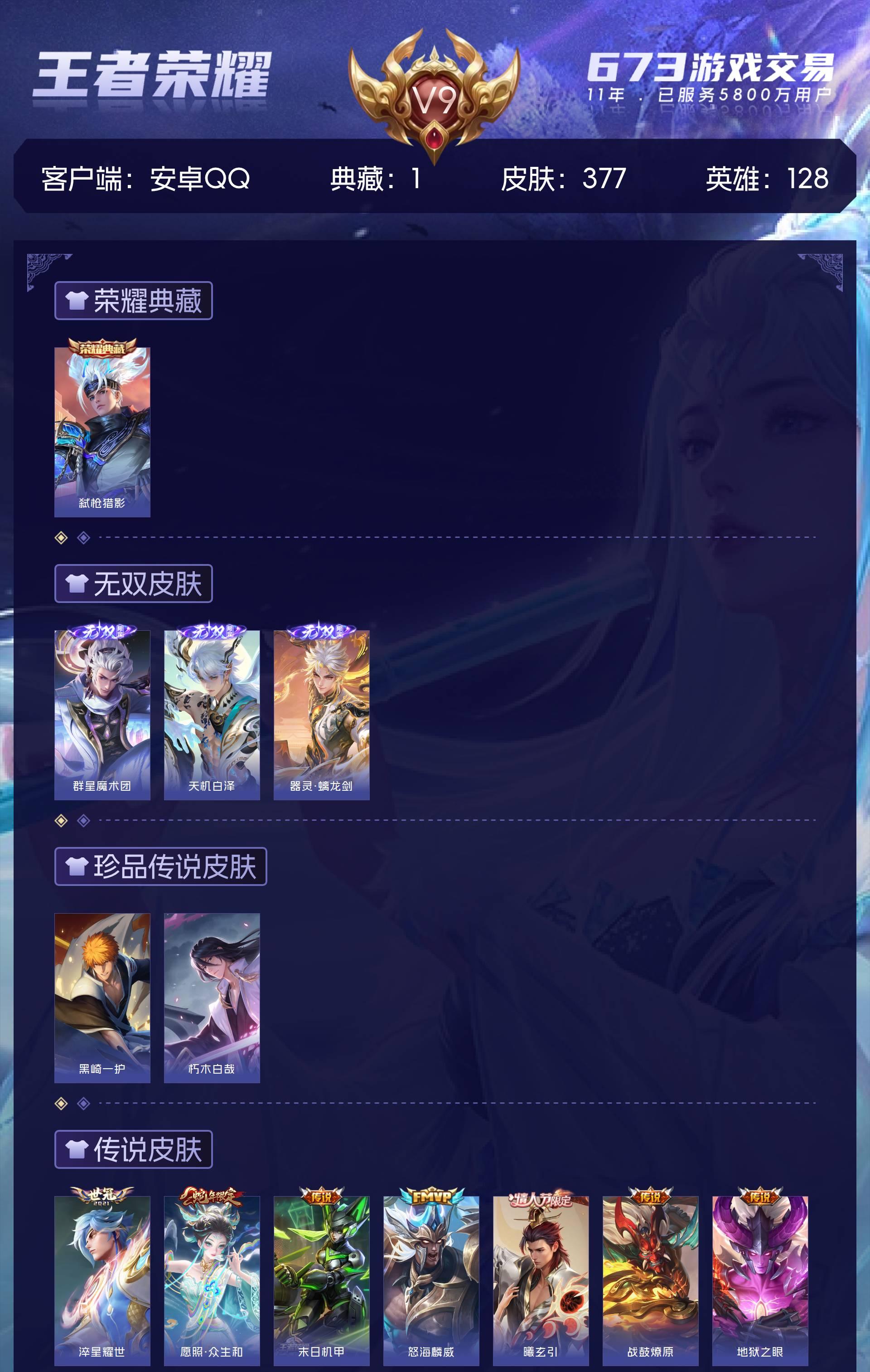 V9 皮肤377 英雄128 至圣王者 荣耀典藏1 无双皮肤3 珍品传说2 星传说3 传说36 其他皮肤341