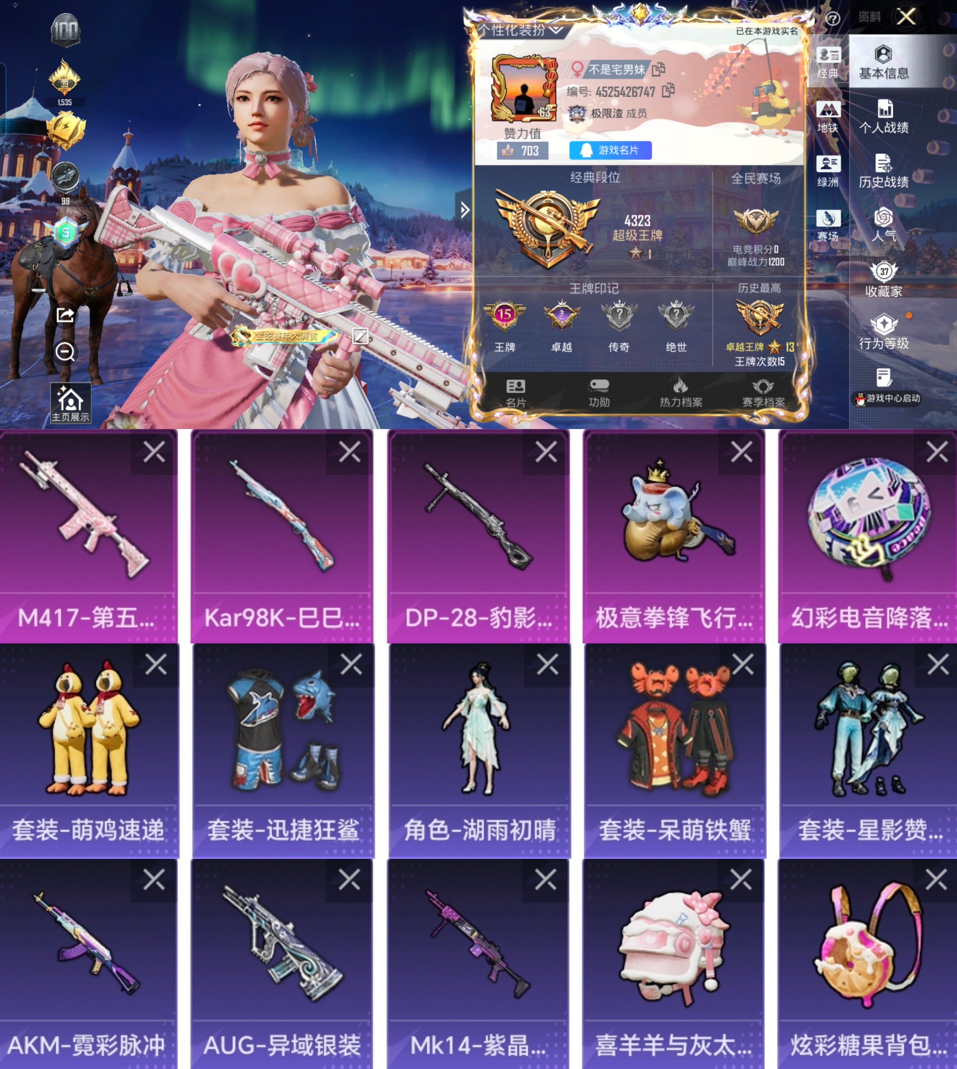 LGH527【3特高印记地铁号M417-第五大道7级DP28豹影疾电5级迅捷狂鲨素材号】(可二次实名) 安卓Q-3特效枪6热门109套装103枪皮 30622热力值 15印记 历史卓越王牌13星 【3特效枪】 Kar98K-巳巳如意 (5级) DP-28-豹影疾电 (5级) M417-第五大道 (7级) 【6热门】 龟仙人 浪漫假日 呆萌铁蟹 迅捷狂鲨 破蛋小黄鸡 极速红龙