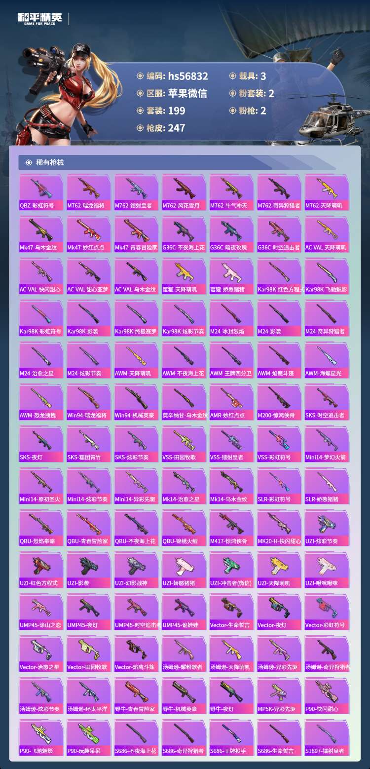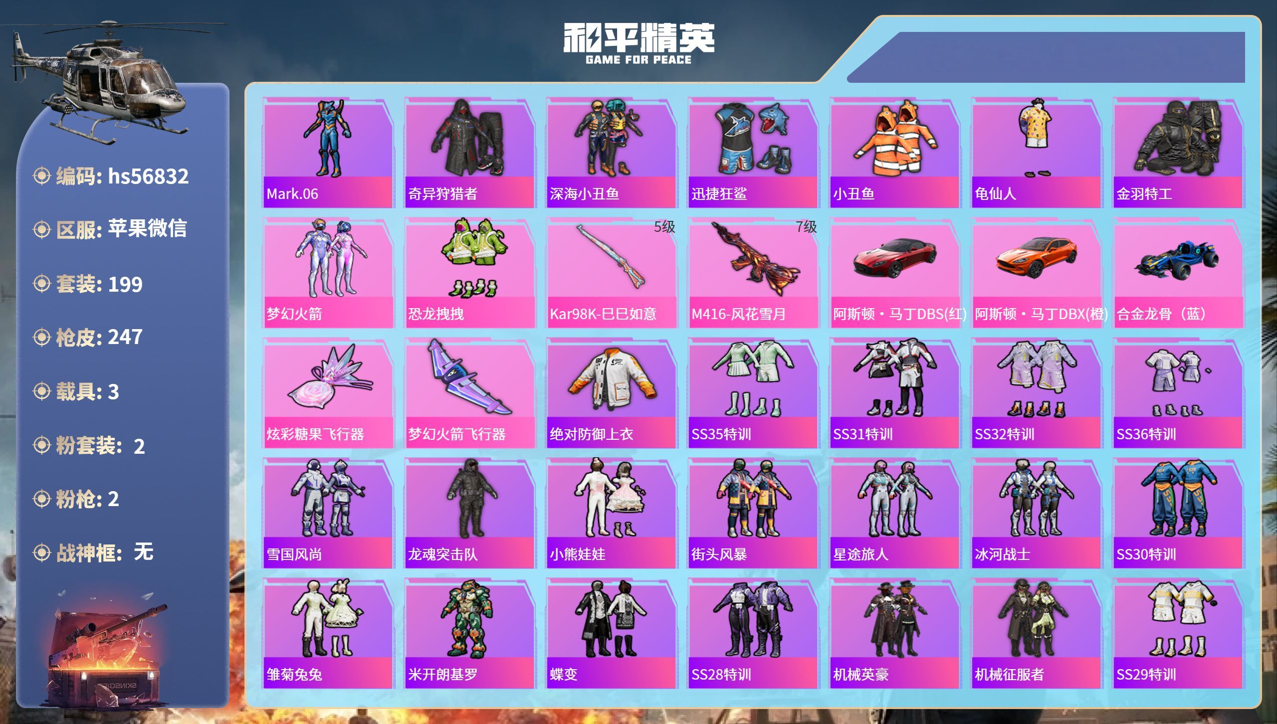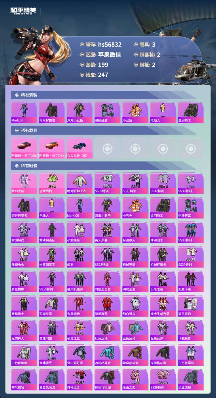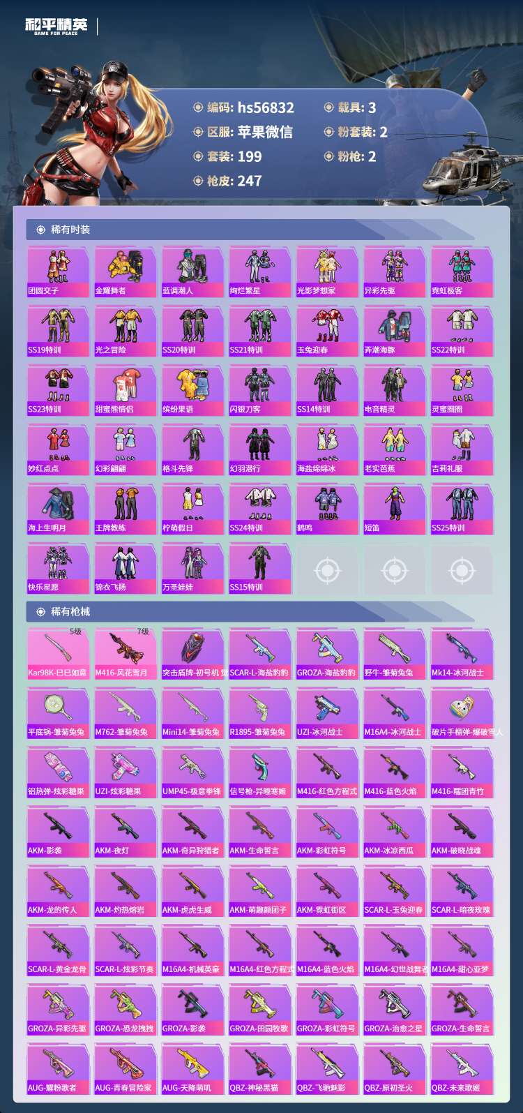 hs56832 苹果微-17王牌印记-2粉装-2特效枪-3载具-79642热力值-199套装-24