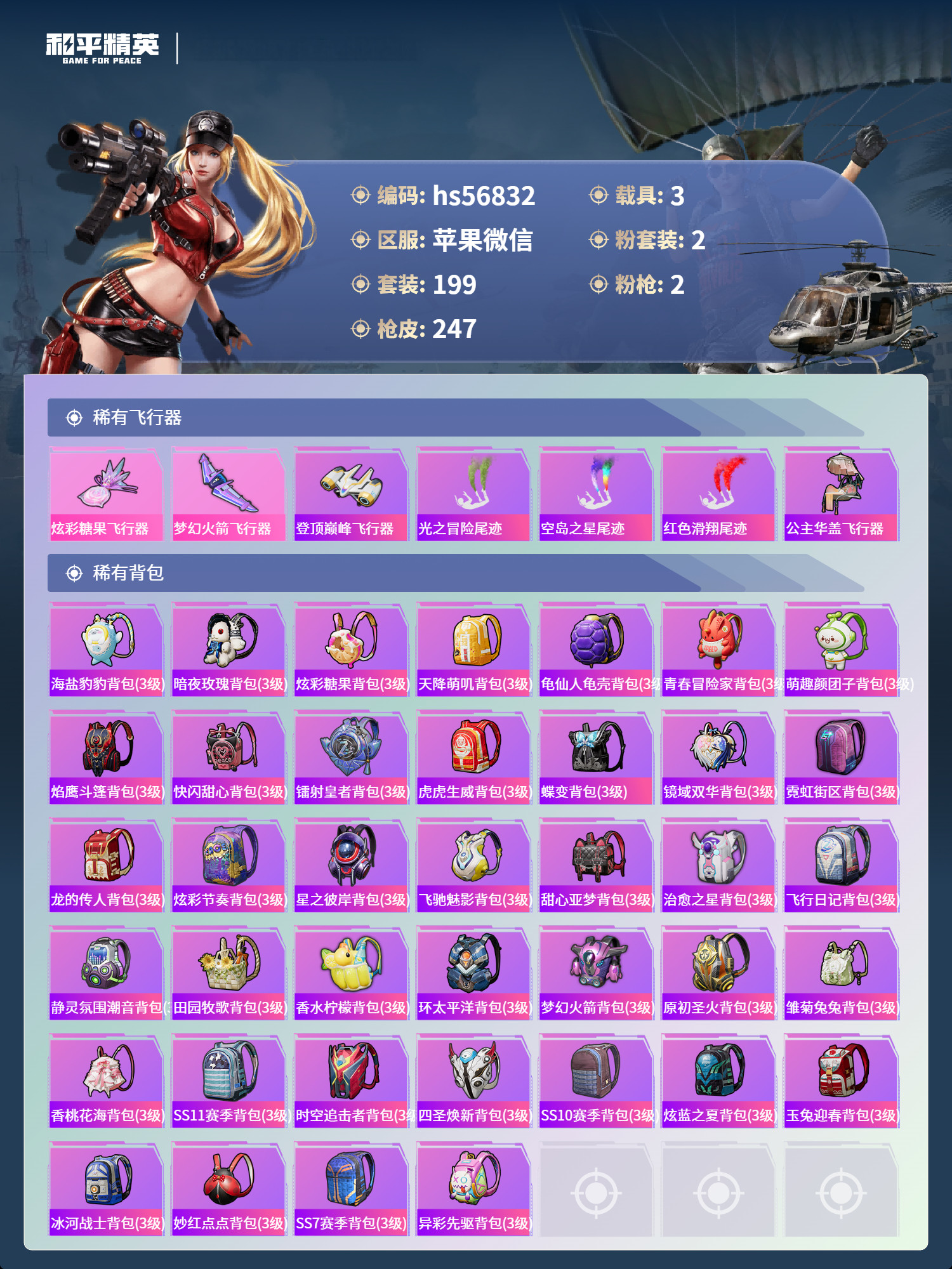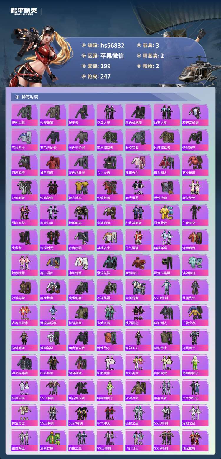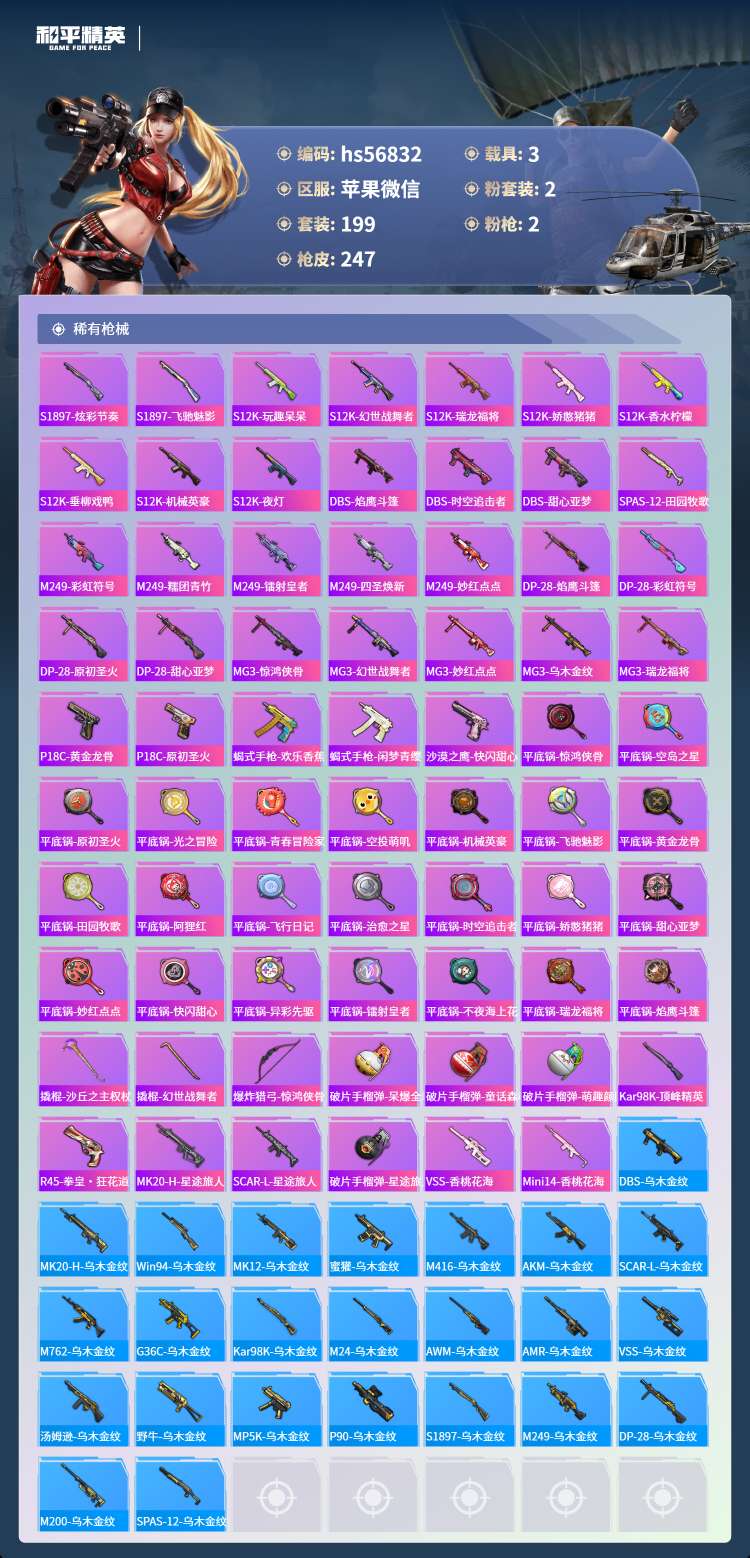 hs56832 苹果微-17王牌印记-2粉装-2特效枪-3载具-79642热力值-199套装-24
