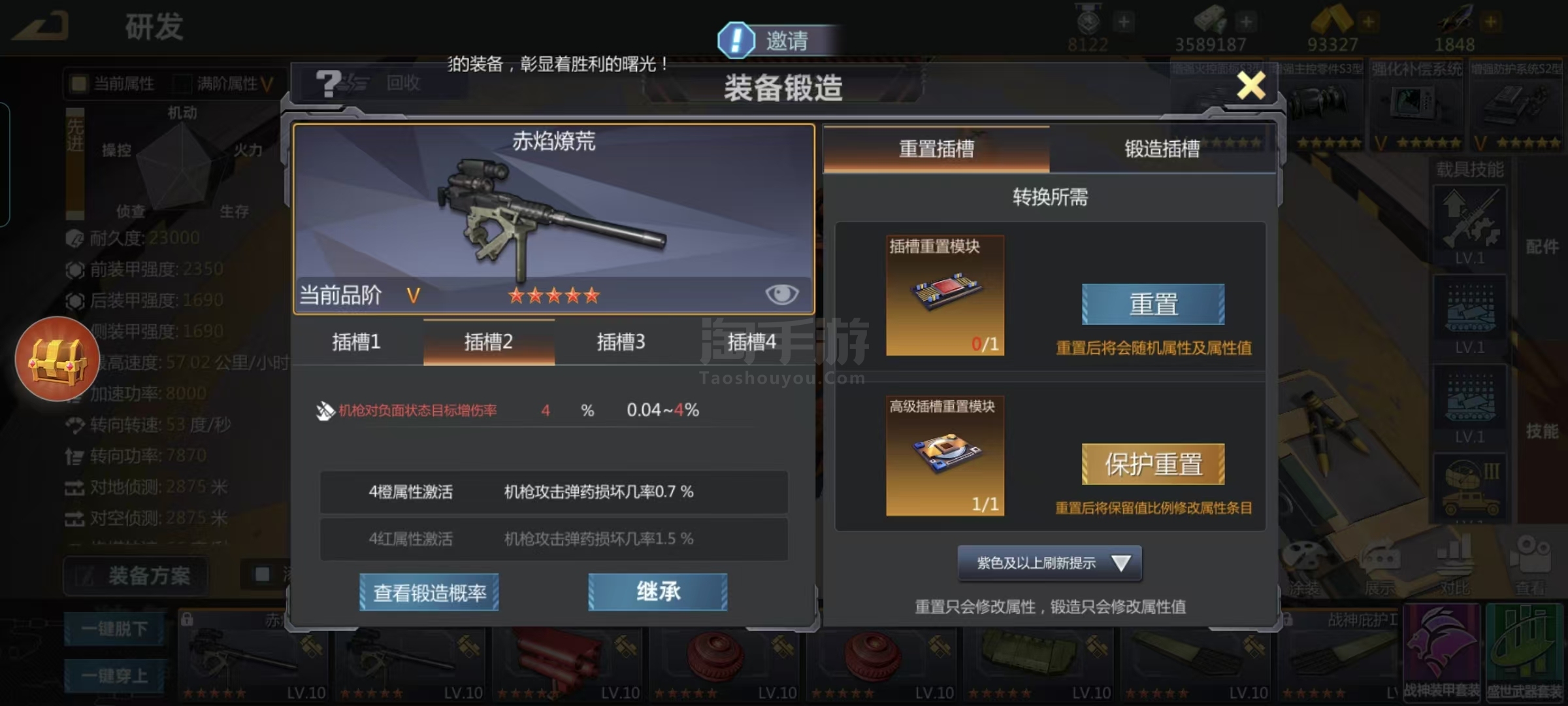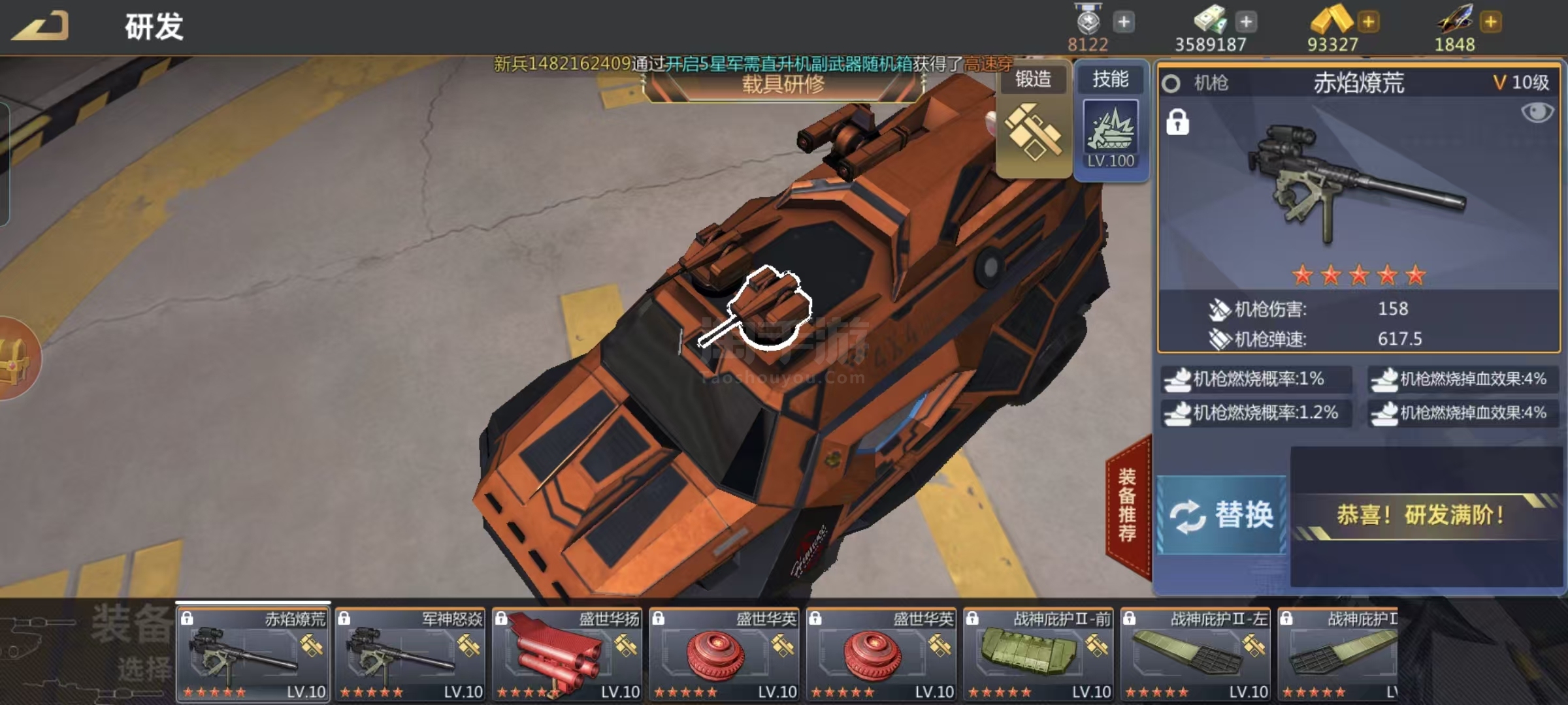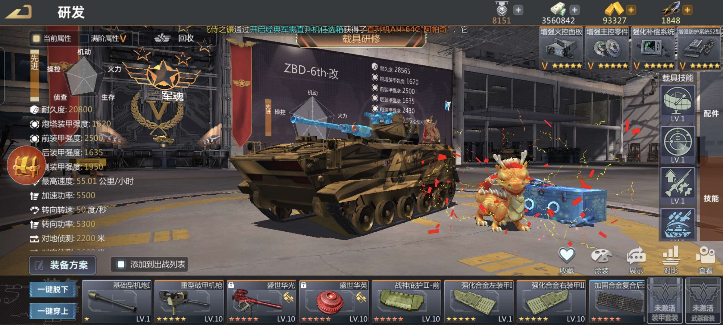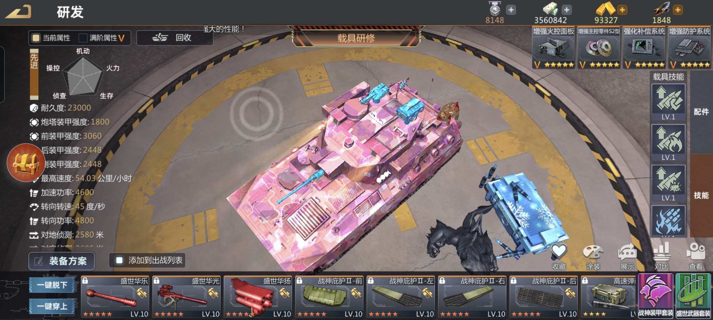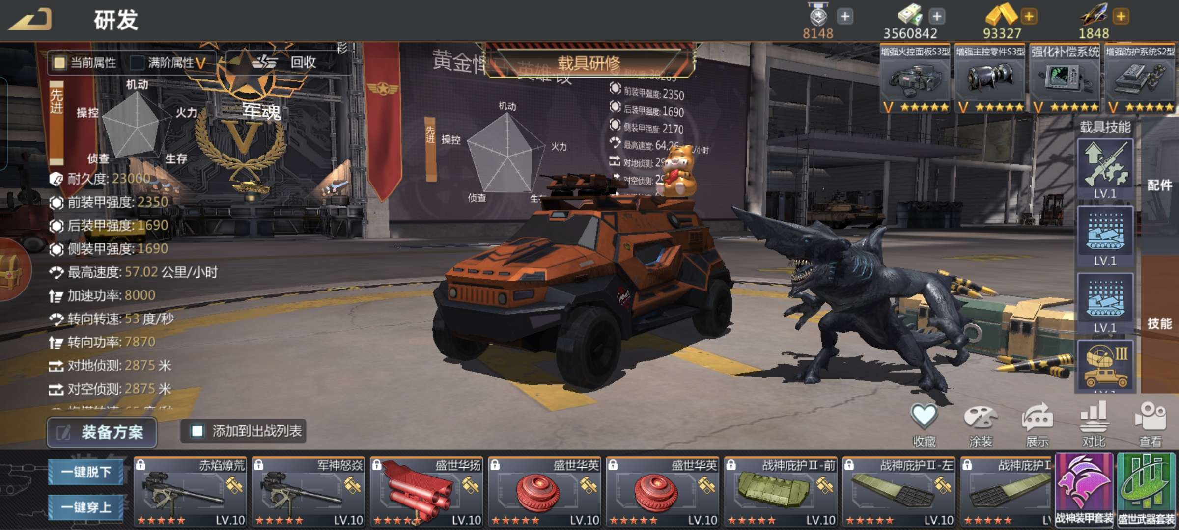 特10!97级,盛会机枪一件,其他盛世武器8件!盛世机炮研发中!战神甲俩套半!