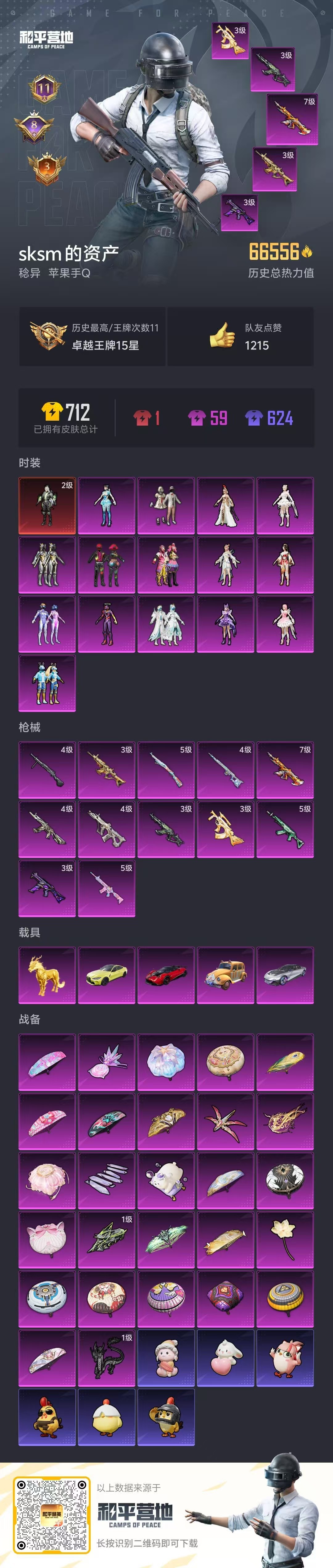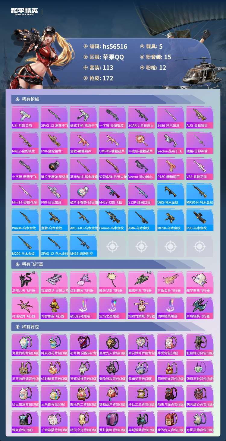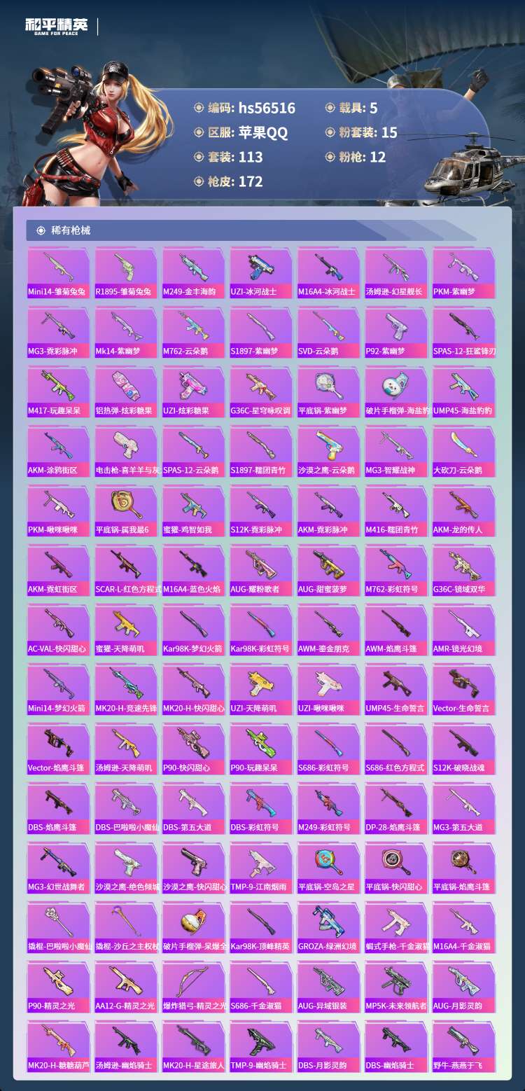 hs56516 苹果手Q-11王牌印记-1红装-15粉装-12特效枪-5载具-66556热力值-11