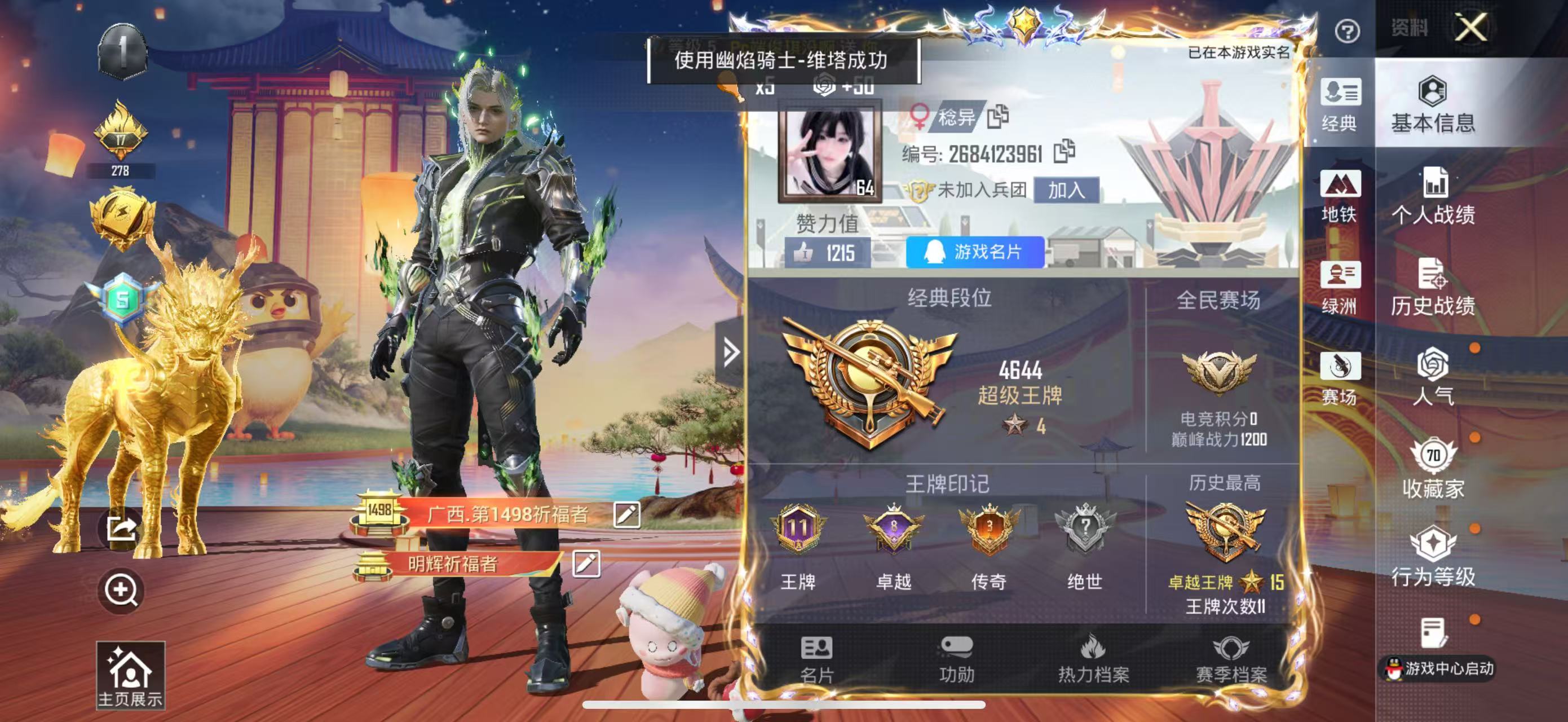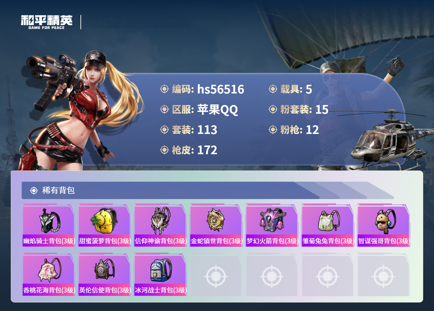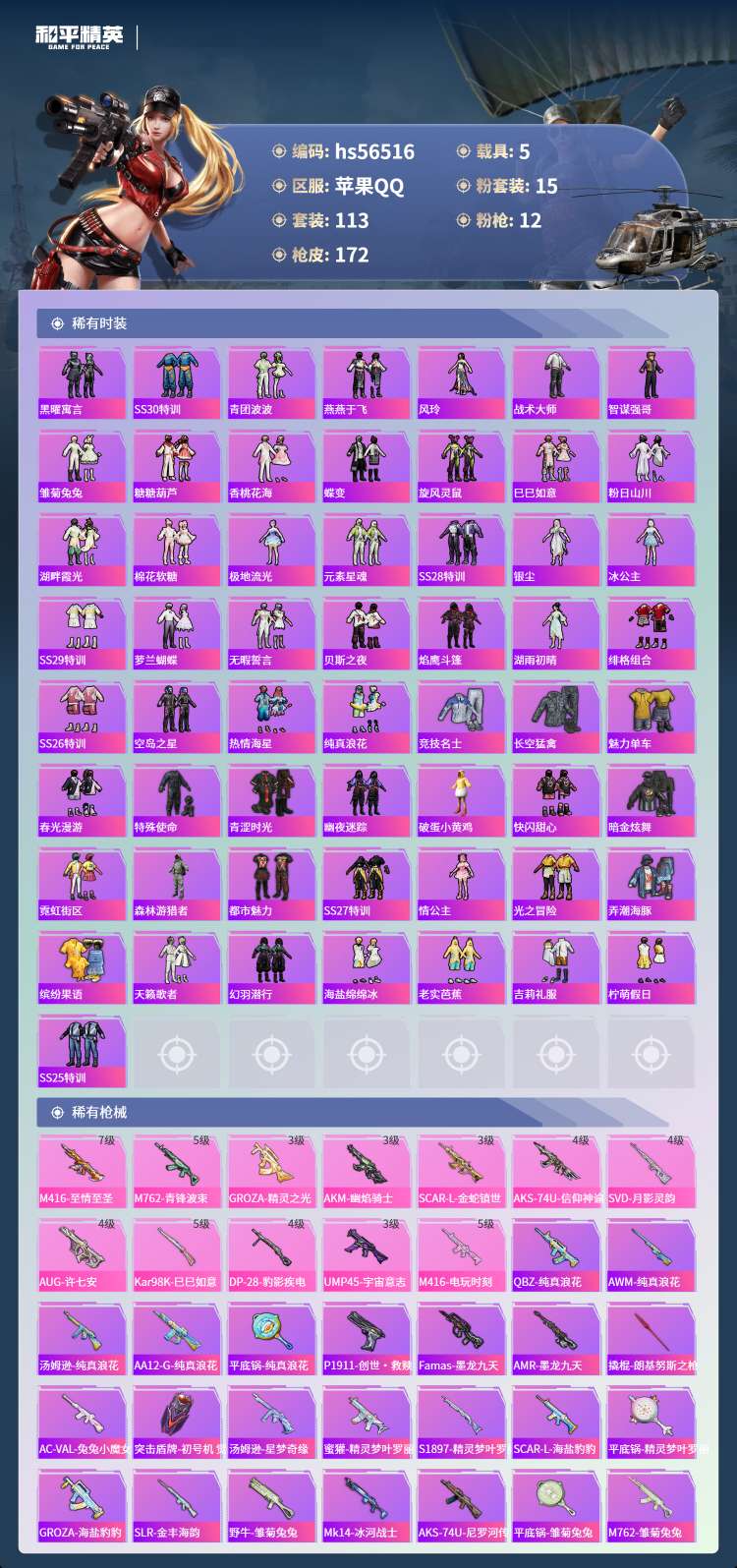 hs56516 苹果手Q-11王牌印记-1红装-15粉装-12特效枪-5载具-66556热力值-11
