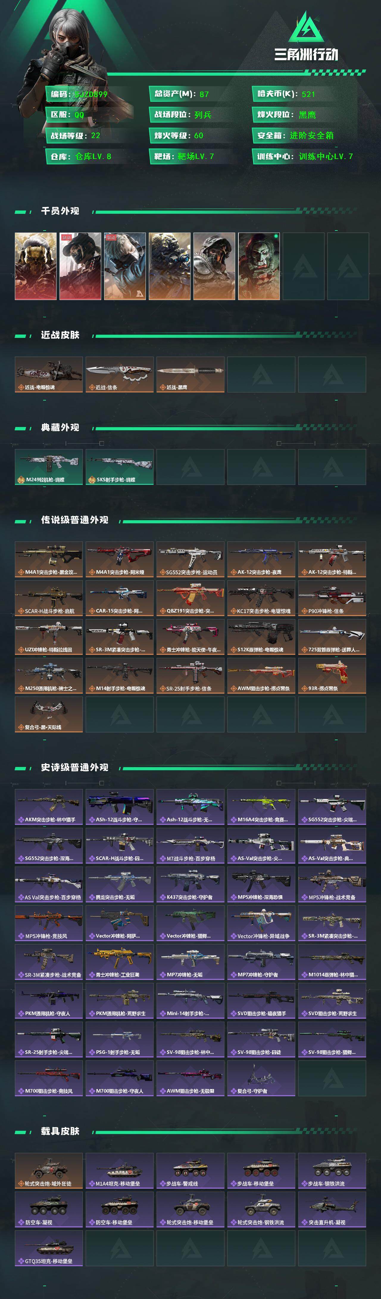 总资产(M):87M/哈夫币(K):521K/哈夫币(K):521K/全面战场等级:22_段位:列兵