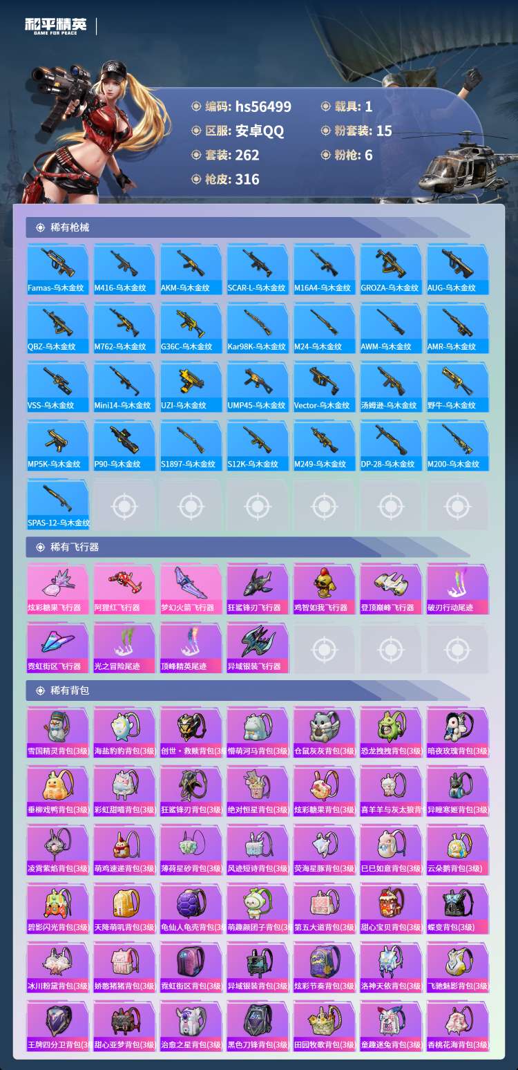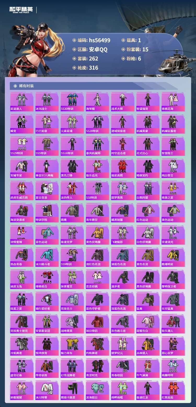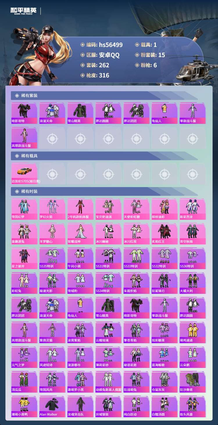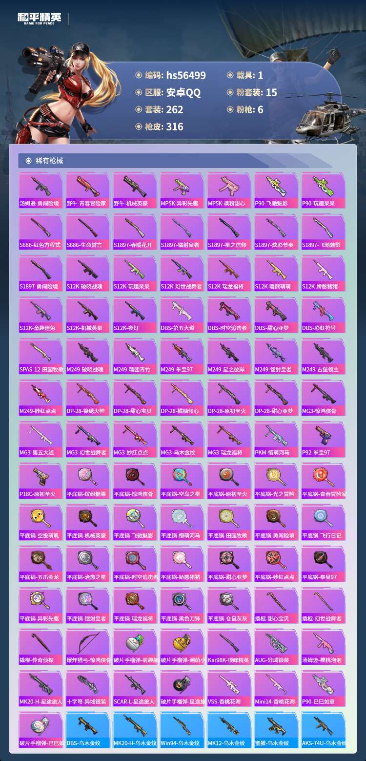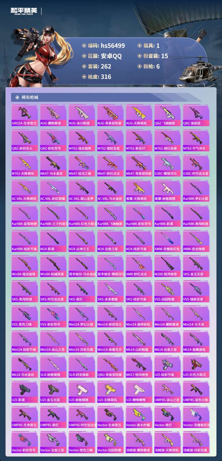 hs56499 安卓手Q-21王牌印记-15粉装-6特效枪-1载具-104687热力值-262套装-