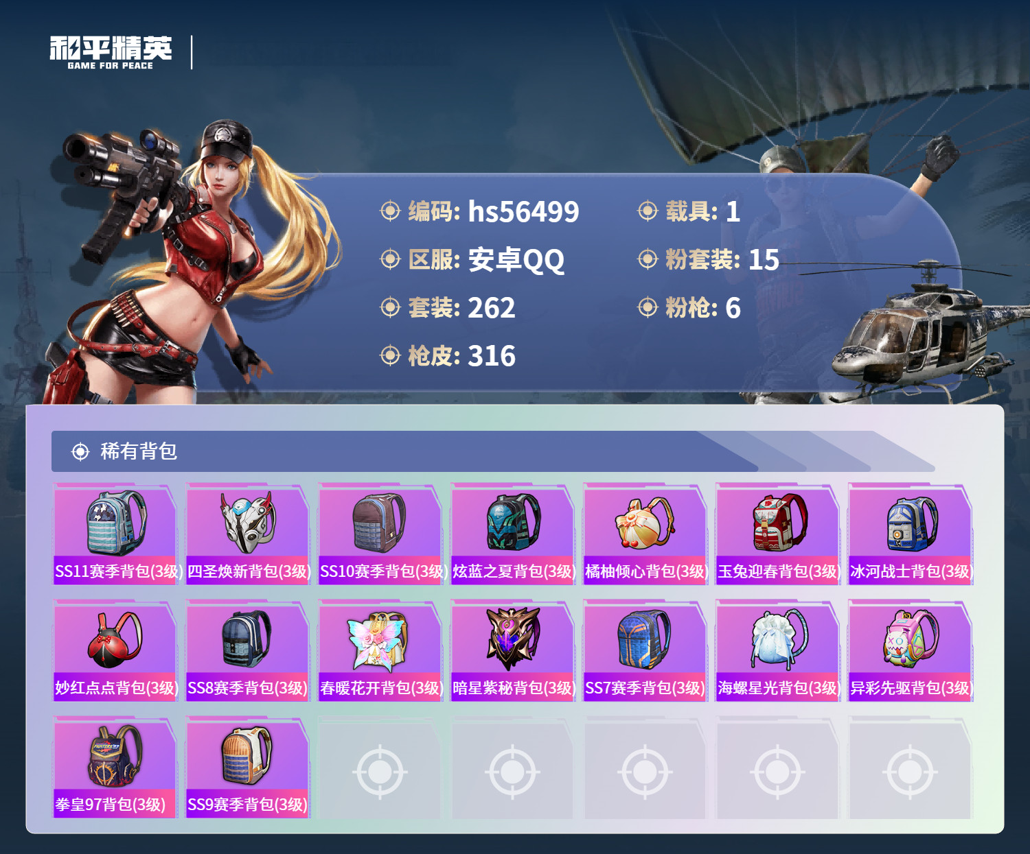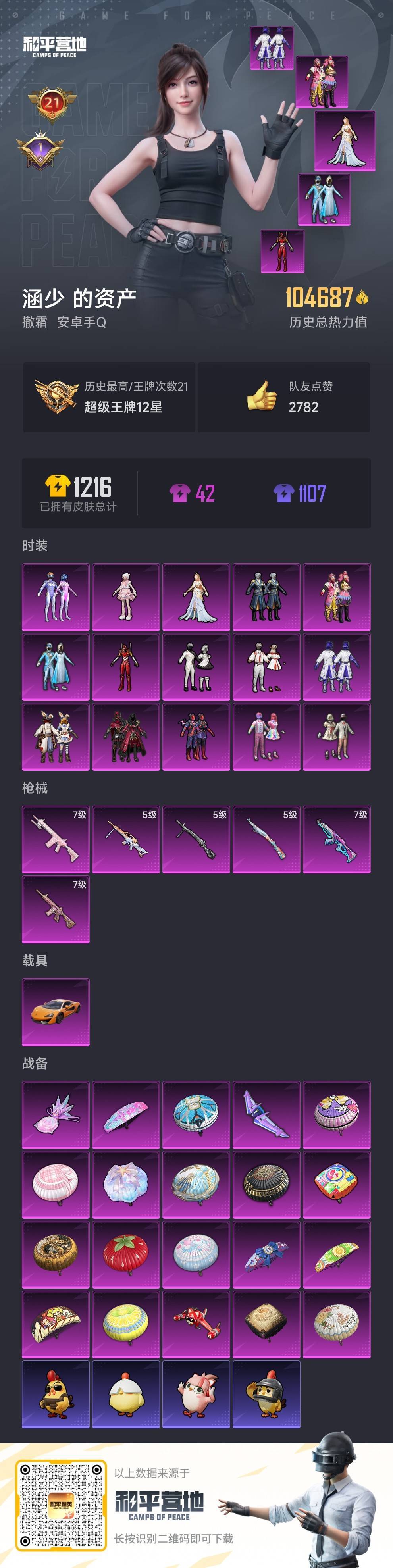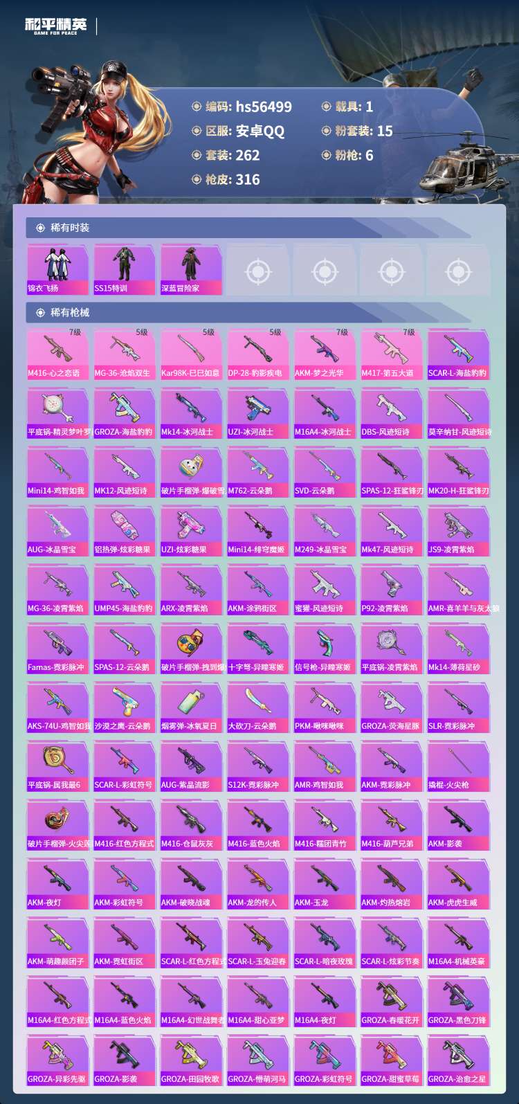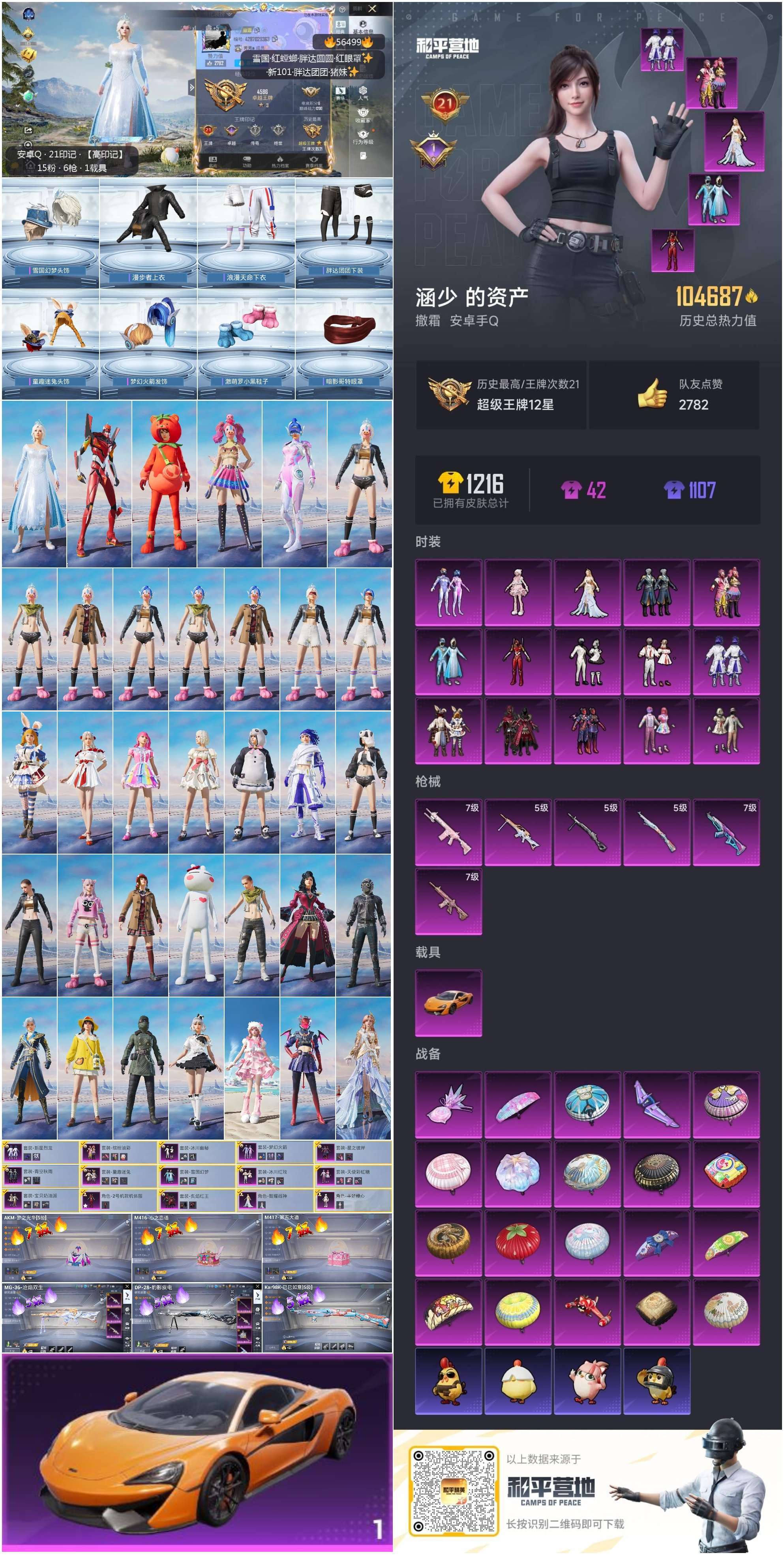 hs56499 安卓手Q-21王牌印记-15粉装-6特效枪-1载具-104687热力值-262套装-
