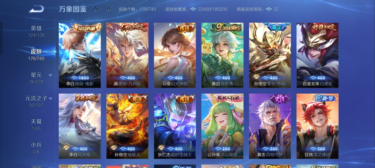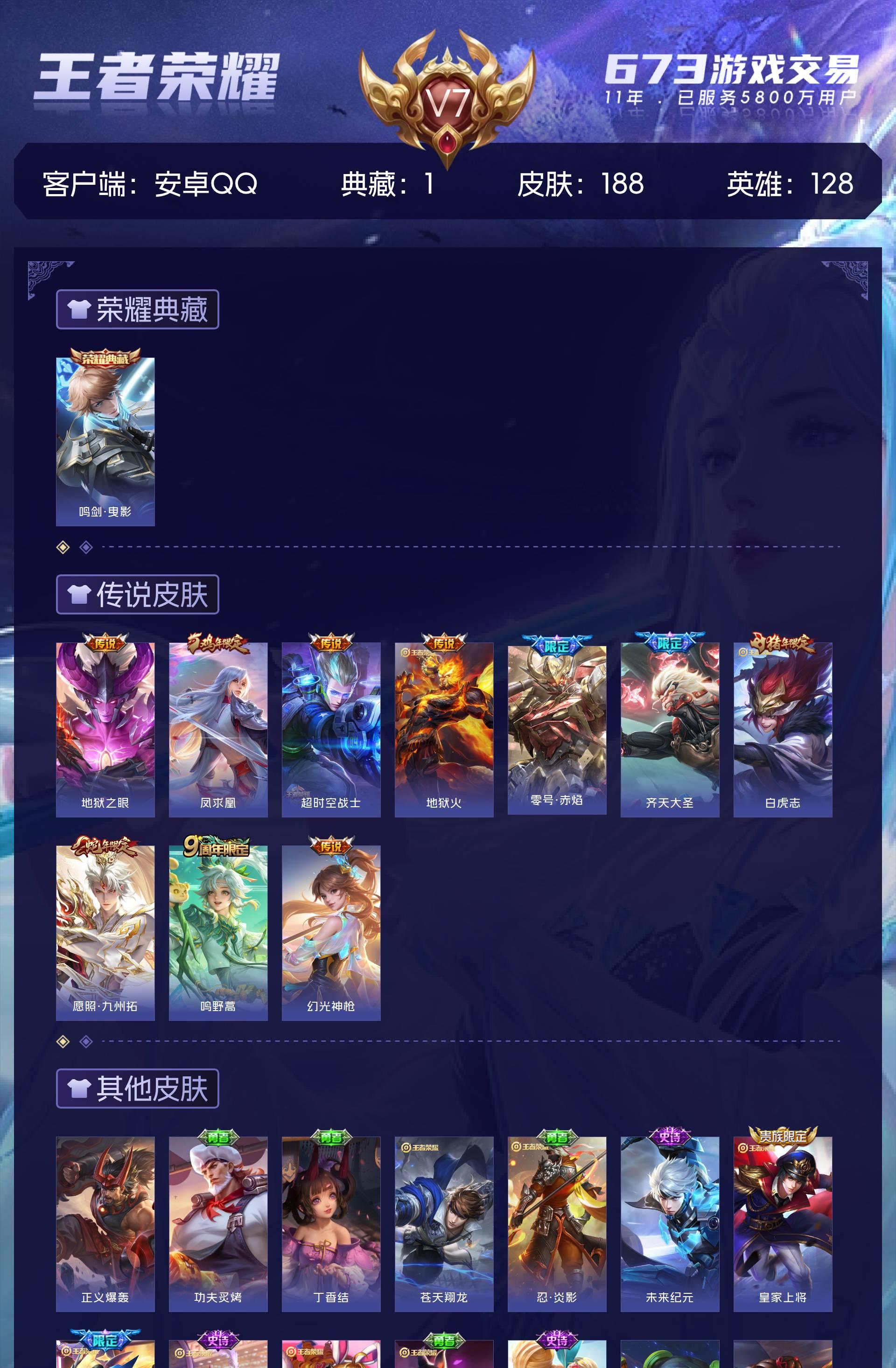V7 皮肤188 英雄128 至尊星耀 荣耀典藏1 星传说3 传说10 其他皮肤184