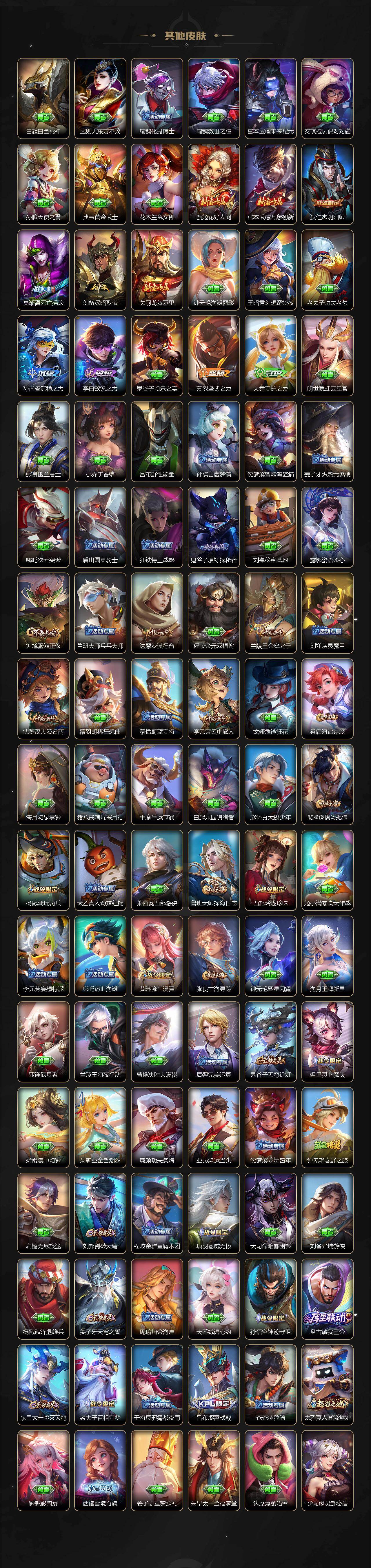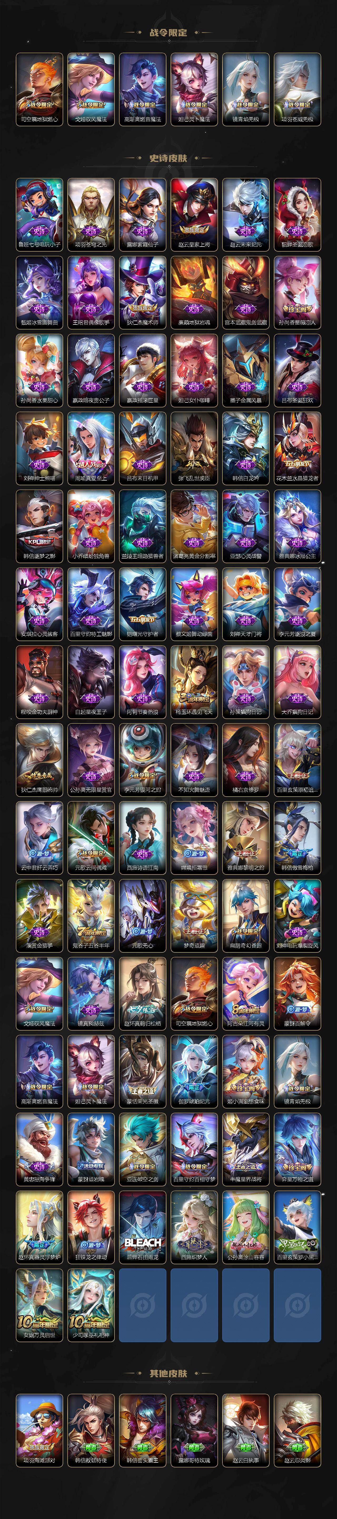 【限定皮肤】:蒙犽顽岩魄,大乔绒语心约,姜子牙天穹之誓,杨戬破阵退雄兵,狄仁杰阴阳师,赵云皇家上将,孙尚香蔷薇恋