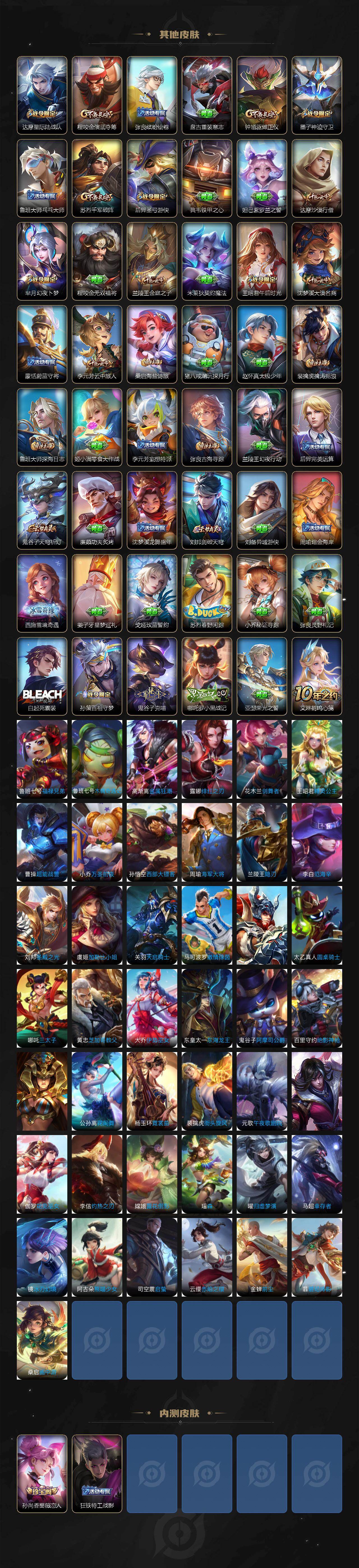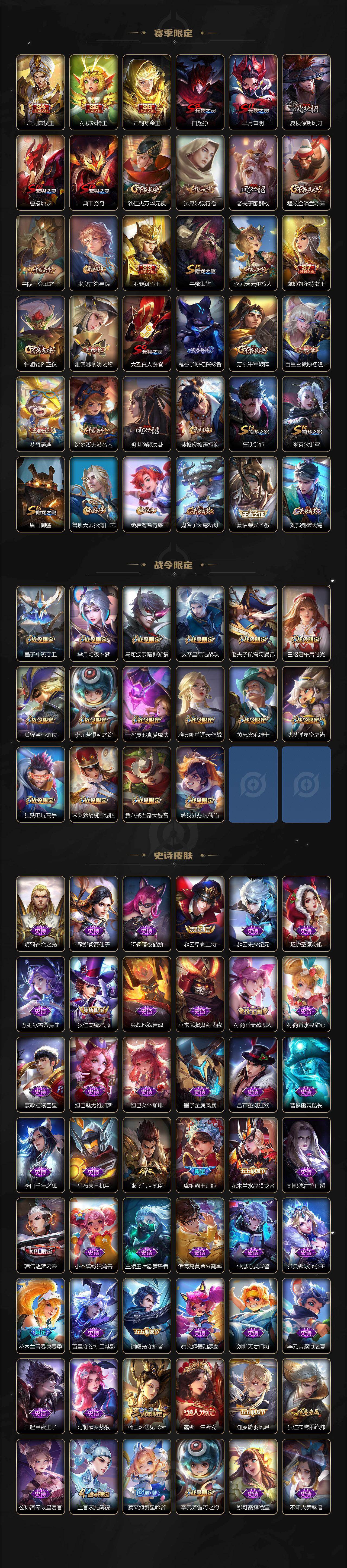 【限定皮肤】:白起狰,狄仁杰阴阳师,虞姬凯尔特女王,赵云皇家上将,墨子神迹守卫,孙尚香蔷薇恋人,庄周蜃楼王,庄周高山流水,