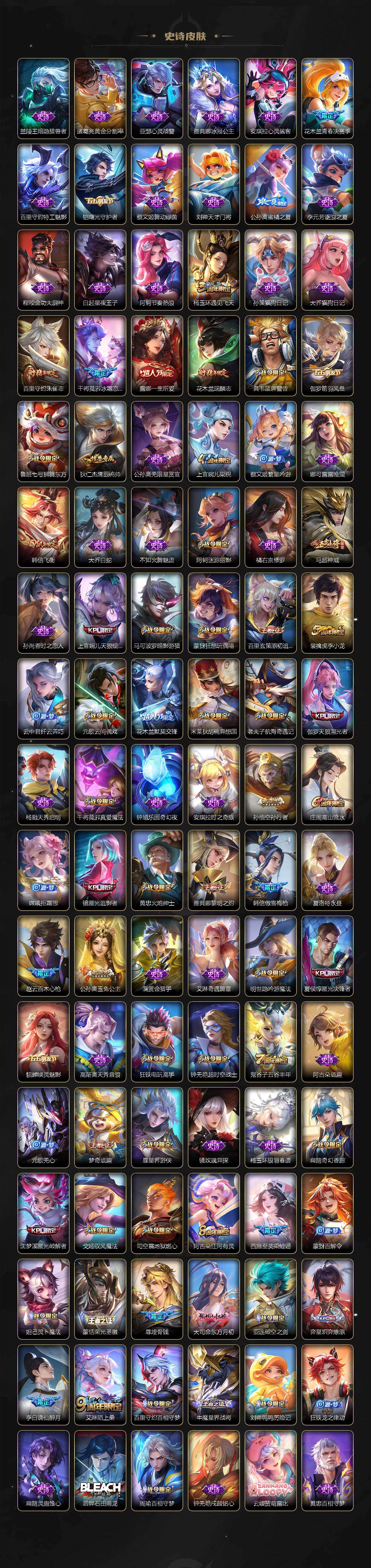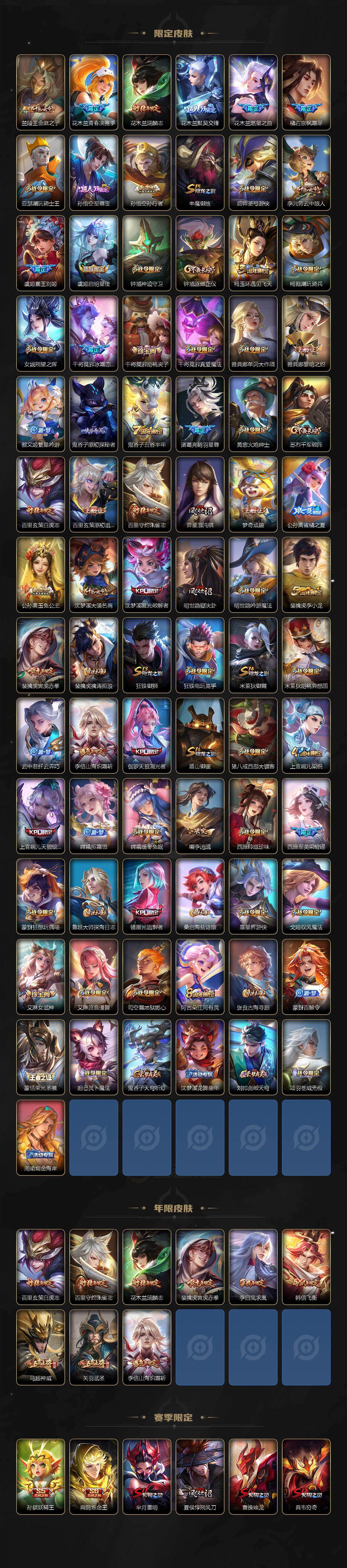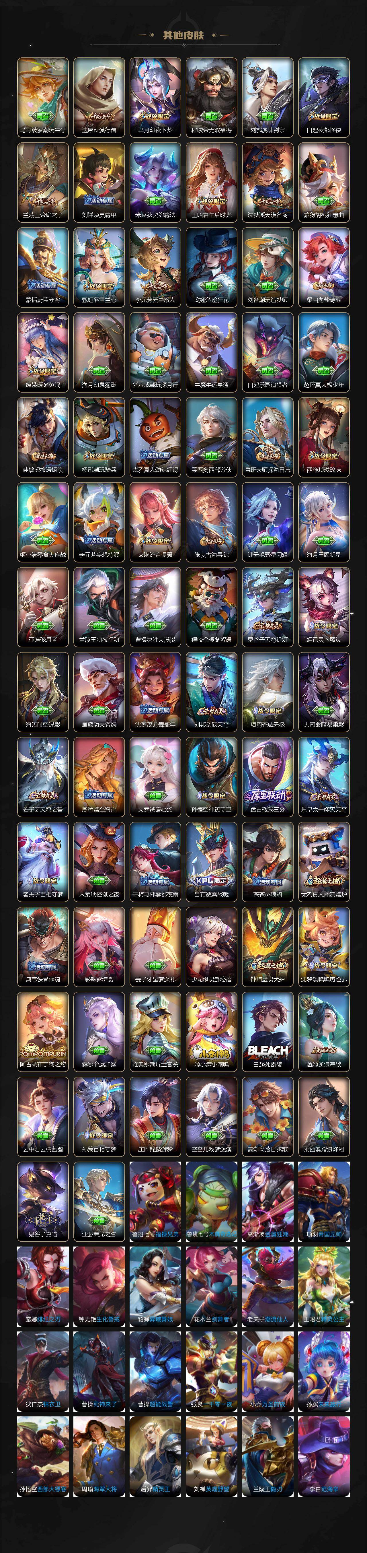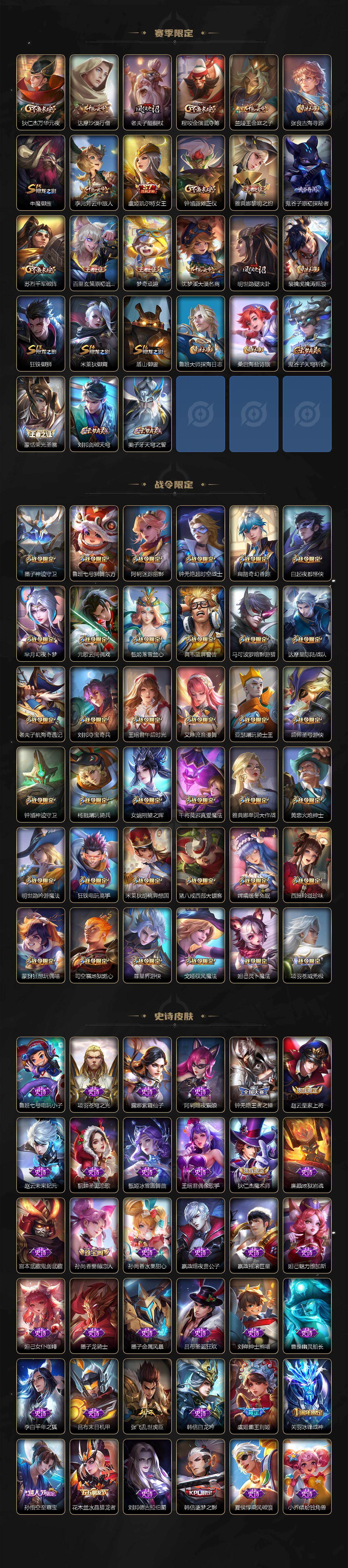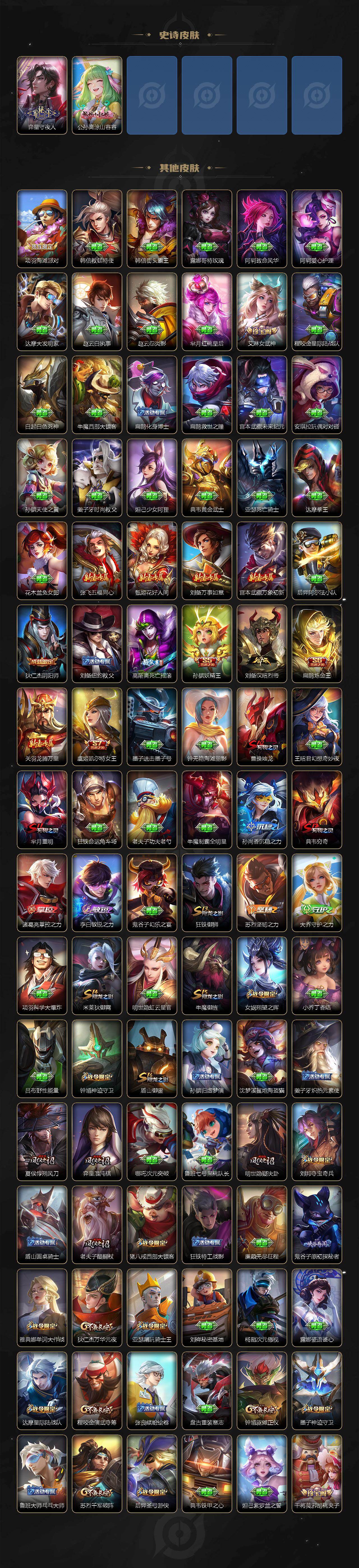 【英雄全皮】:露娜全皮,刘邦全皮,橘右京全皮,钟馗全皮,狂铁全皮,李信全皮,阿古朵全皮,暃全皮,空空儿全皮,影全皮