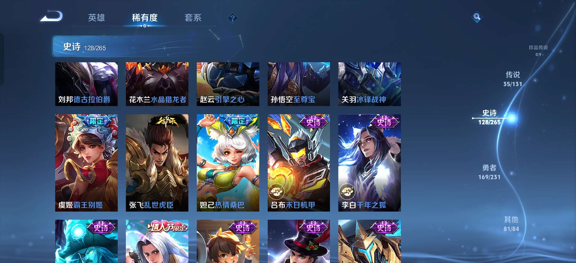 皮肤419 英雄127 传奇王者 荣耀典藏5 无双皮肤1 珍品传说1 传说35 其他皮肤176-s1