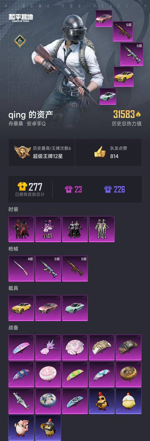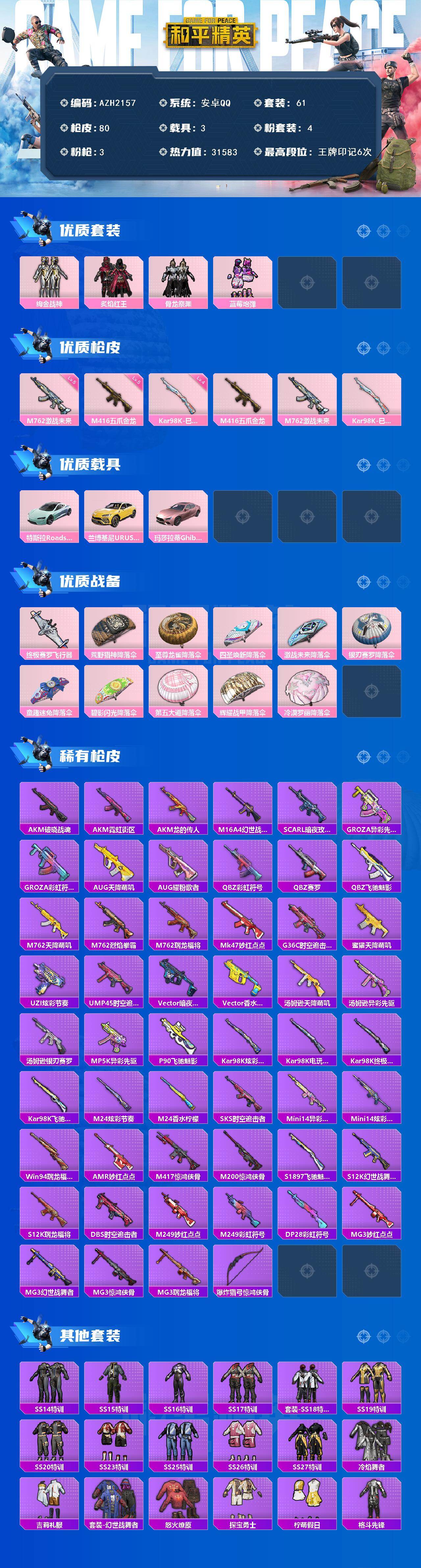 【AZH2157】安卓 手Q【绚金战神蓝莓炮弹 五级五爪金龙M416 3载具】4粉装-3特效枪-3载具-2粉色飞行器-31583热力值-6王牌印记-61套装-80枪皮