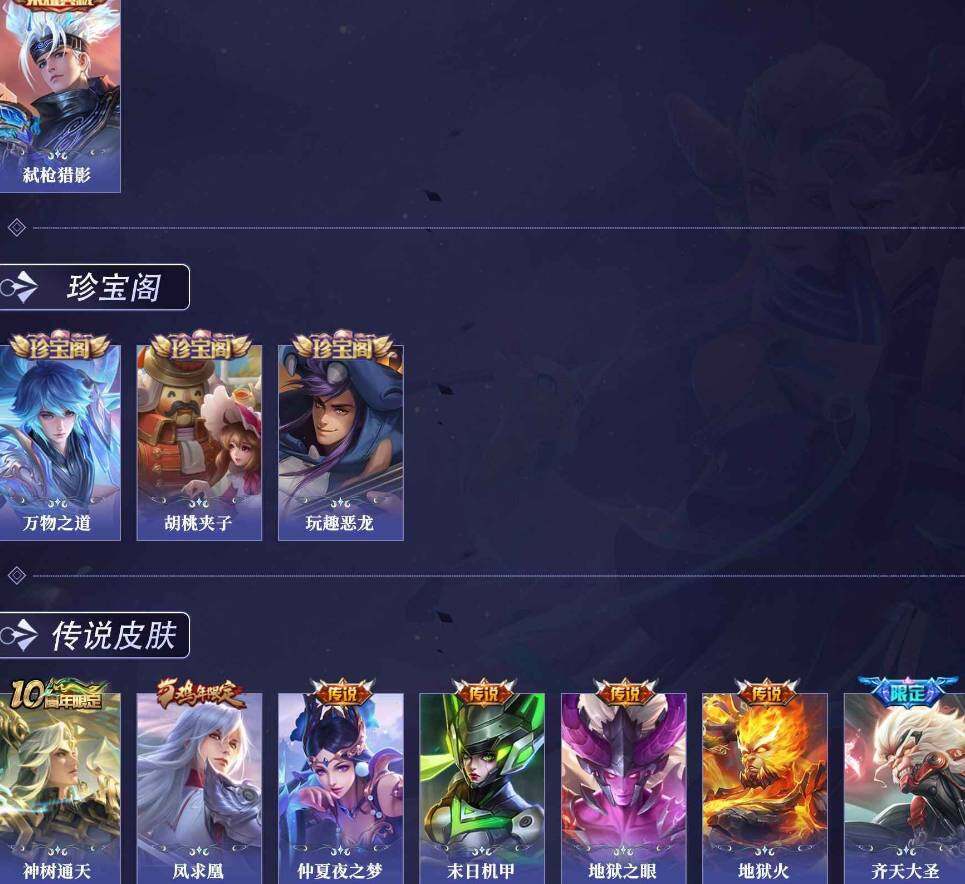 【传说皮肤】:后羿神树通天,孙悟空齐天大圣,李信一念神魔,貂蝉仲夏夜之梦,李白凤求凰,孙尚香末日机甲,宫本武藏地狱之眼,孙悟空地狱火