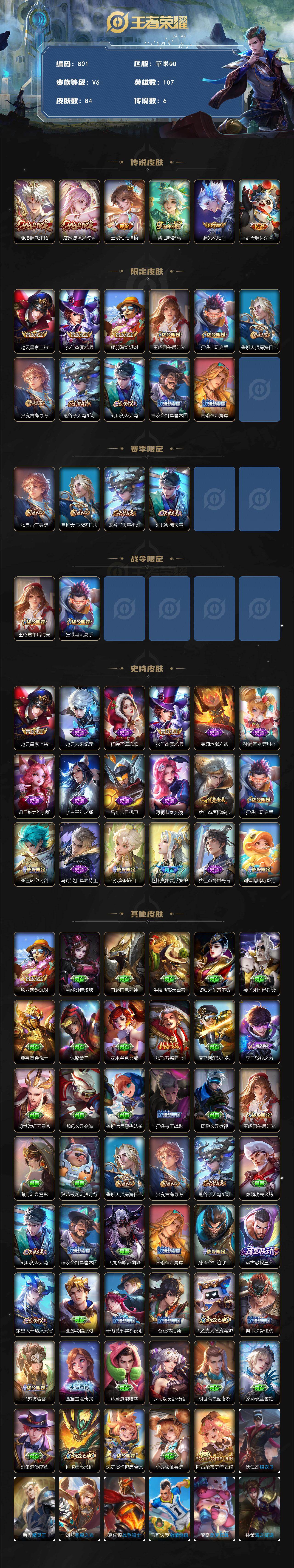 营地账号:/1939759苹果Q-V6-尊贵铂金IV段位-107英雄-84皮肤-6传说-18史诗