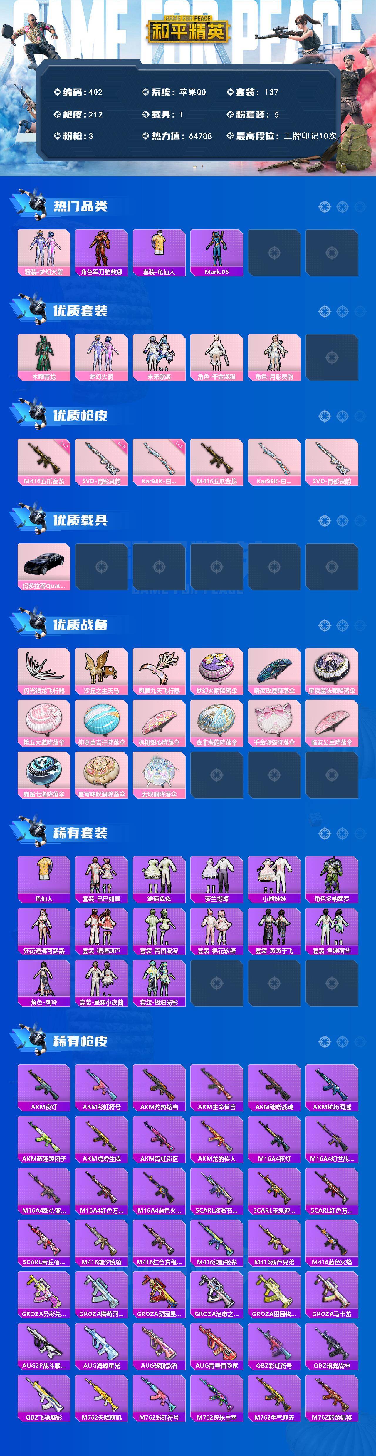 苹果 手Q-5粉装-3特效枪-1载具-3粉色飞行器-64788热力值-10王牌印记-137套装-212枪皮