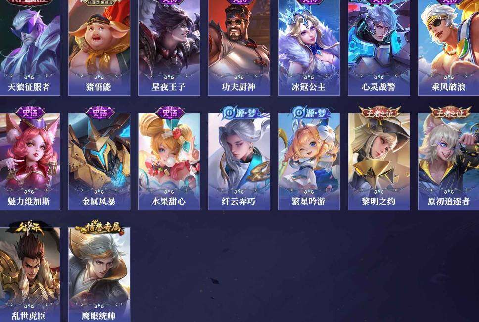 【限定皮肤】:狄仁杰阴阳师,赵云皇家上将,高渐离死亡摇滚,夏侯惇朔风刀,曹操天狼征服者,典韦岱宗,狄仁杰万华元夜,达摩沙漠行僧,项羽海滩派对,老夫子醍醐杖,程咬金演武夺筹,兰陵王金庭之子,后羿如梦令,李元芳云中旅人,钟馗驱傩正仪,雅典娜