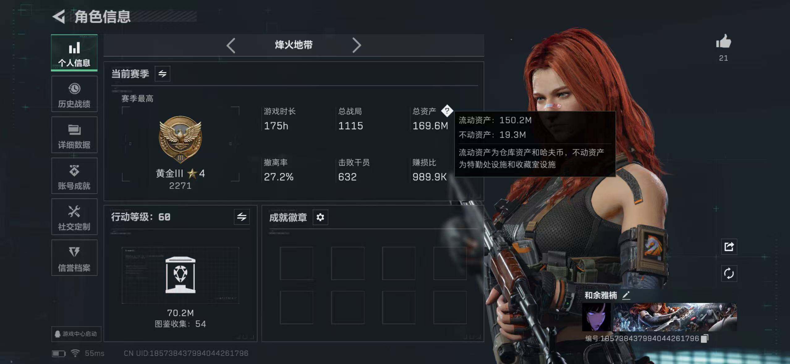 【SJ804】168m总资产-1615k哈伏币-60烽火等级-黄金-1战场等级-无军衔