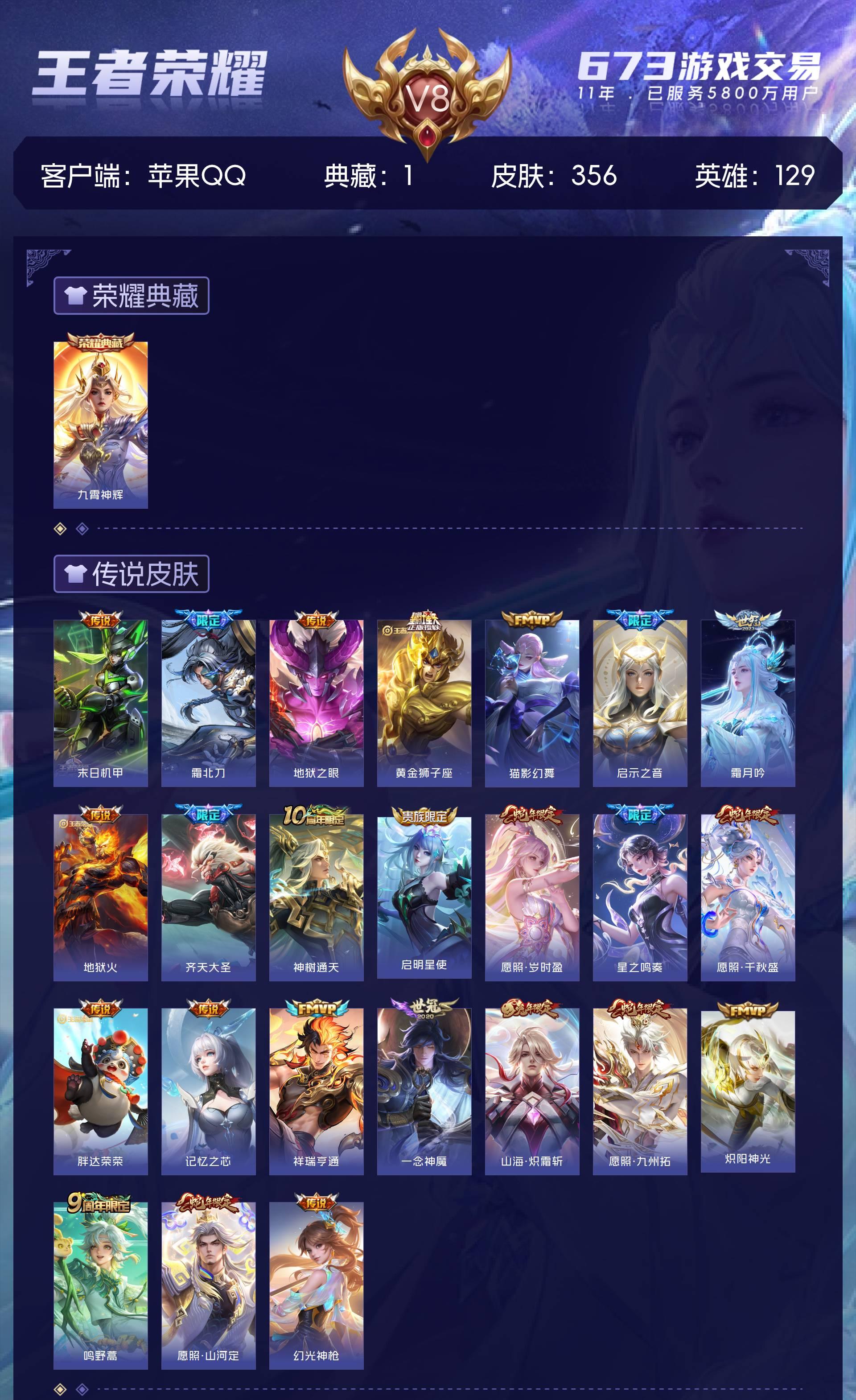V8 皮肤356 英雄129 传奇王者 荣耀典藏1 星传说4 传说24 其他皮肤337