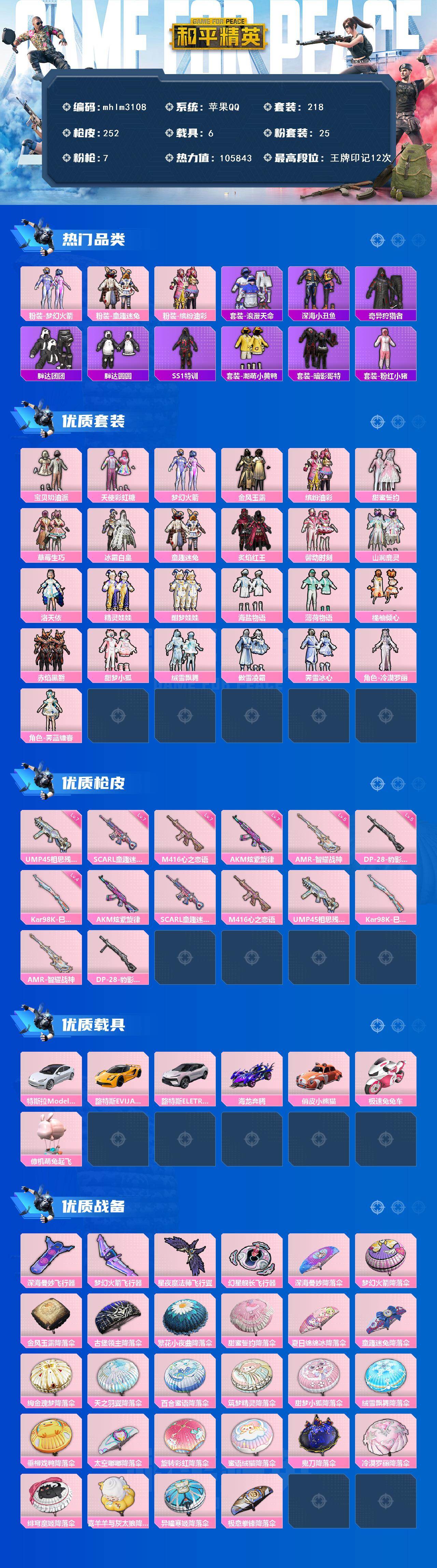 【mhlm3108】苹果 手Q-25粉装-7特效枪-6载具-5粉色飞行器-105843热力值-12王牌印记-218套装-252枪皮