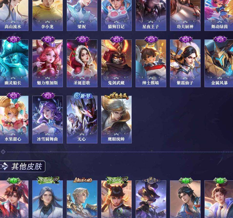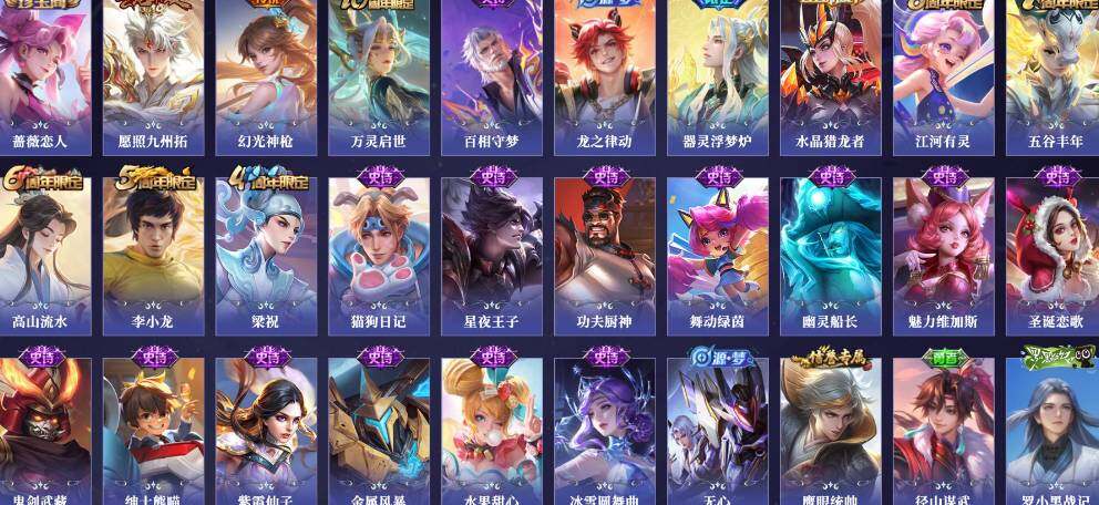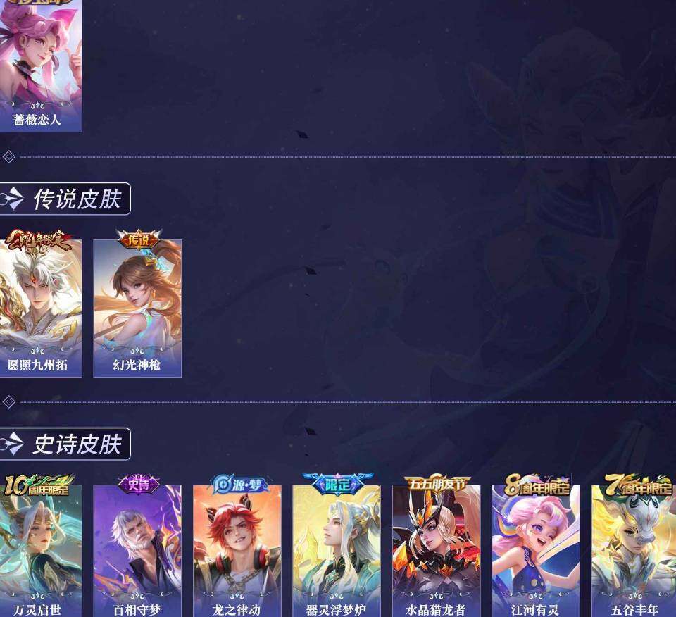 【限定皮肤】:杨戬破阵退雄兵,狄仁杰阴阳师,孙尚香蔷薇恋人,庄周高山流水,元歌无心,达摩沙漠行僧,项羽海滩派对,老夫子醍醐杖,兰陵王金庭之子,李元芳云中旅人,钟馗驱傩正仪,鬼谷子五谷丰年,苏烈千军破阵,弈星混