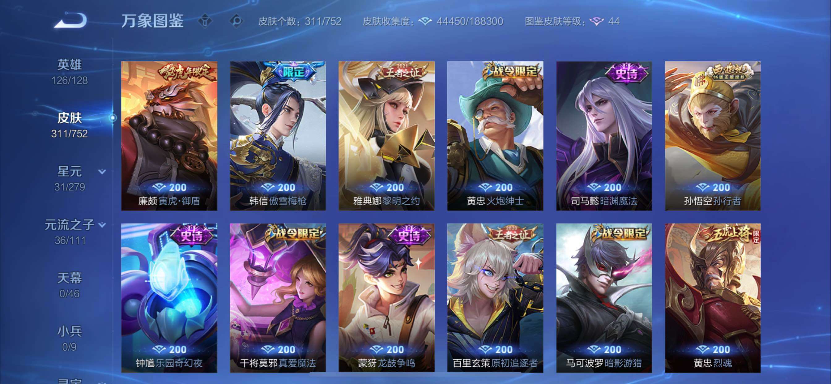 可换绑【性价比优质打野射手号 猴子典藏 傲雪梅枪 韩信飞衡 朱雀志 青龙志 多传说限定质量号】 幸运值268 12按键,1星传说,14王者印记,五级铭文80,可二次KK7546,苹果Q-V8-311皮肤-1典藏皮肤-22传说-92史诗【荣耀典藏】:孙悟空全息碎影【星元皮肤】:宫本武藏幽冥之眼【传说皮肤】:澜愿照九州拓,桑启鸣野蒿,铠冥王哈迪斯,澜逐花归海,李信山海