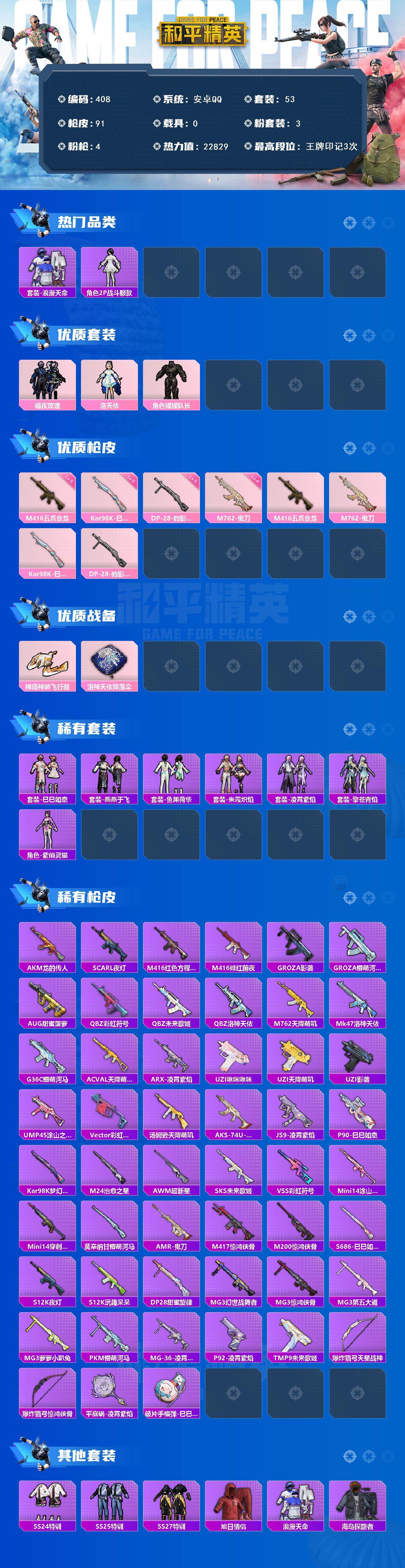 安卓 手Q-3粉装-4特效枪-0载具-2粉色飞行器-22829热力值-3王牌印记-53套装-91枪皮