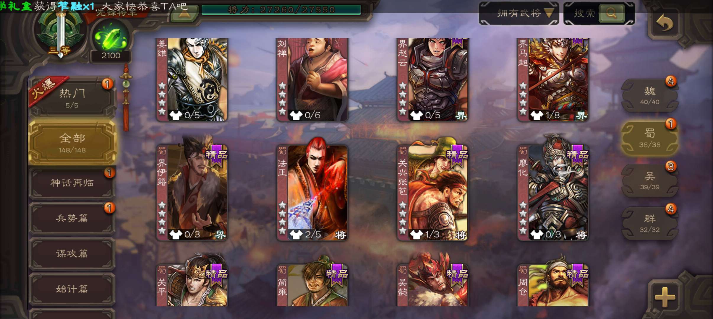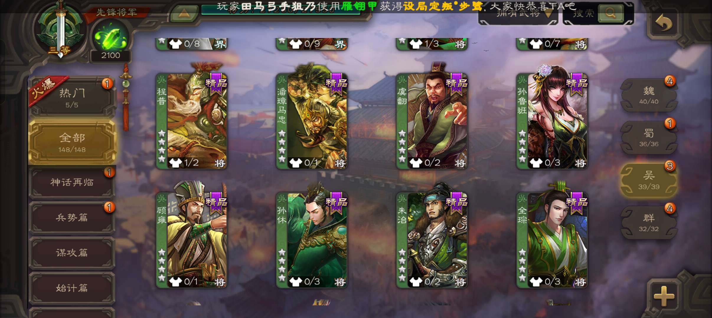 4史诗先锋,6万豆2100将魂,回廊动白马界钟会神刘备谯周,甘夫人界吕布势田丰界满宠张布148将