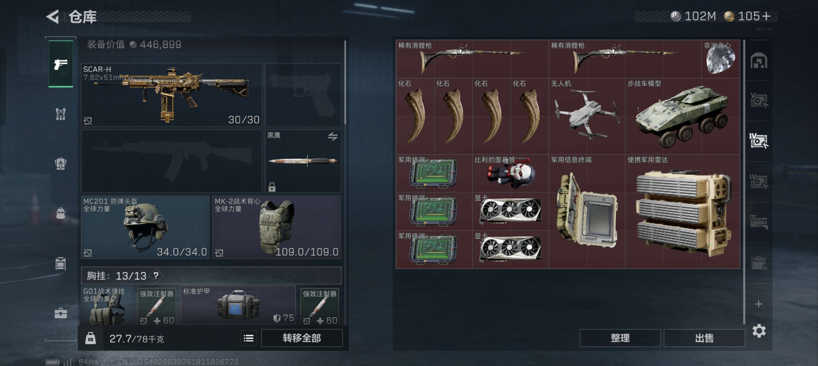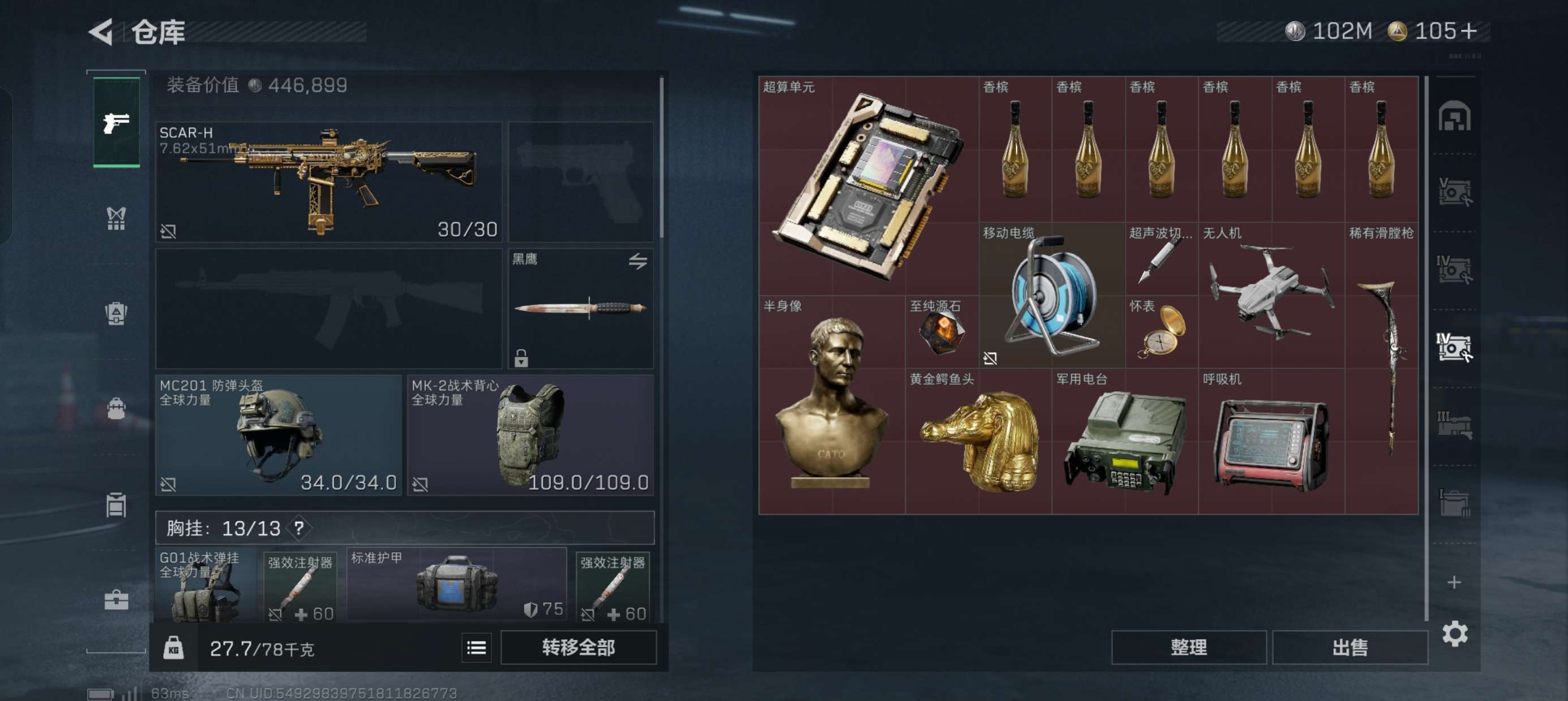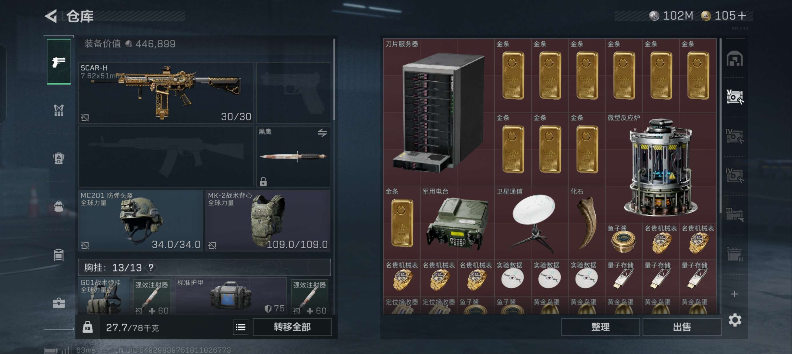 三角洲总资产280M,现金112M,体力满级仓库8级,30发aw子弹,保险6格,第一次卖号低价出售有
