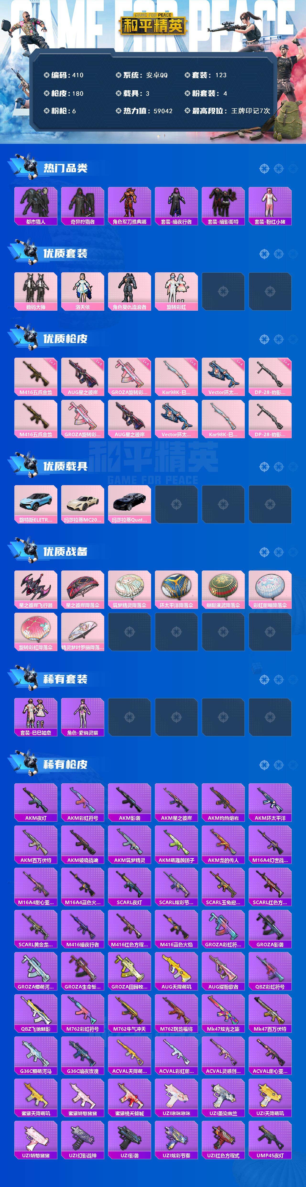 安卓 手Q-4粉装-6特效枪-3载具-1粉色飞行器-59042热力值-7王牌印记-123套装-180枪皮