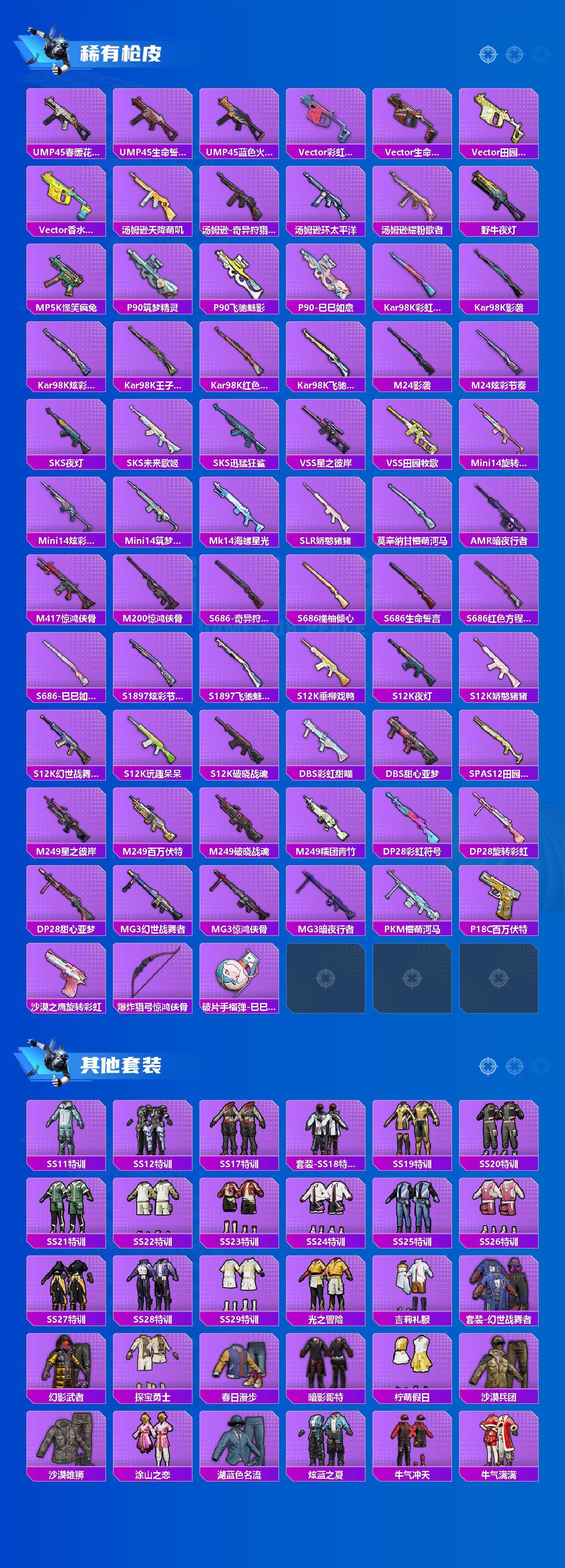 【粉色枪皮等级】:M416-五爪金龙(七级),GROZA-旋转彩虹(五级),AUG-星之彼岸(五级)