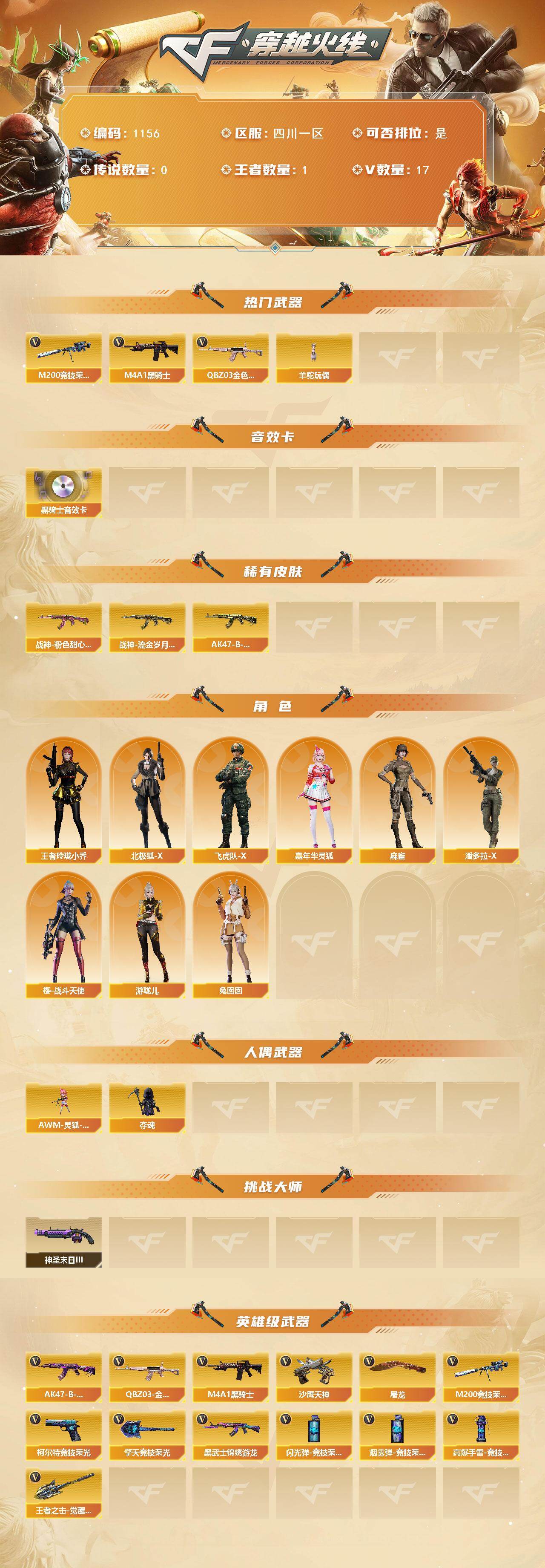 四川一区-17V-1王者-0炫金【热门武器】:QBZ03-金色蔷薇,M200