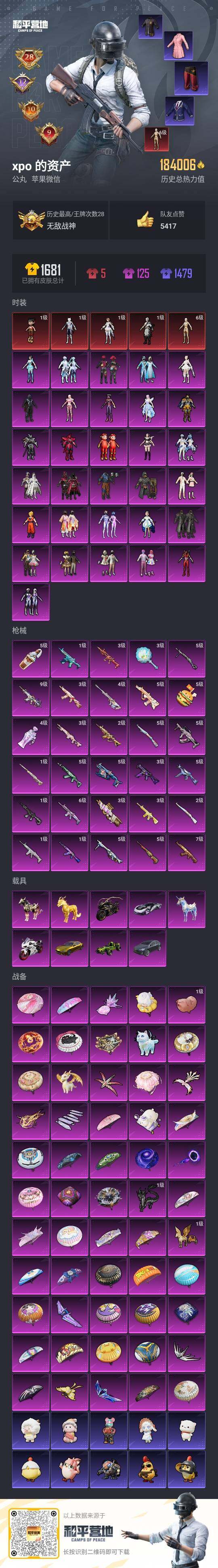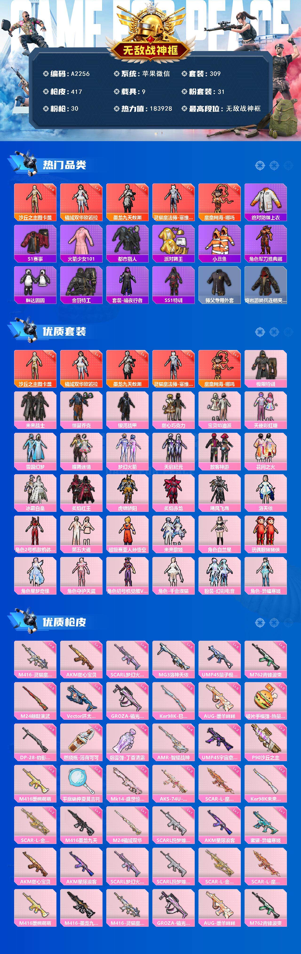 【A2256】苹果 微信-无敌战神框-5神装-31粉装-30特效枪-9载具-15粉色飞行器-183928热力值-28王牌印记-309套装-417枪皮