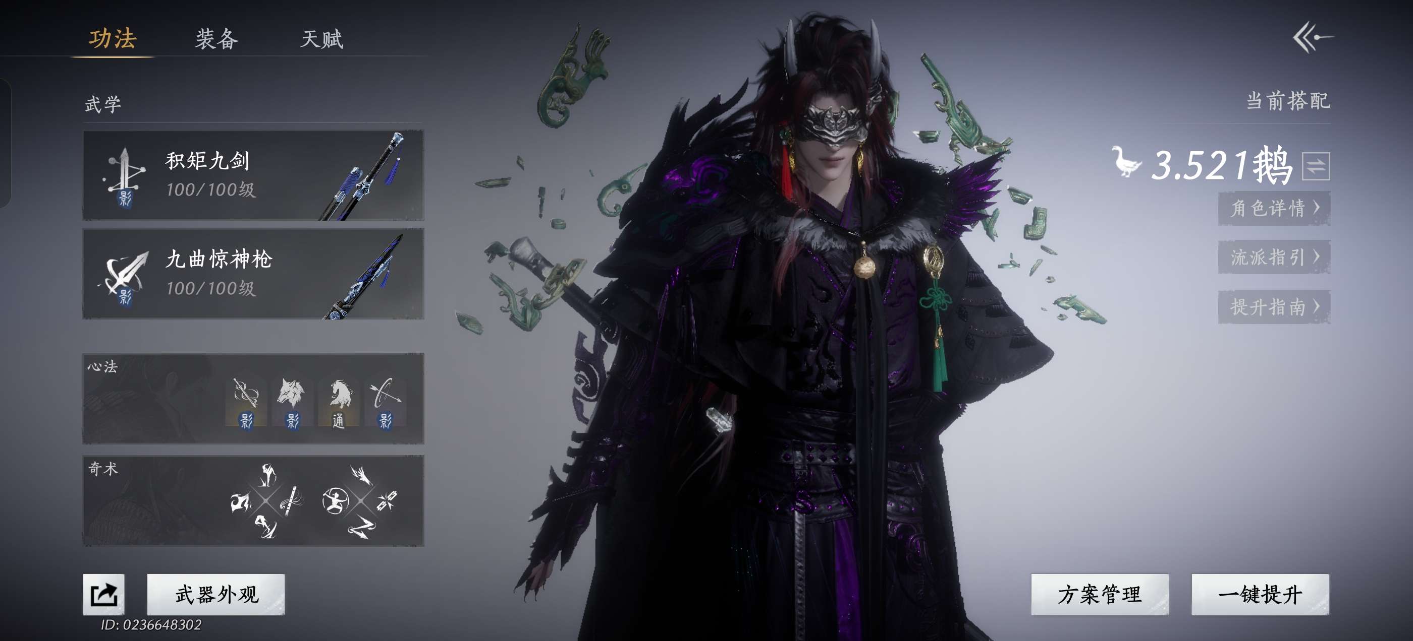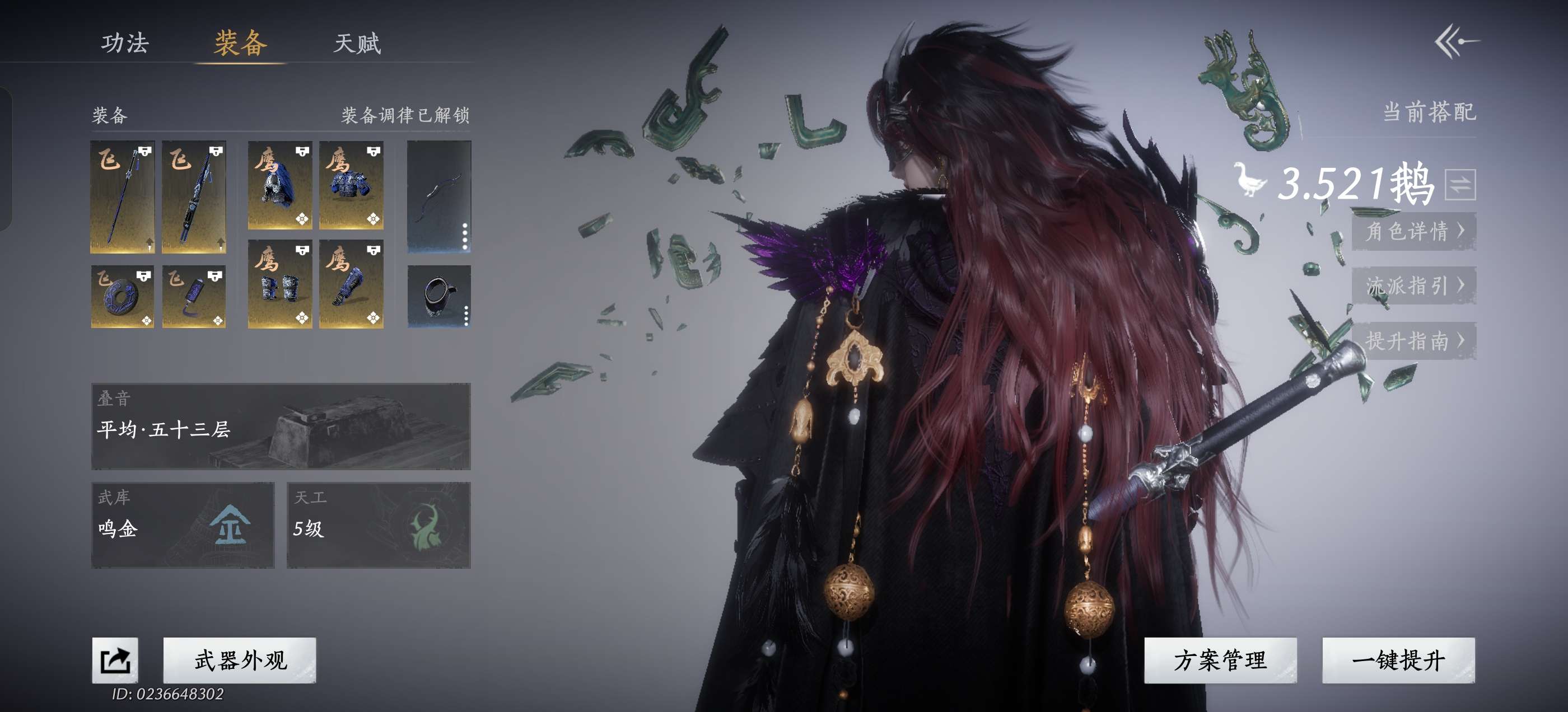 角色等级:100风华值:10994武林造诣:3.521鹅全部套装:葬花吟/晏平生/蓬山万重/江