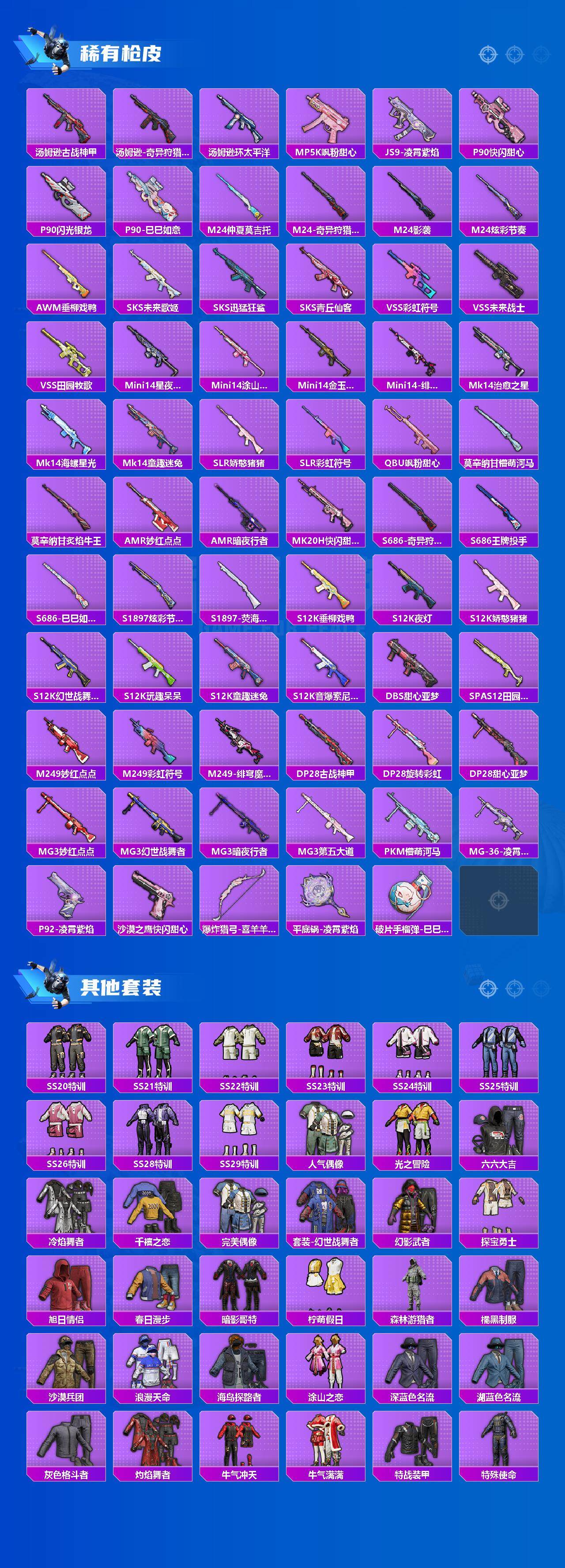 【粉色枪皮等级】:SCAR-L-童趣迷兔(七级),AUG-暖羊咩咩(五级),Kar98K-巳巳如意(五级),SPAS-12-音爆索尼克(七级),DP