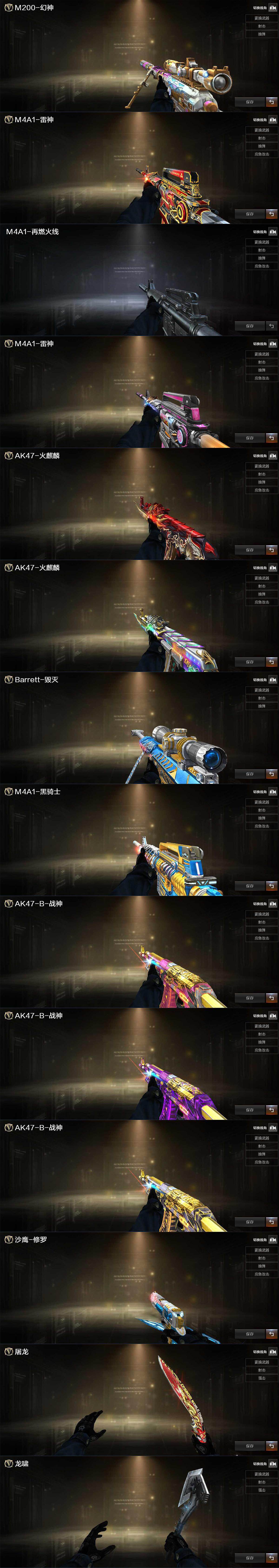 【皮肤】:幻神-动感闪耀 皮肤,雷神-荣耀世冠AG,M4A1-再燃火线,雷神-神秘按键 皮肤,火麒麟-平天大圣,火麒麟-巅峰荣耀,毁灭-冠军之怒