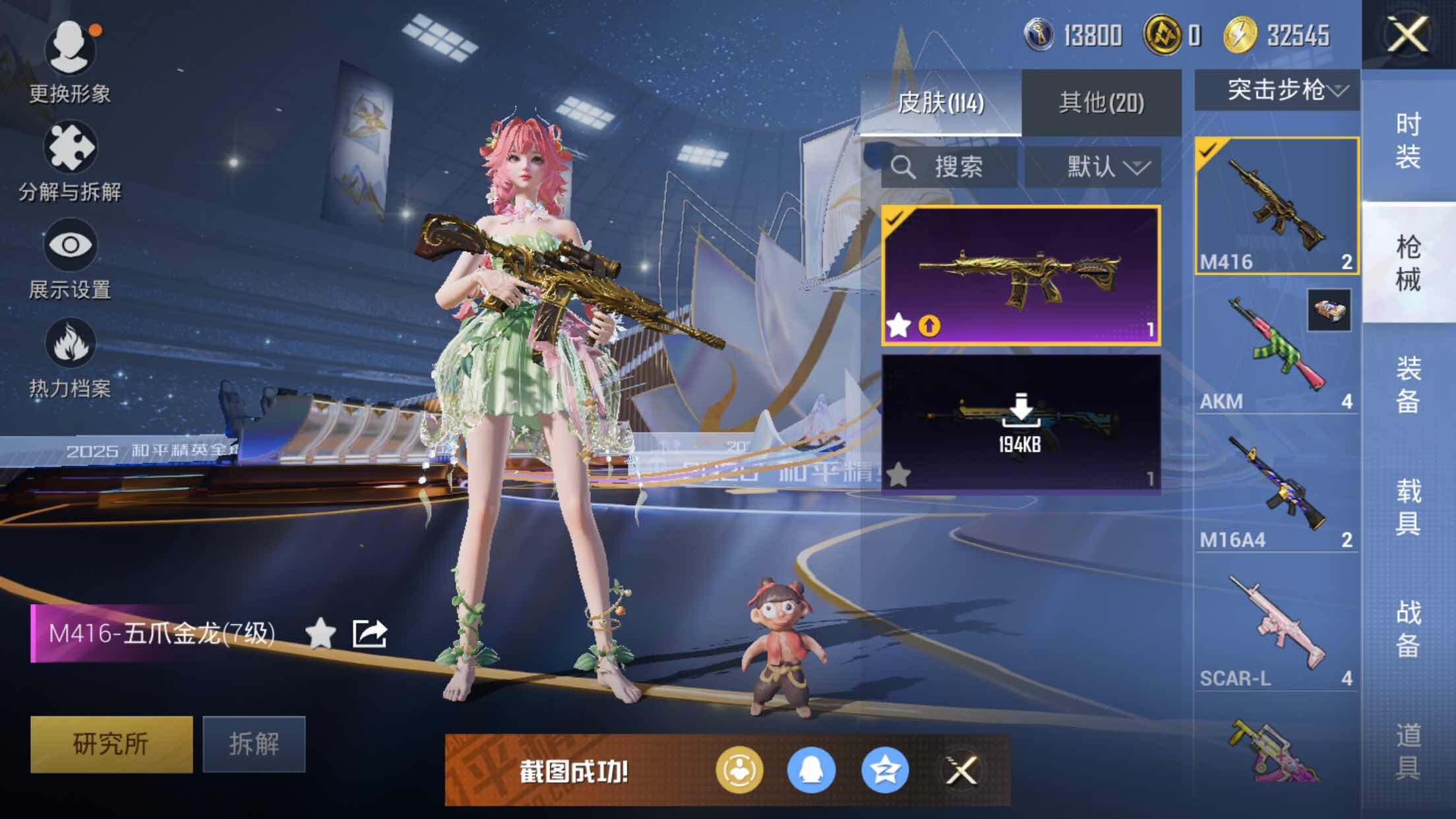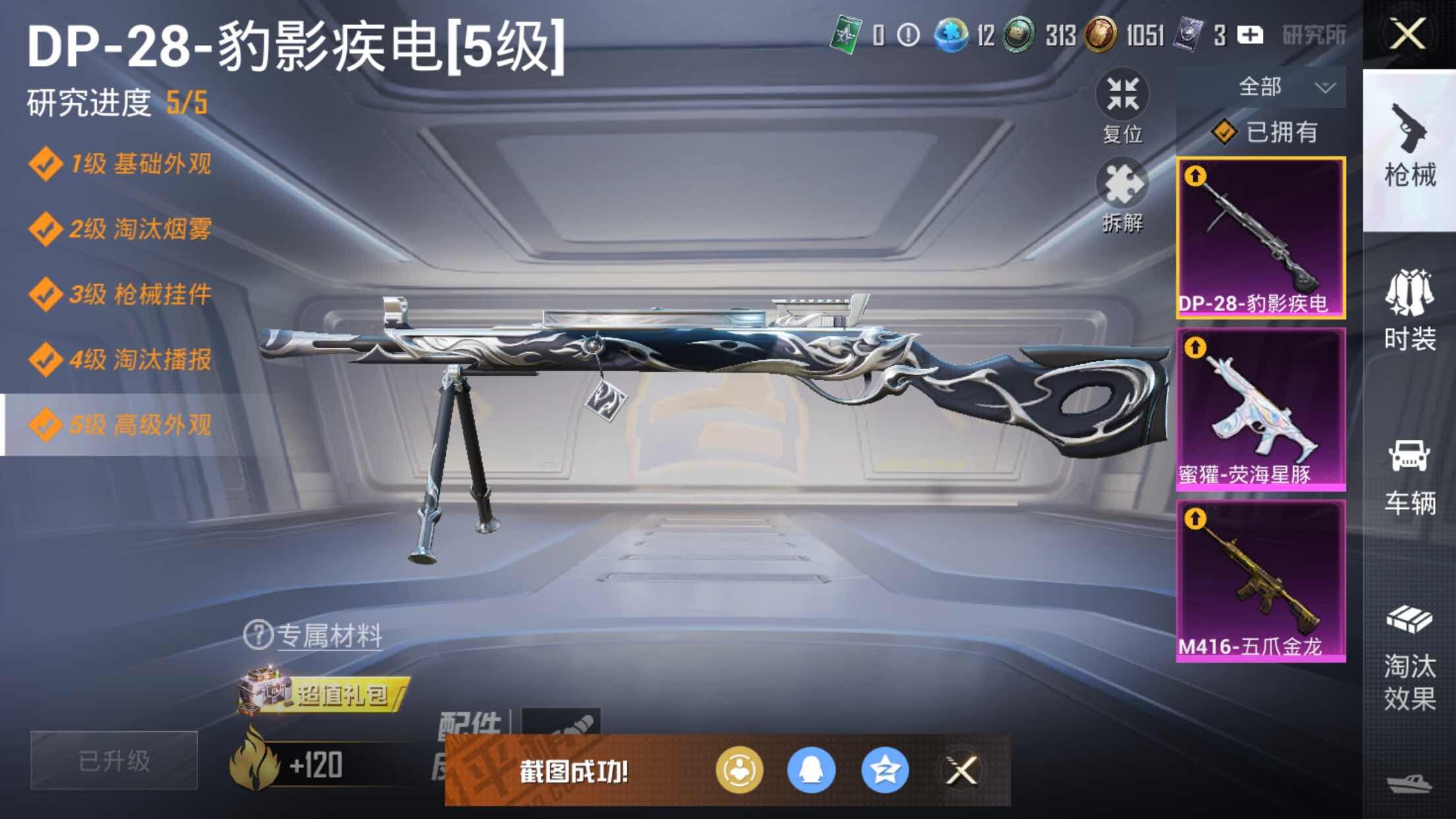 【粉色枪皮等级】:M416-五爪金龙(七级),蜜獾-荧海星豚(五级),DP-28-豹影疾电(五级)
